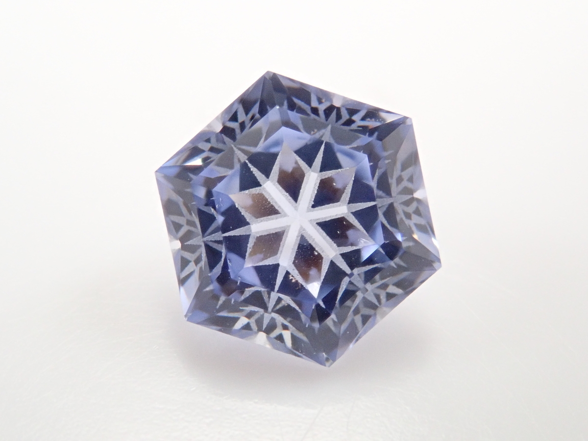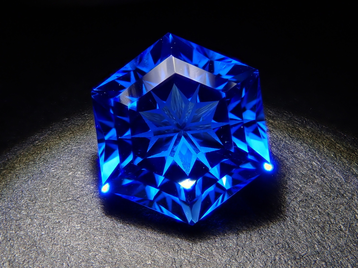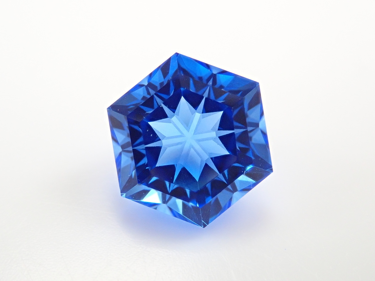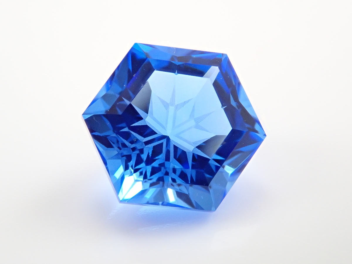 雪の結晶がルースの中に舞うゆきんこカット。シミズ貴石様による研磨で、鮮やかなブルーの合成サファイアとシベリアンブルークォーツに、繊細なカットが美しく映えます。