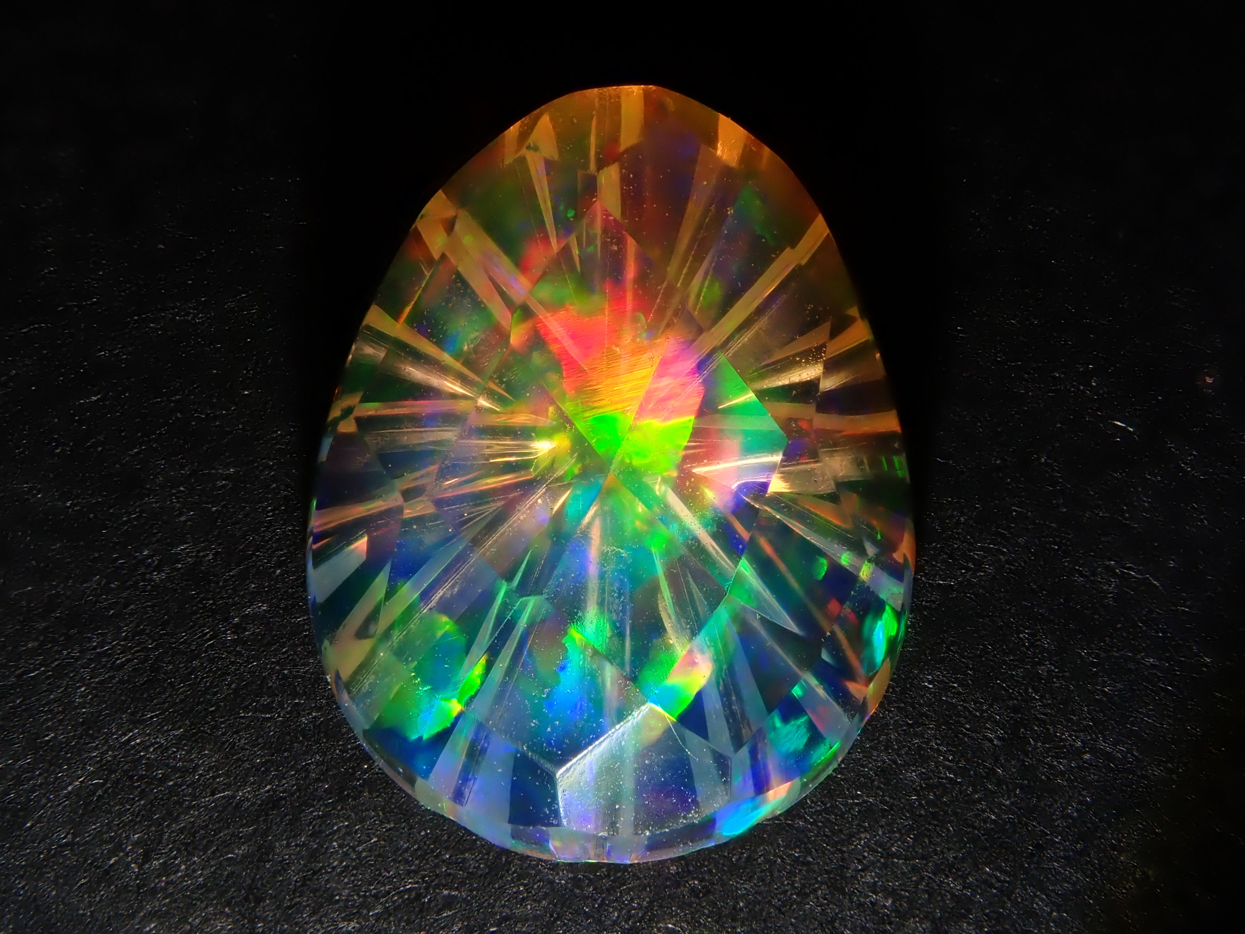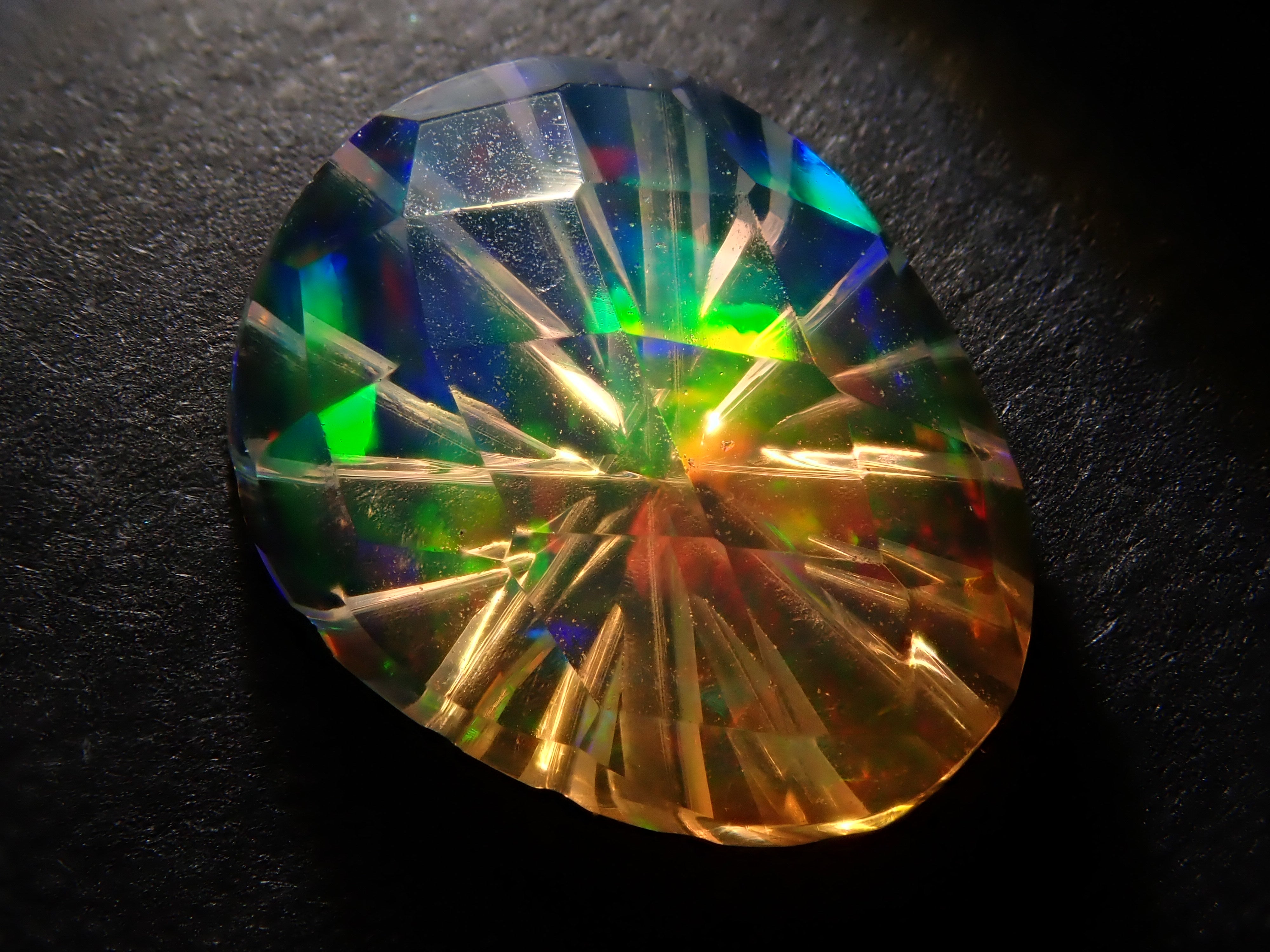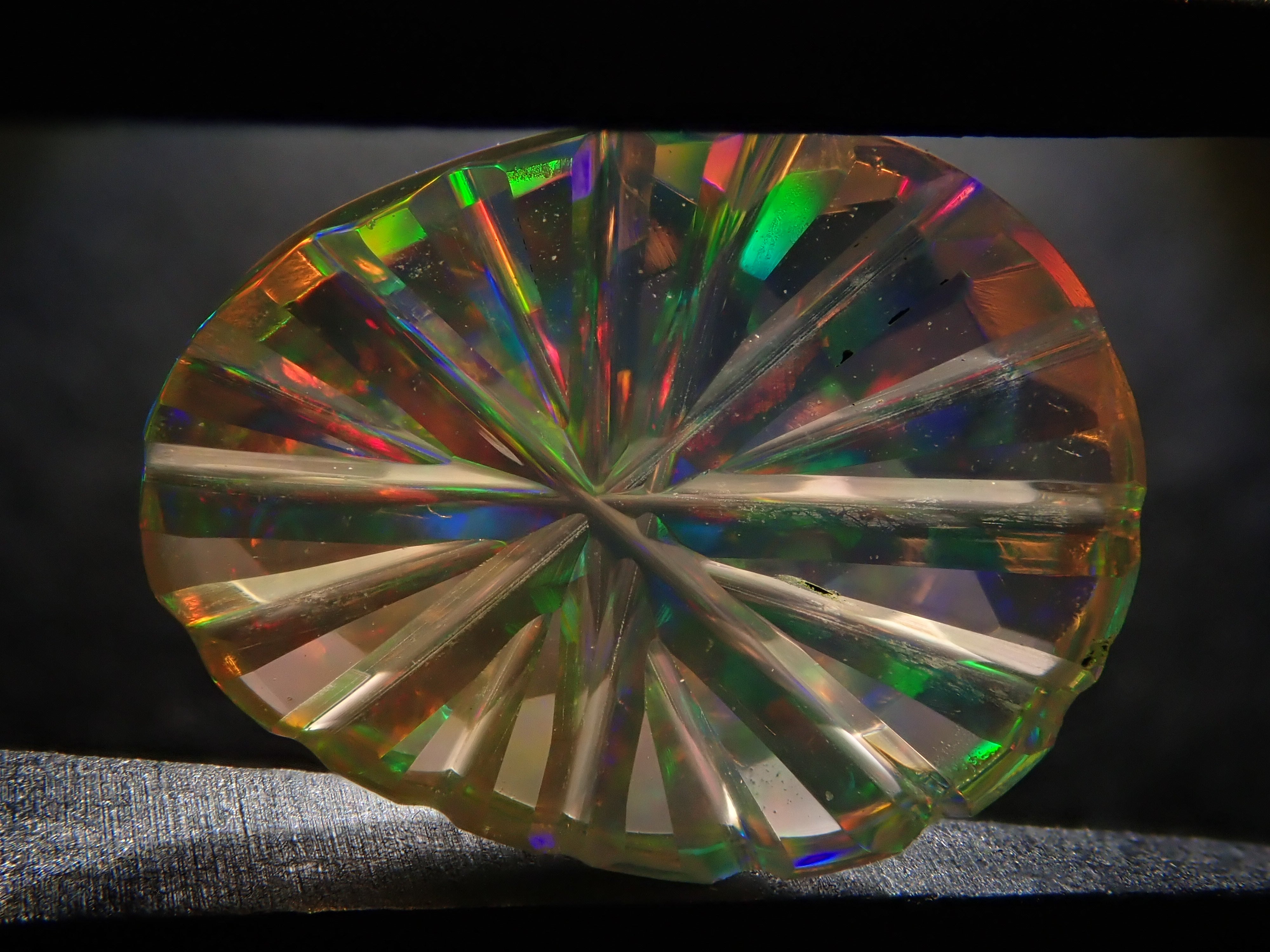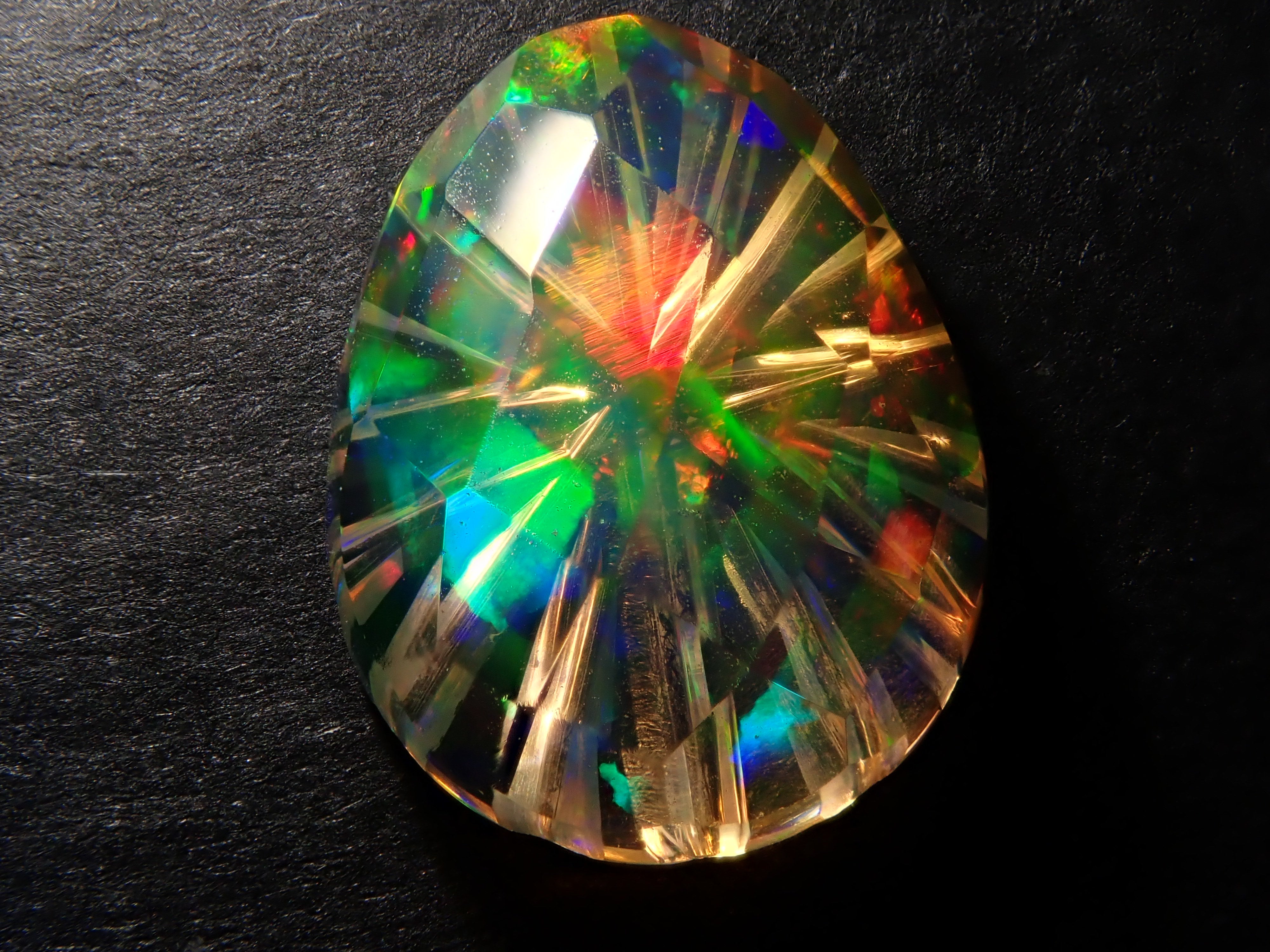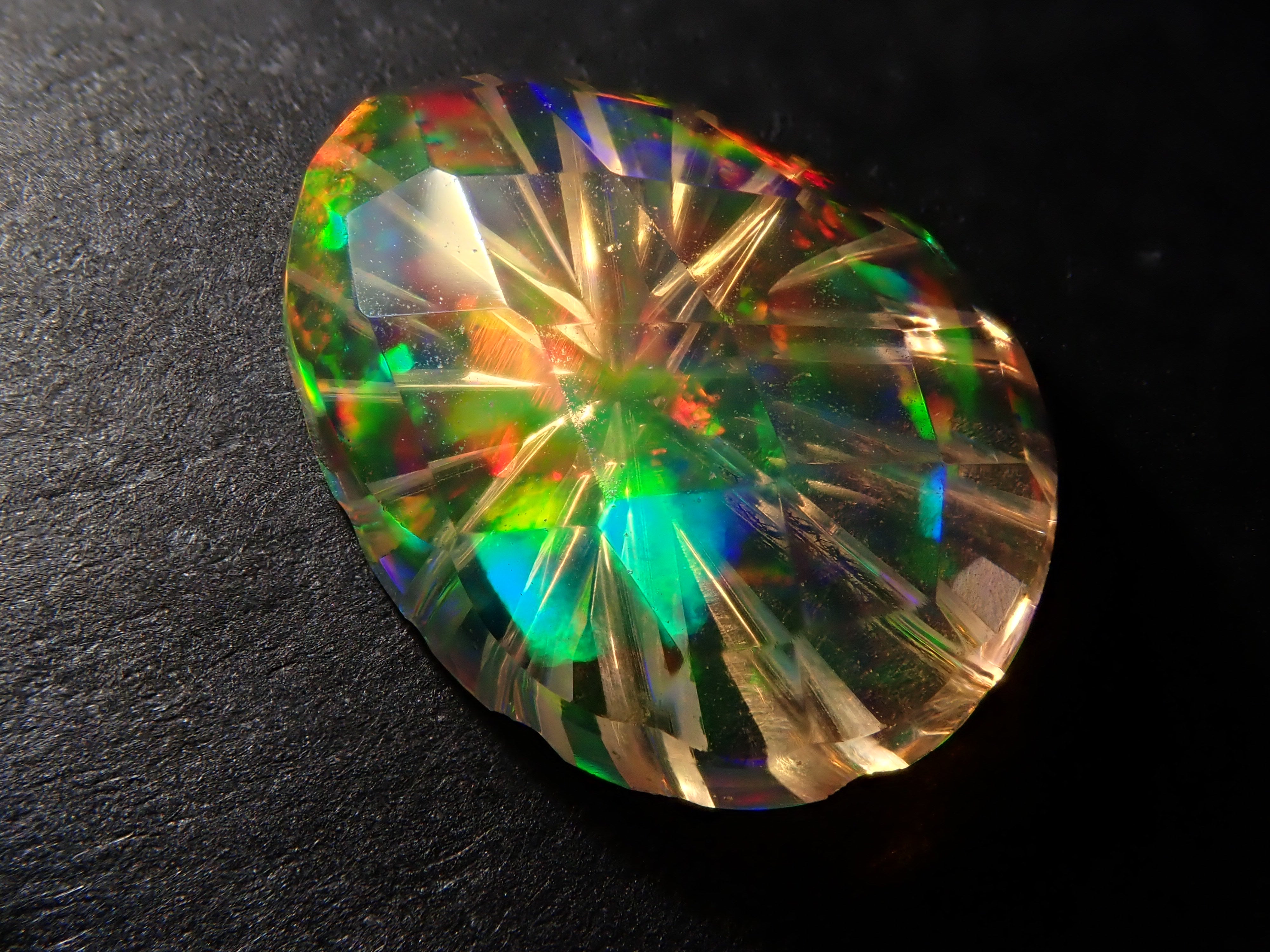 This is a Mexican fire opal "Checker x Subaru" made by Koshu Takaishi Kiriko, a collaboration between Shimizu Kiseki and Mr. Yoichi Fukasawa . Mr. Shimizu handles the facets and Mr. Fukasawa handles the facets.