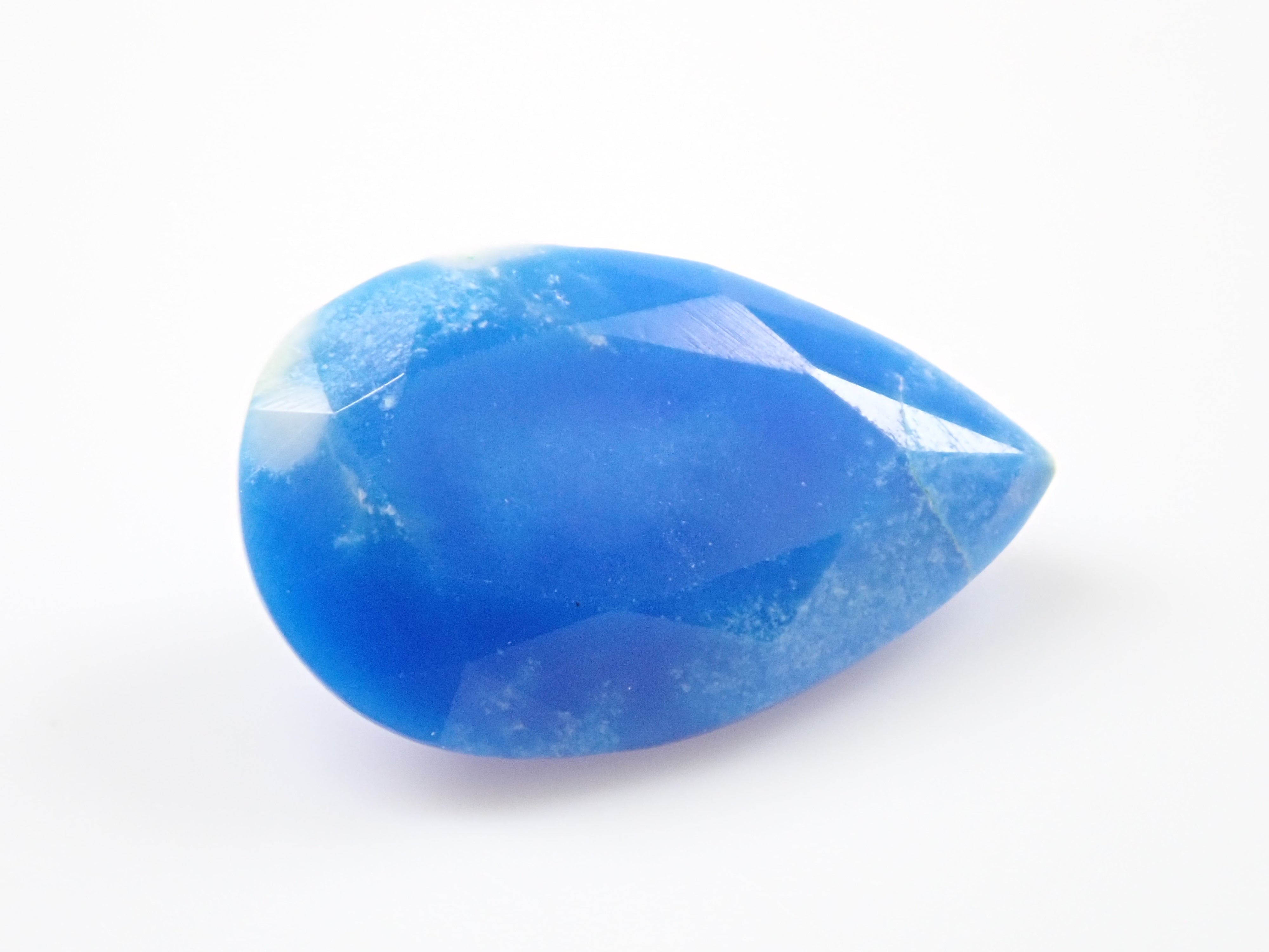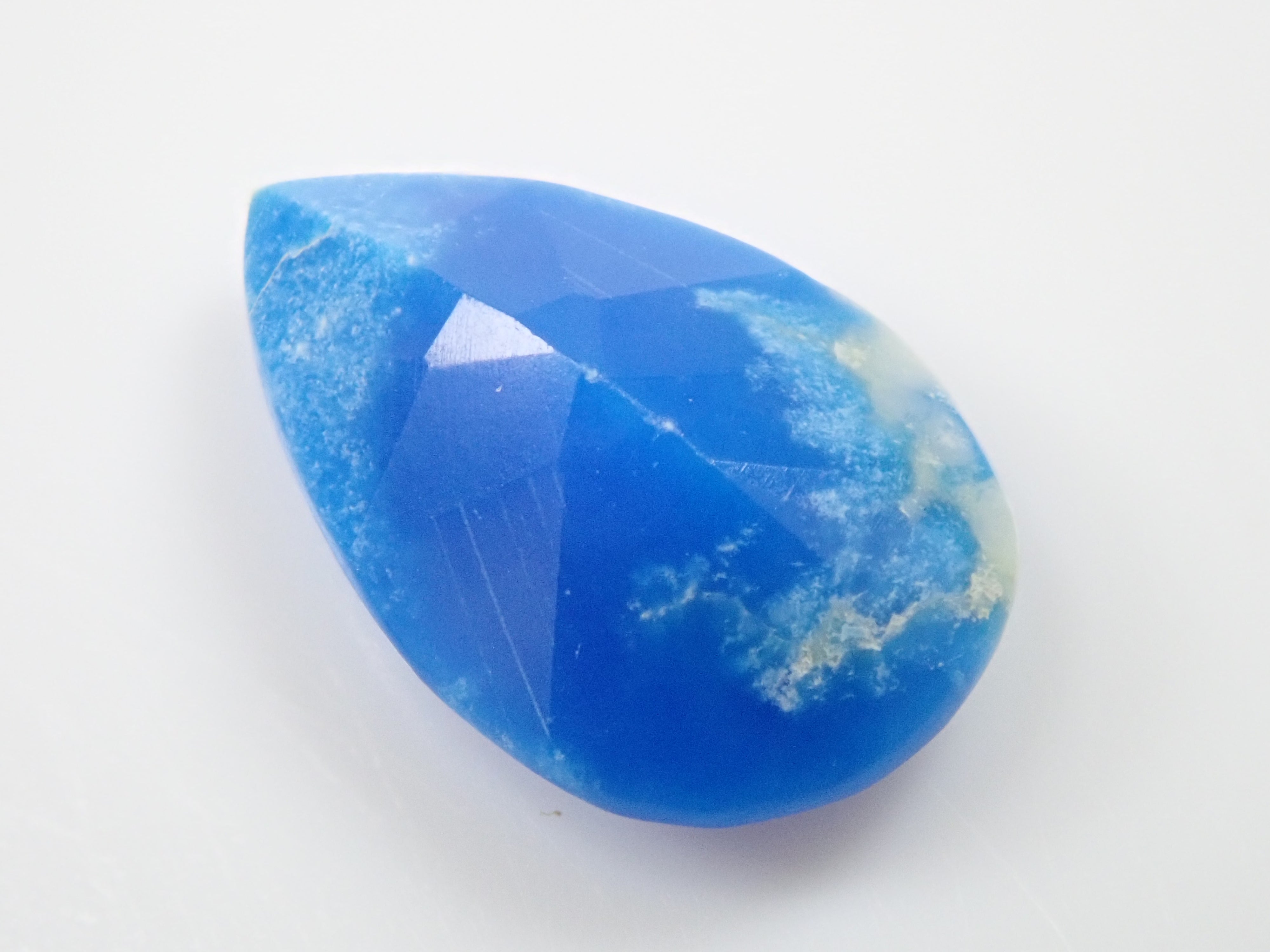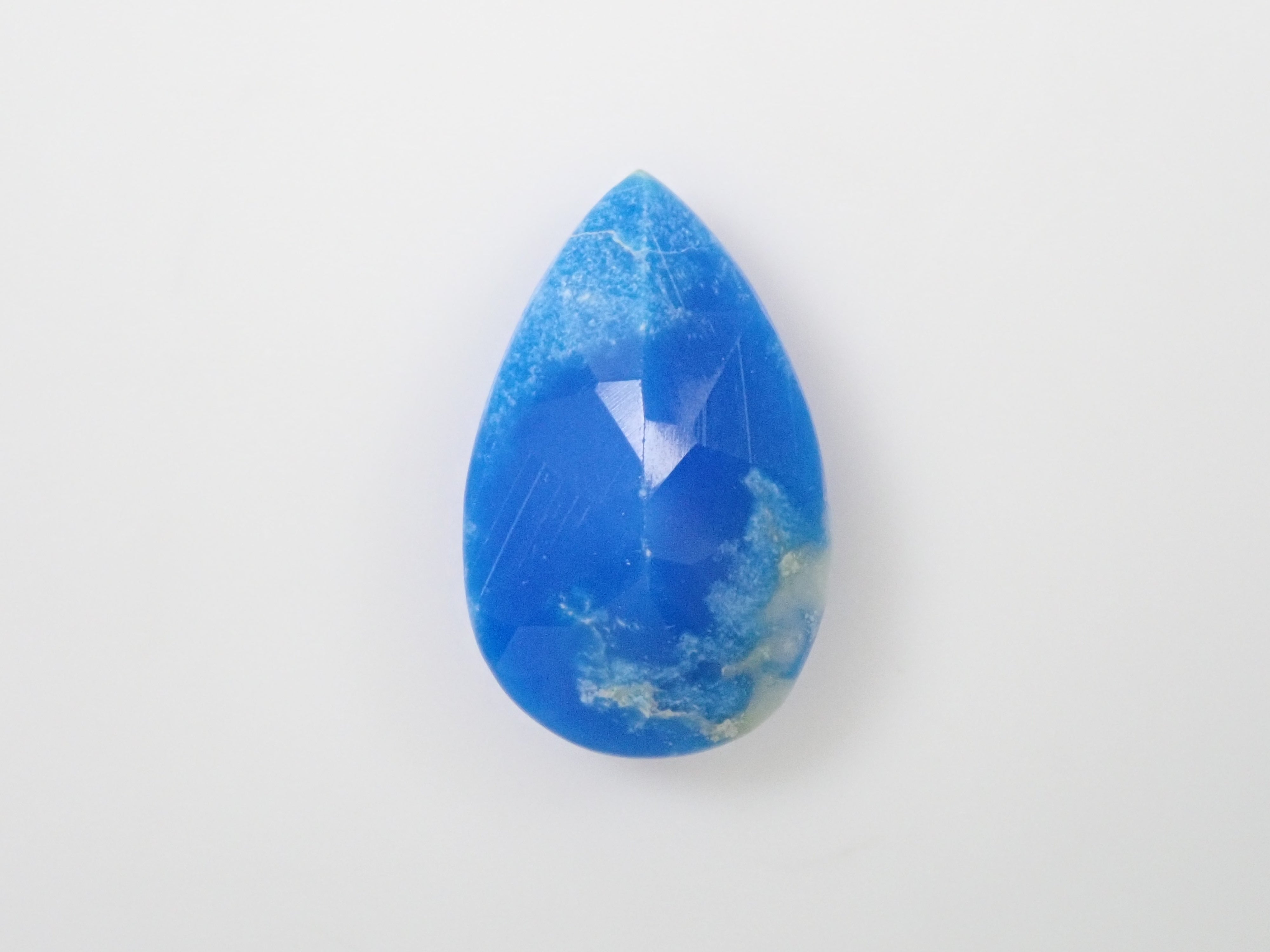 Ceruleite, a gemstone similar to turquoise, is called pseudoturquoise in Japanese. Discovered in 1976, it has a cerulean blue (sky blue) hue, and its name comes from the Latin word caeruleus, meaning sky blue. This is Ruth, which I bought in Tucson, USA in 2023. It is loose with a faceted cut, which is rare for Ceruleite. A certificate of identification from the Japan-German Gem Research Institute is included.