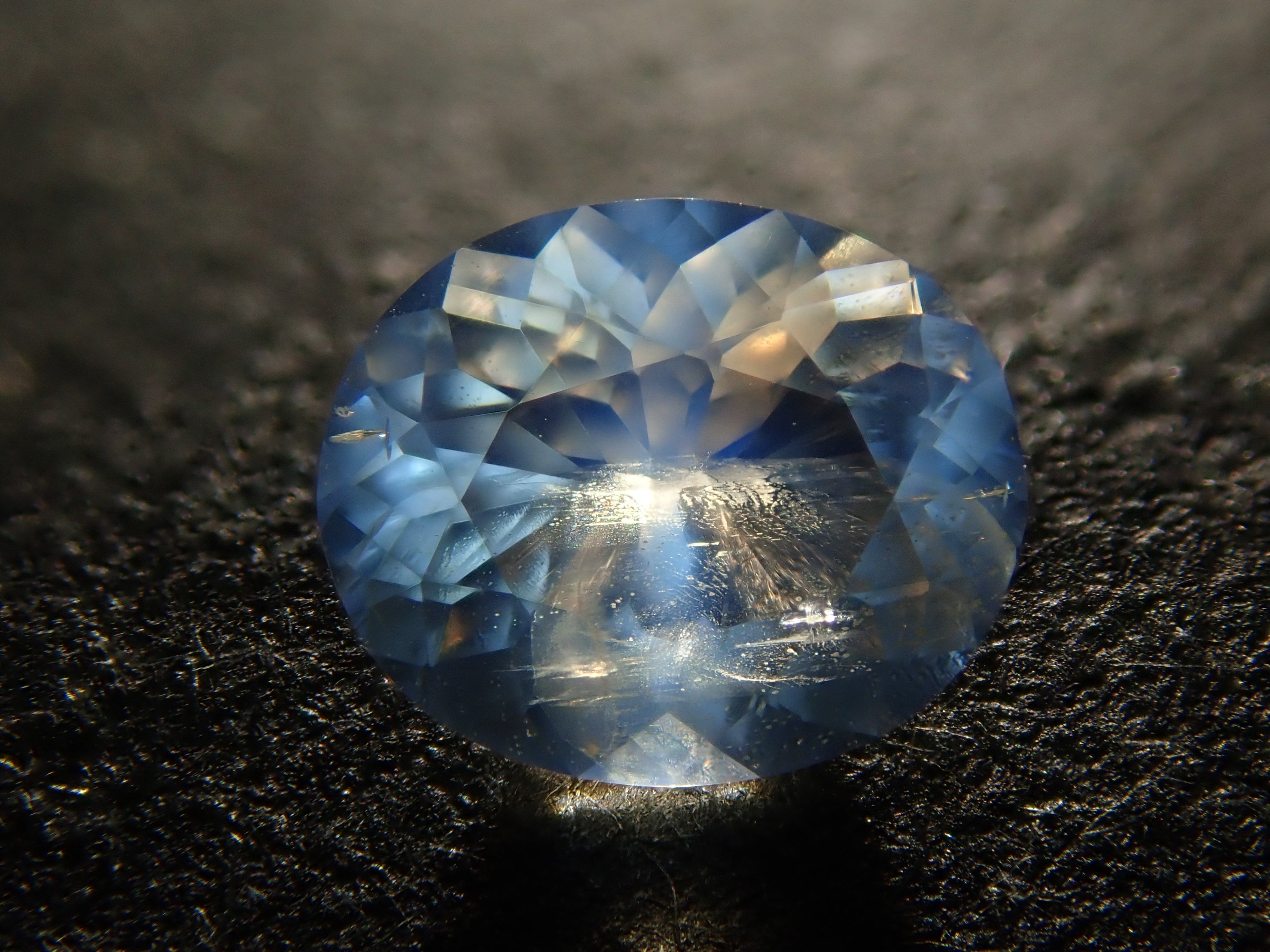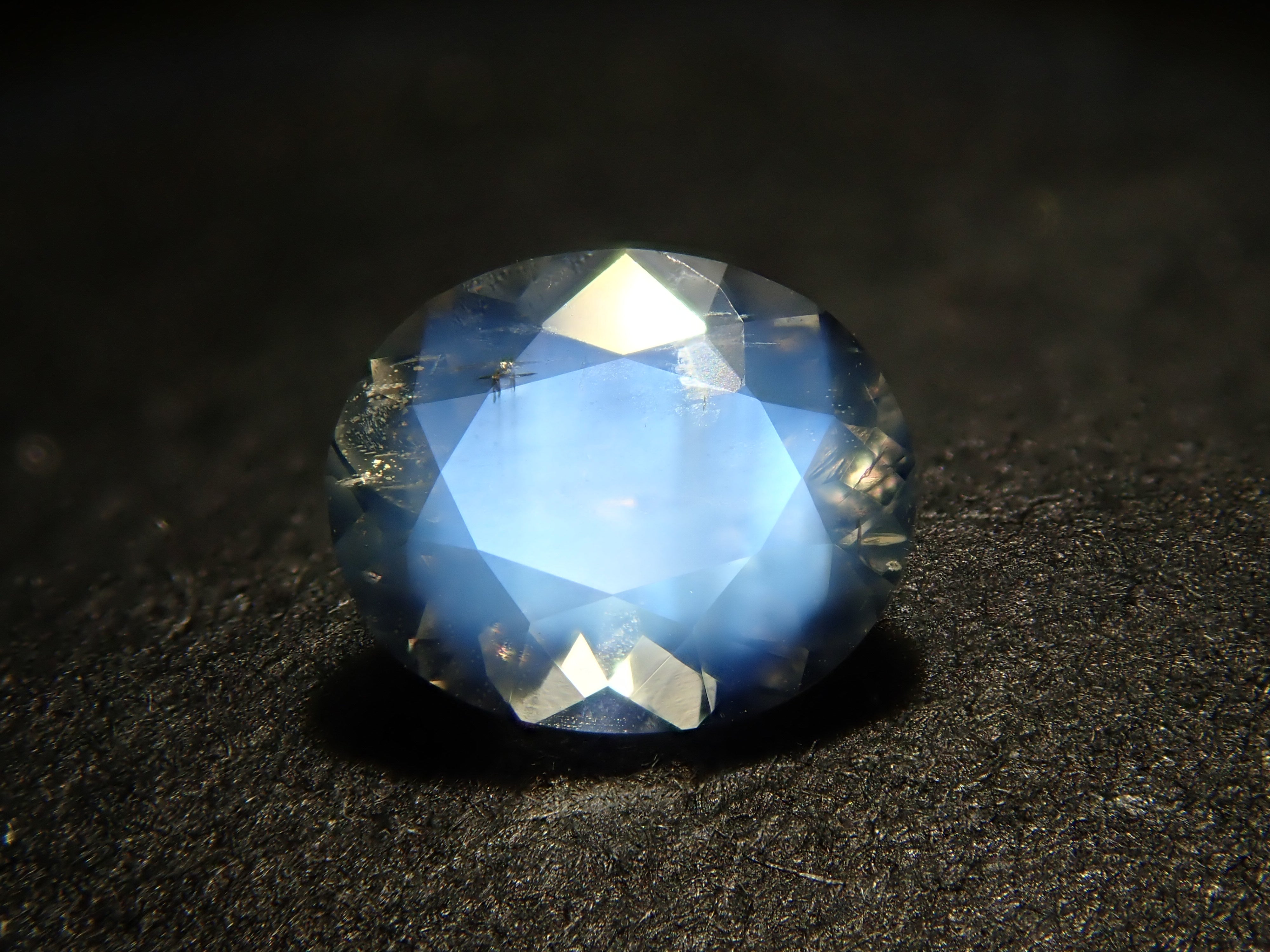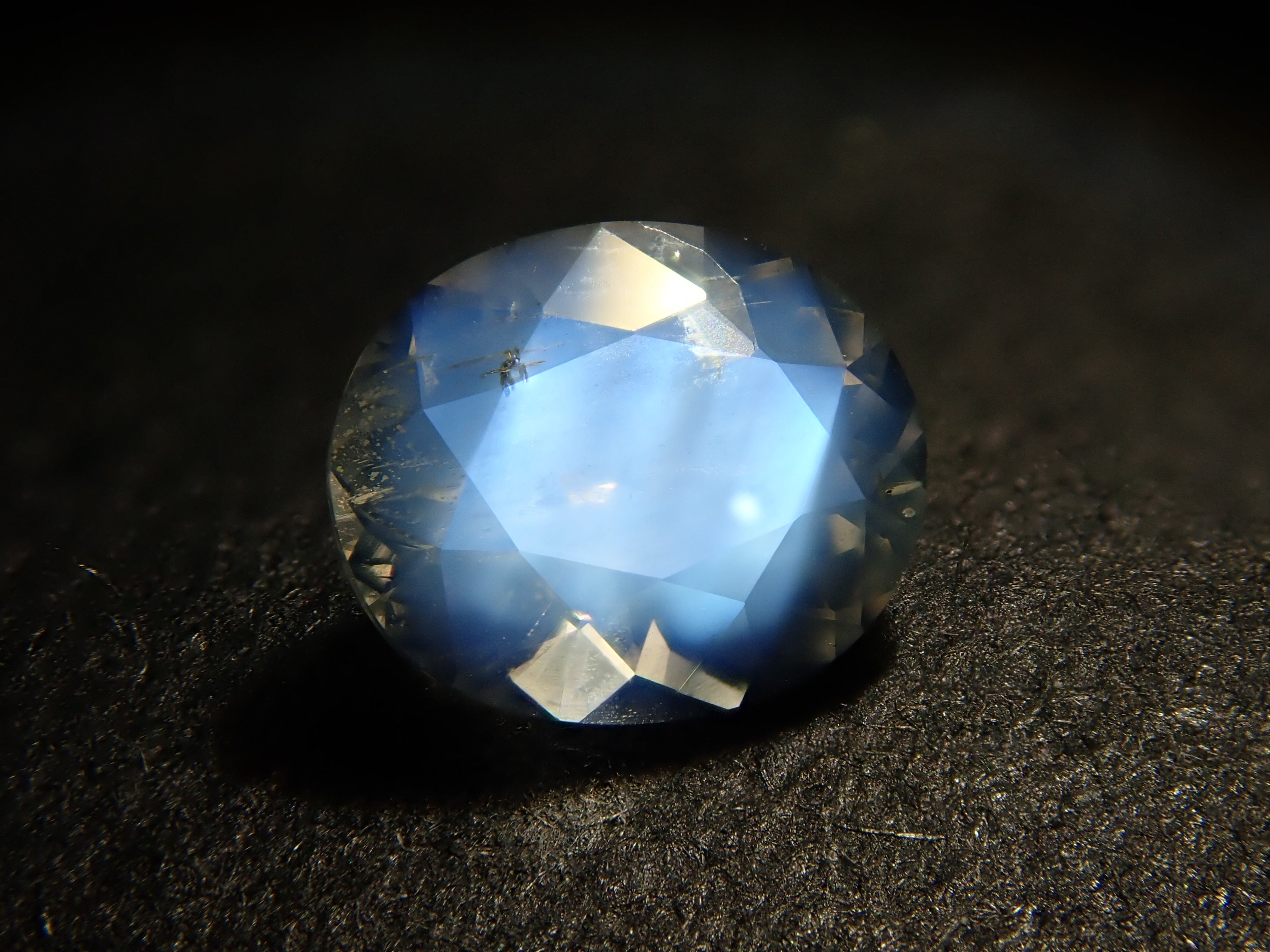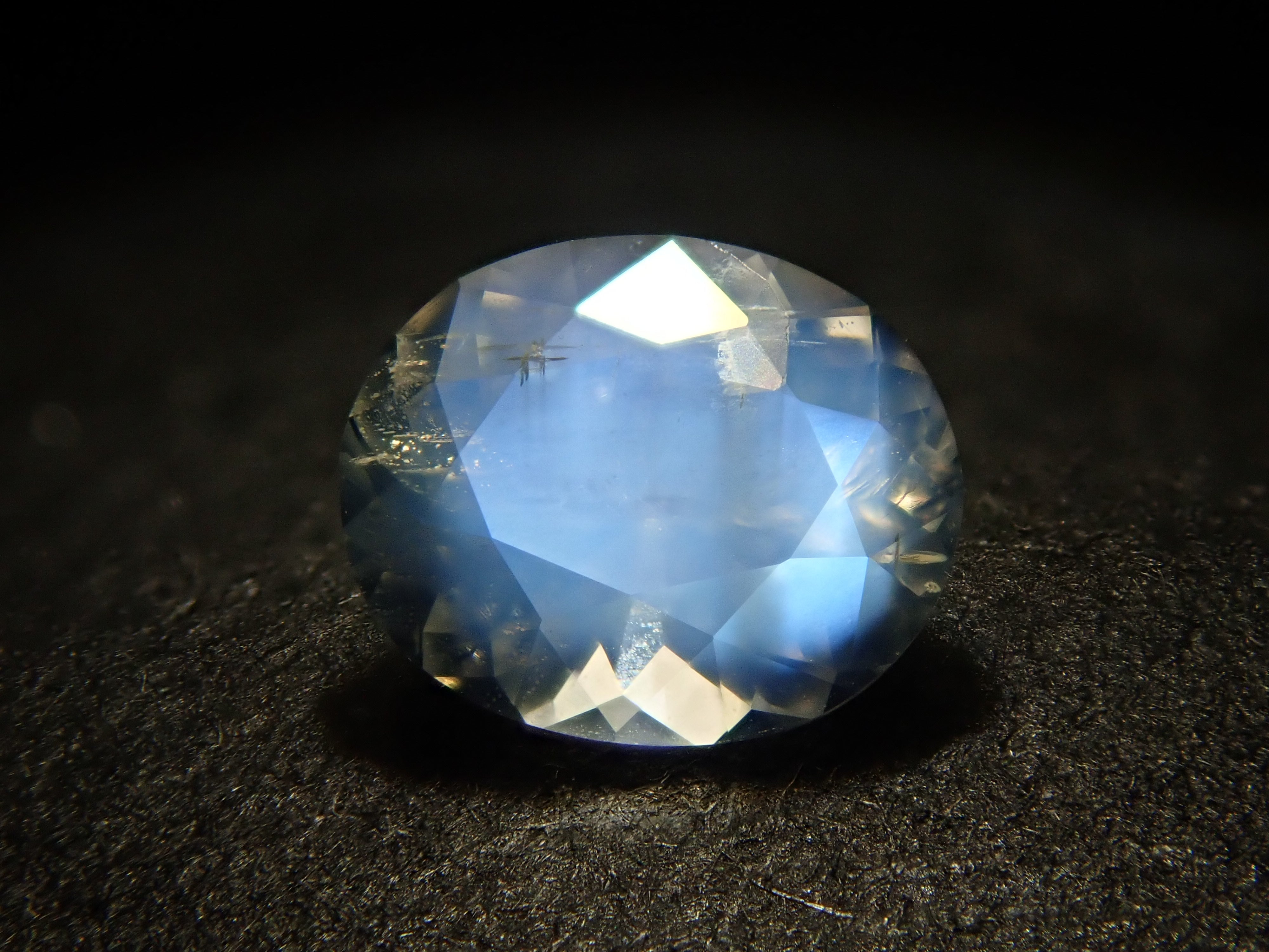 This moonstone looks like it has a spotlight shining in the center. This bright optical effect, similar to the glow of the moon, is a characteristic of moonstone. The photo was taken using a penlight. A genuine "blue moonstone."