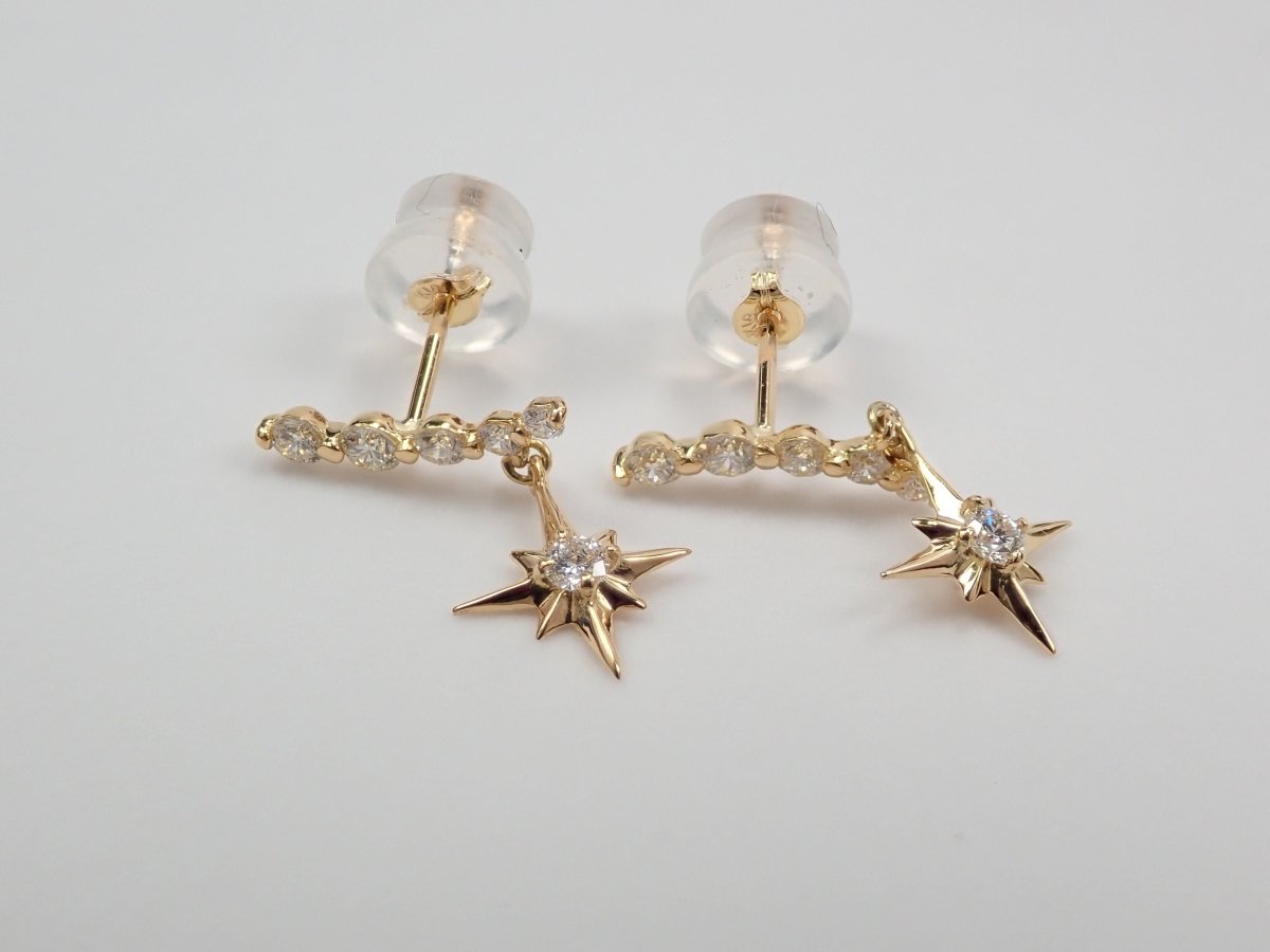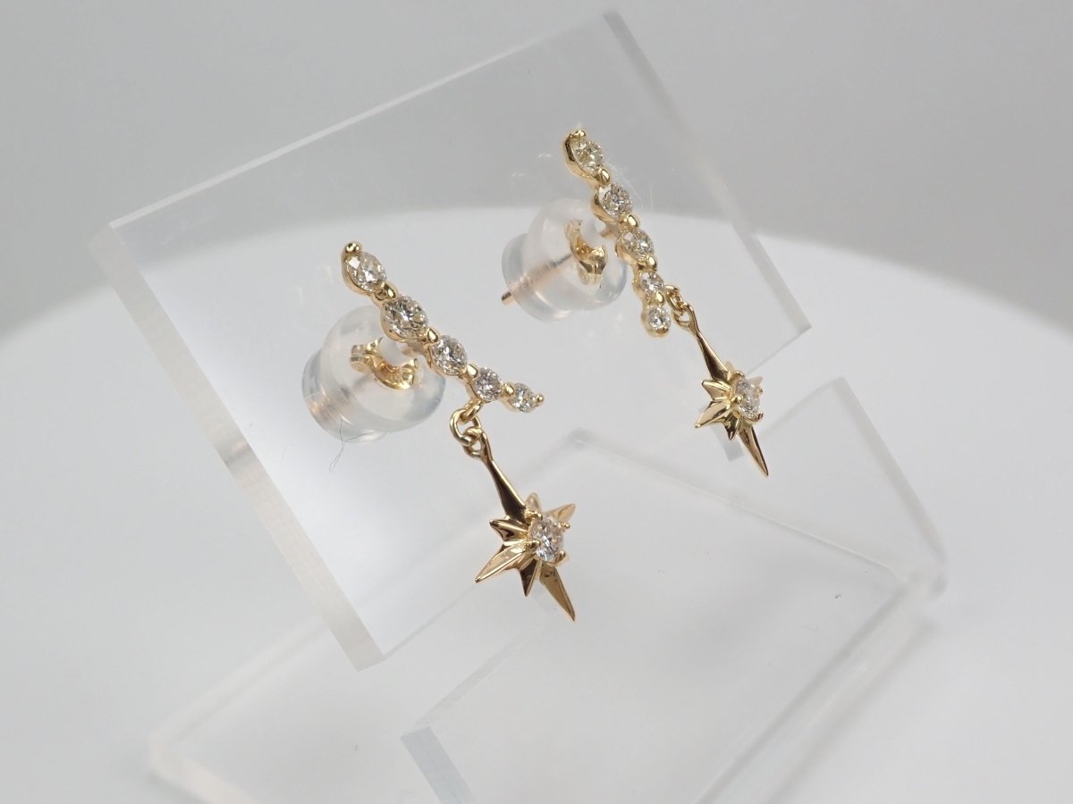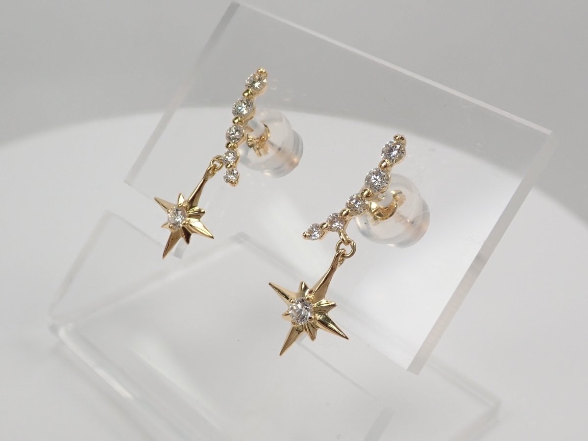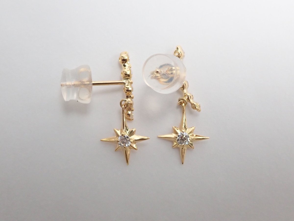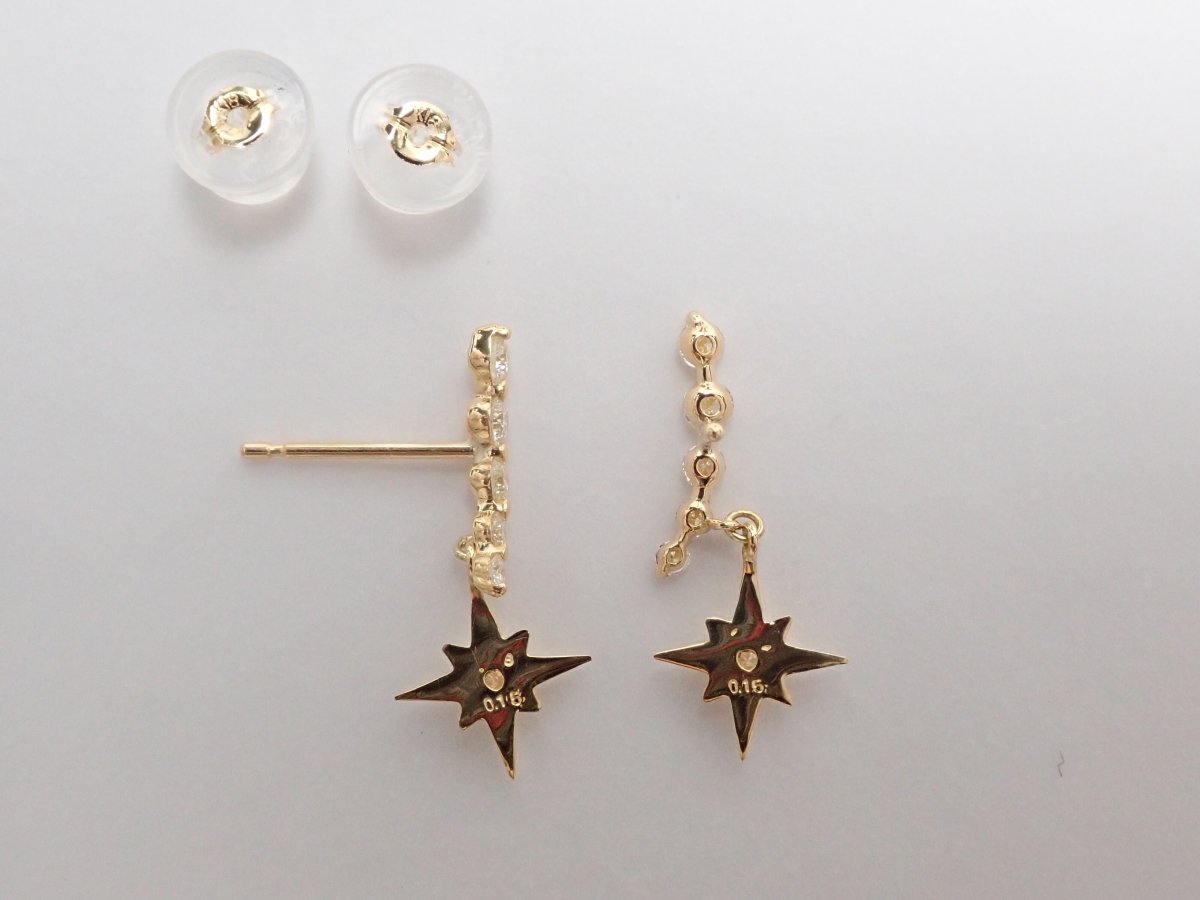 These earrings have a delicate and sparkling design with a frame surrounding the diamond. Its subtle glow resembles a shooting star dancing in the night sky. I feel like it will make the wishes of those who see it come true.