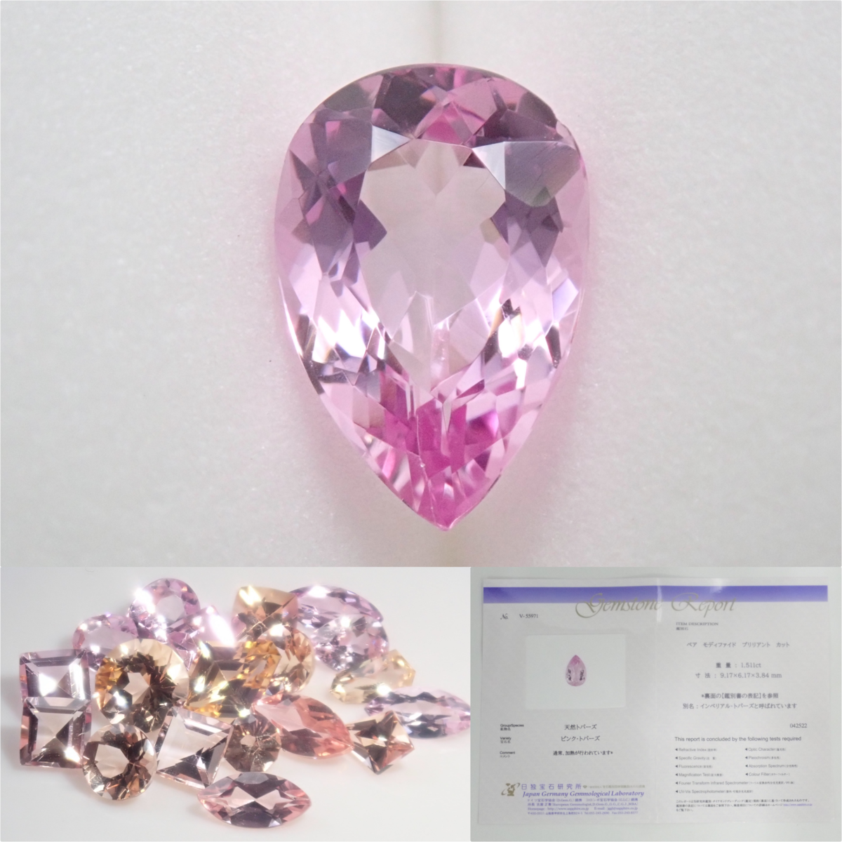 通常69800円の上質なピンクインペリアルトパーズ1.5ctや、うるうるとした輝き、上品で愛らしい色合いのインペリアルトパーズをあつめたインペリアルトパーズガチャ15石です。1石は日独宝石研究所鑑別書付きで1.5ct、その他は平均0.17ctのインペリアルトパーズです。