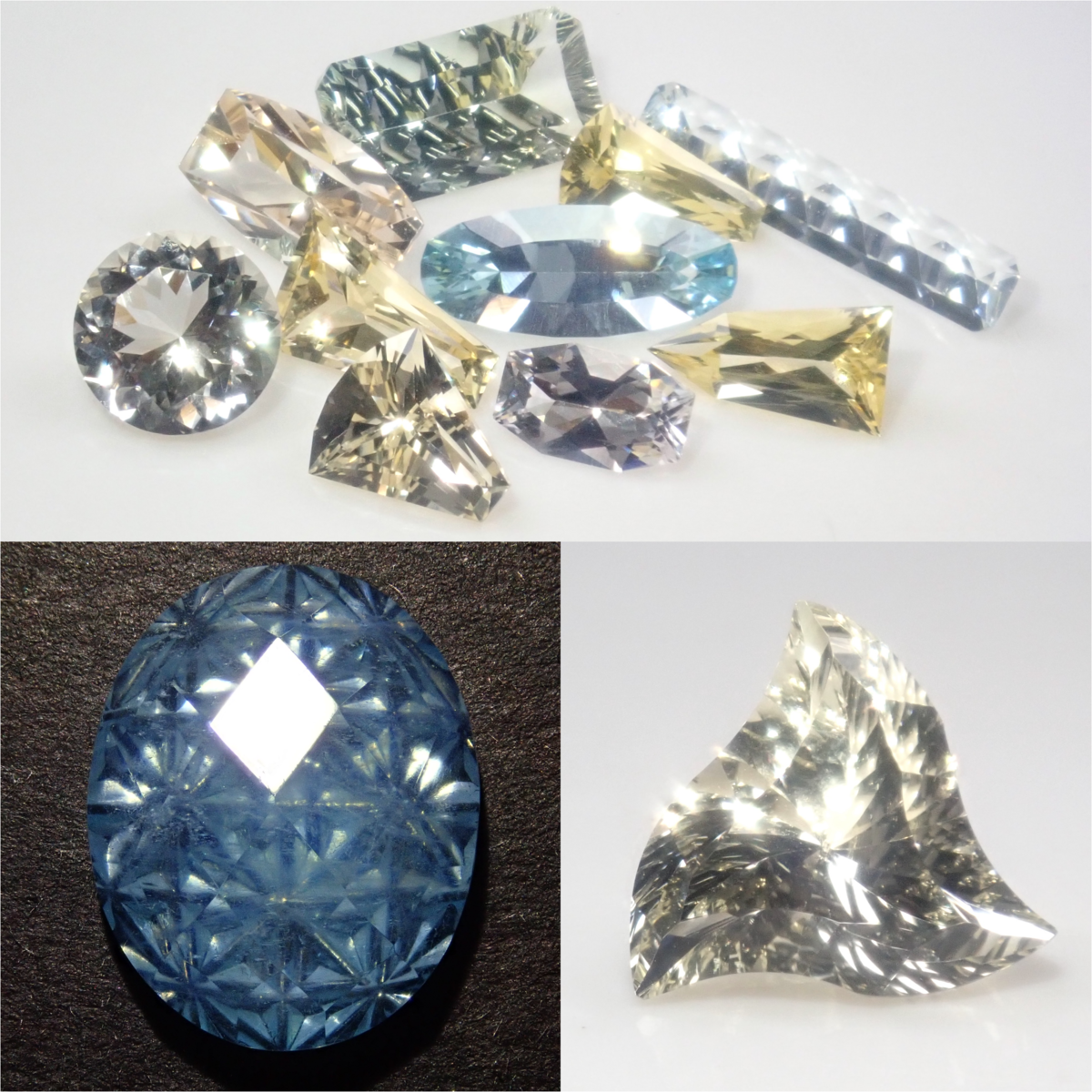 限定13石のベリルガチャです。当たりとして、アクアマリンの甲州貴石切子「チェッカーボード×彩」5.2ct鑑別書付きを1石含みます。その他はアメリカの研磨職人KEN氏がカットしたボルテックスカットのイエローベリルやアクアマリンなど全てベリルです。プリンセスカットのベリルは2石セットでお届けします。