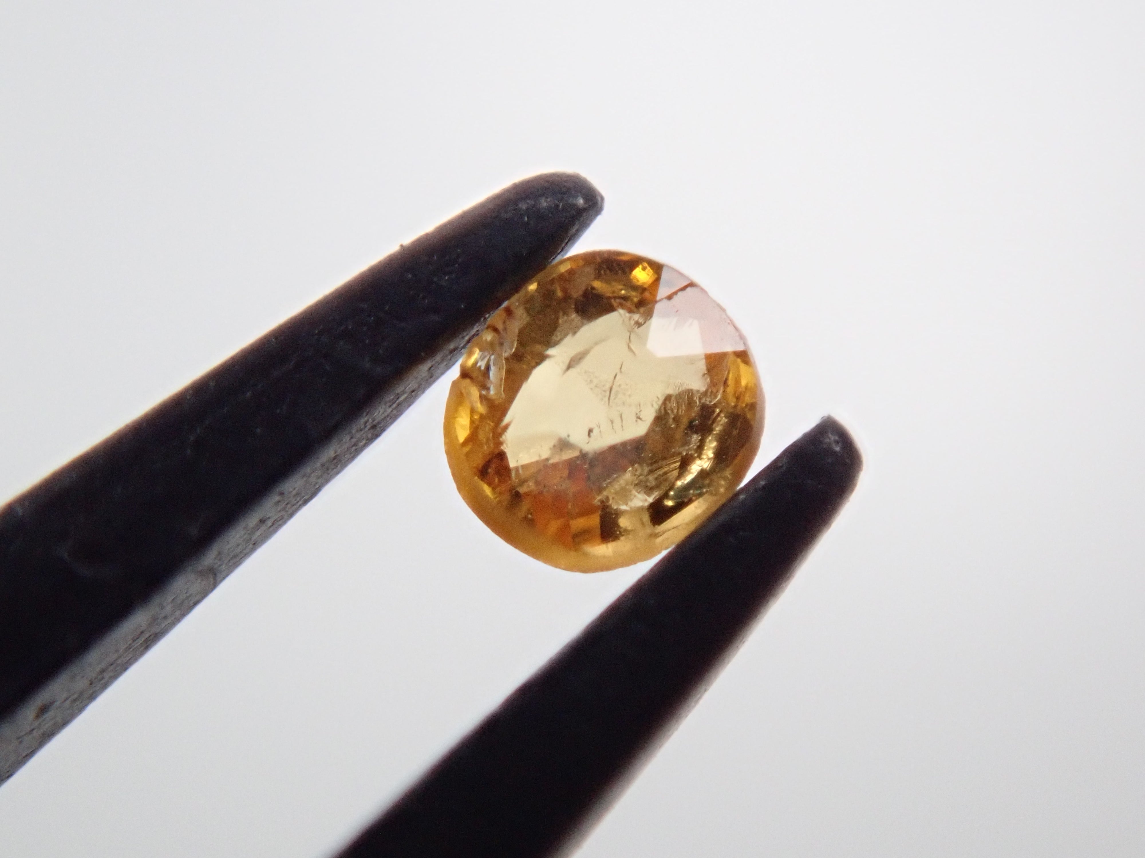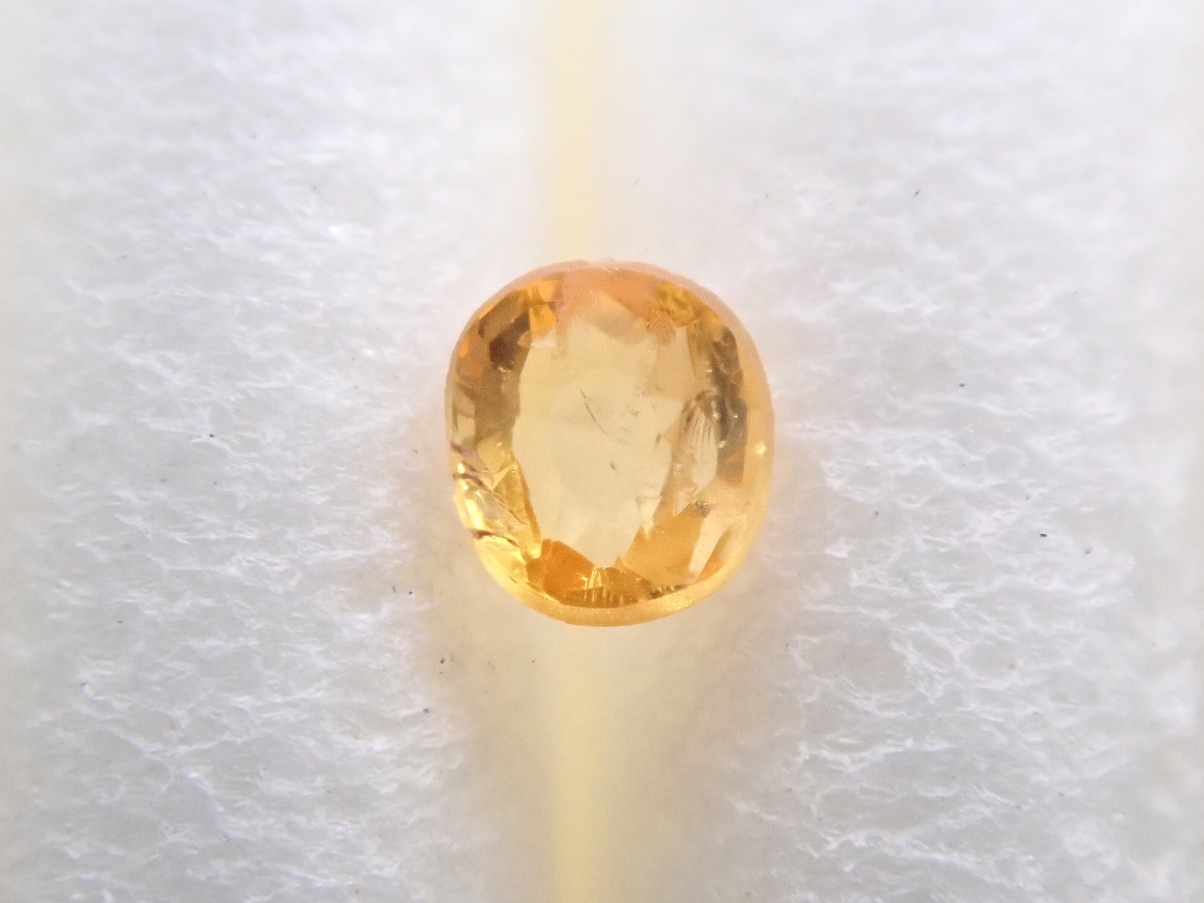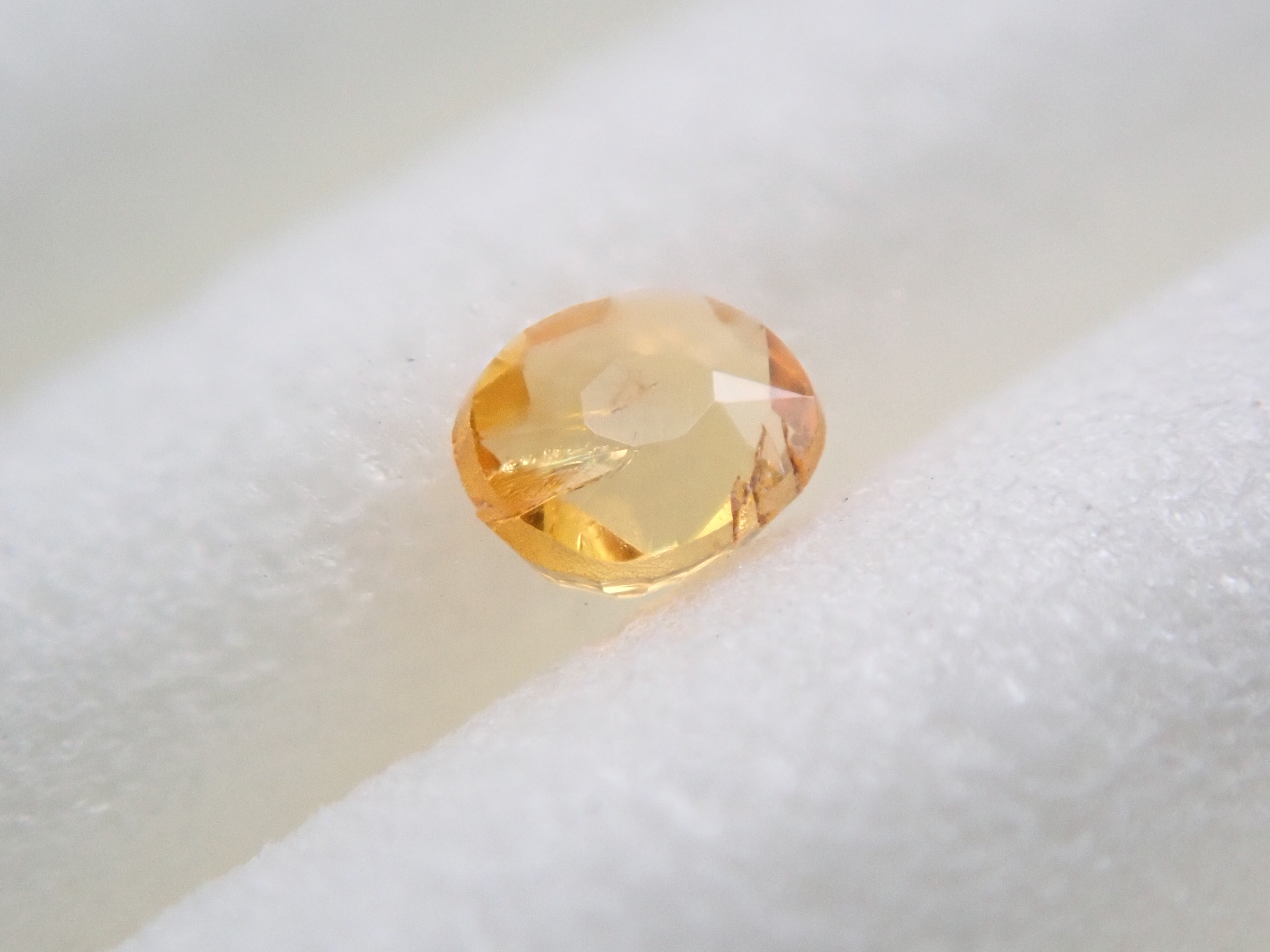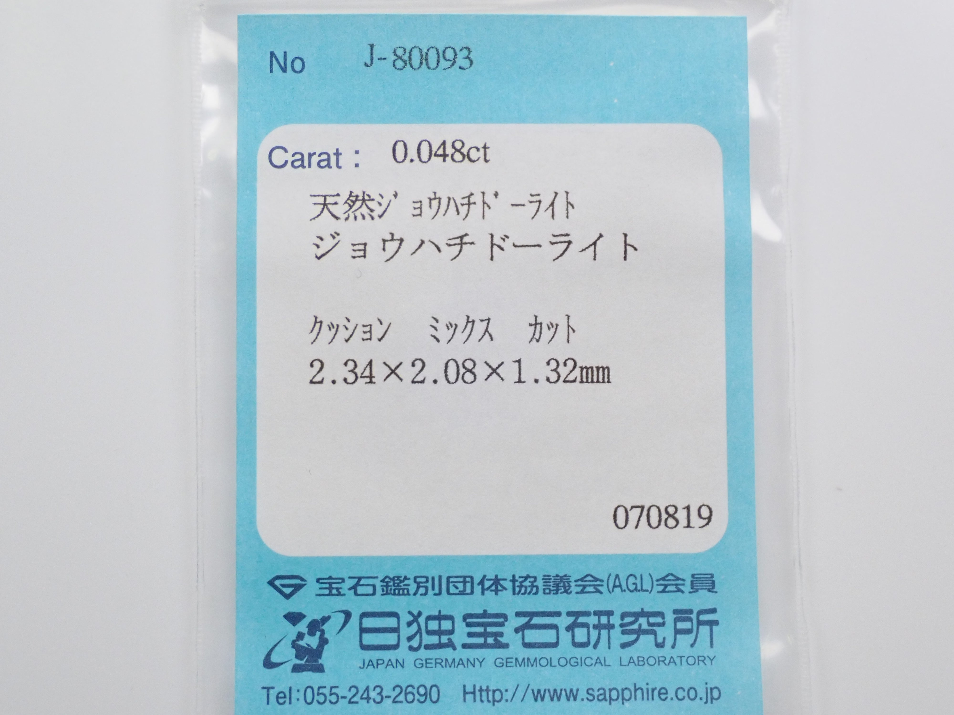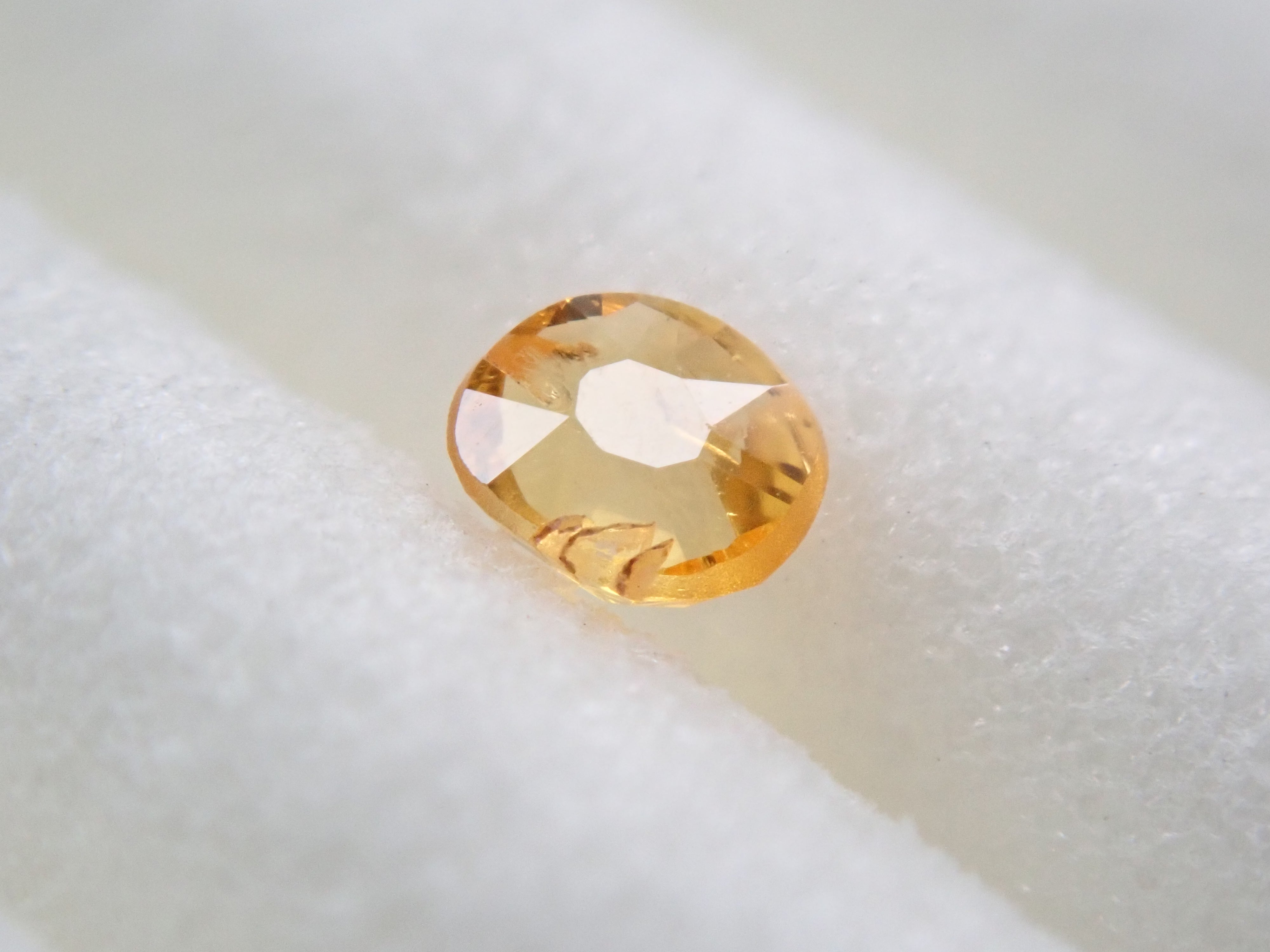 北朝鮮の上八洞で日本人により発見された鉱物、ジョウハチドーライト。現在の主な産地はミャンマーだそう。無色、イエロー、オレンジなどのカラーバリエーションがあります。 ジョーハチドーライトのルースです。日独宝石研究所のソーティングが付属しています。