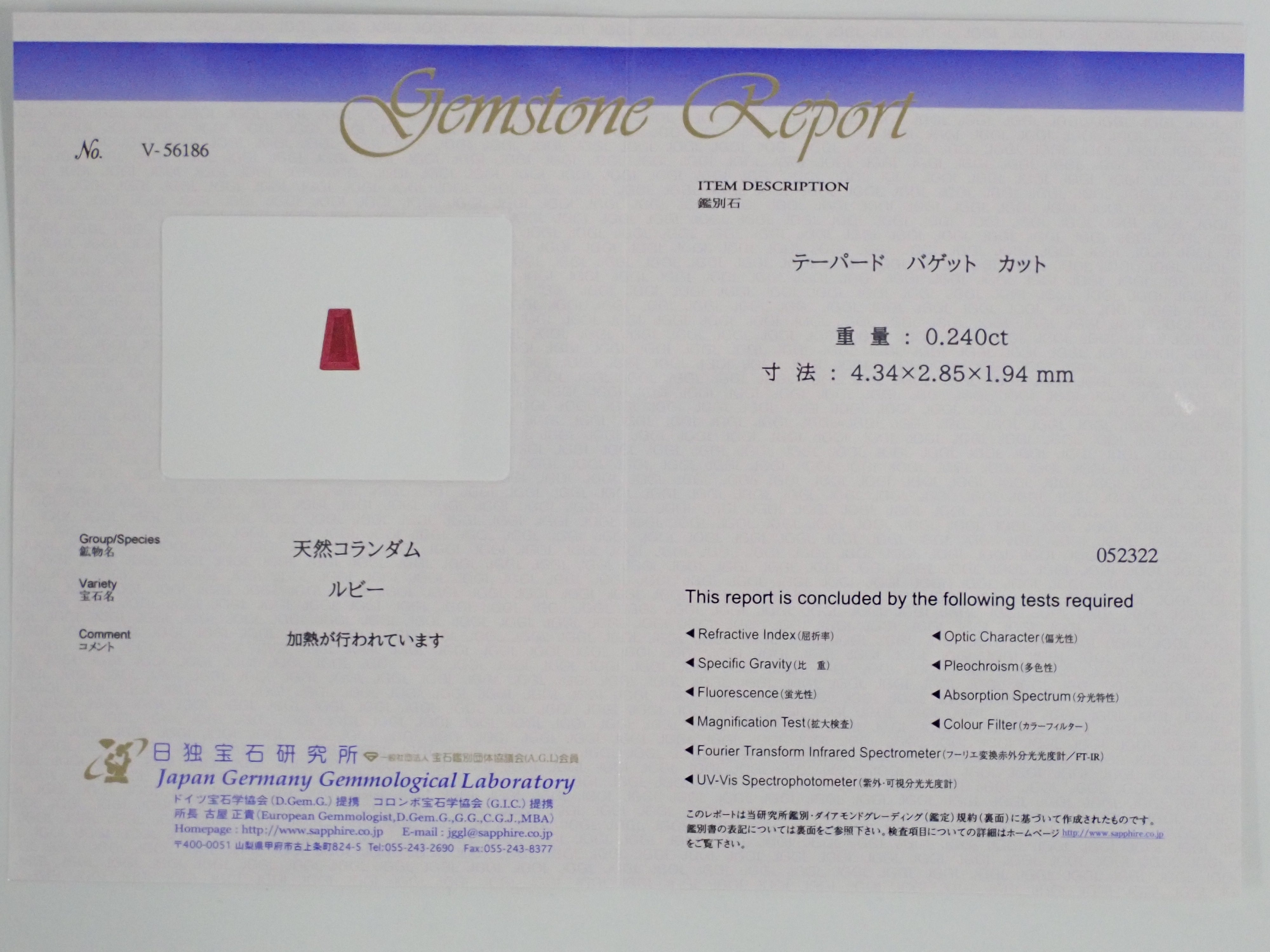 ルビー 0.240ctルース(テーパーカット) 日独鑑