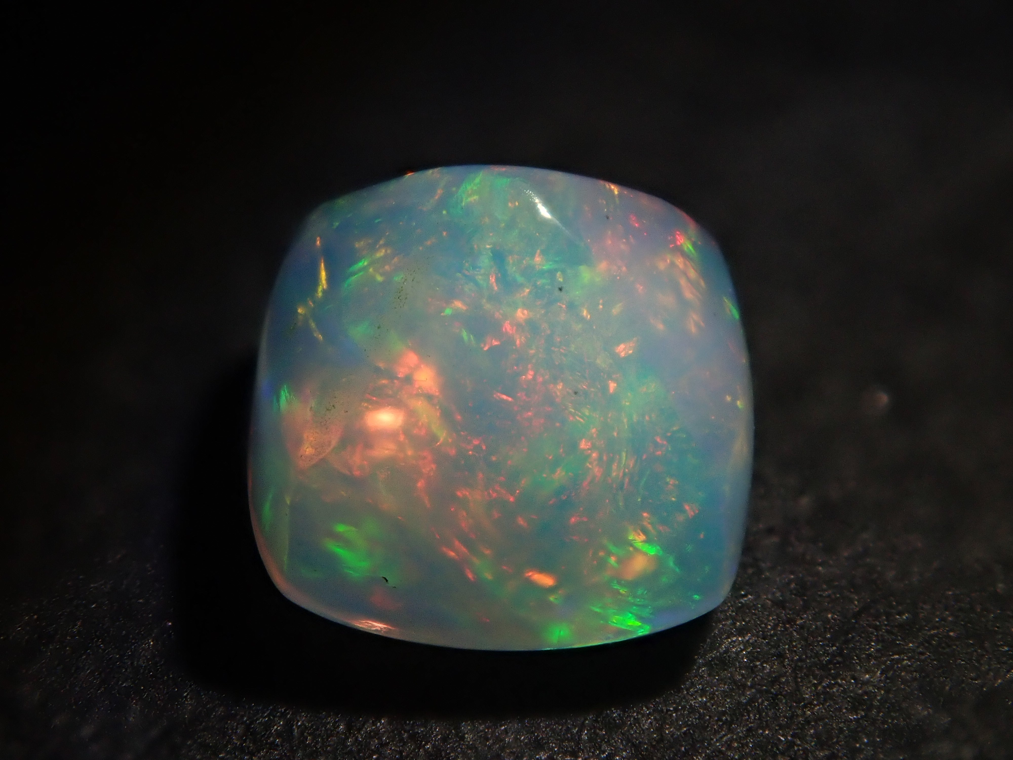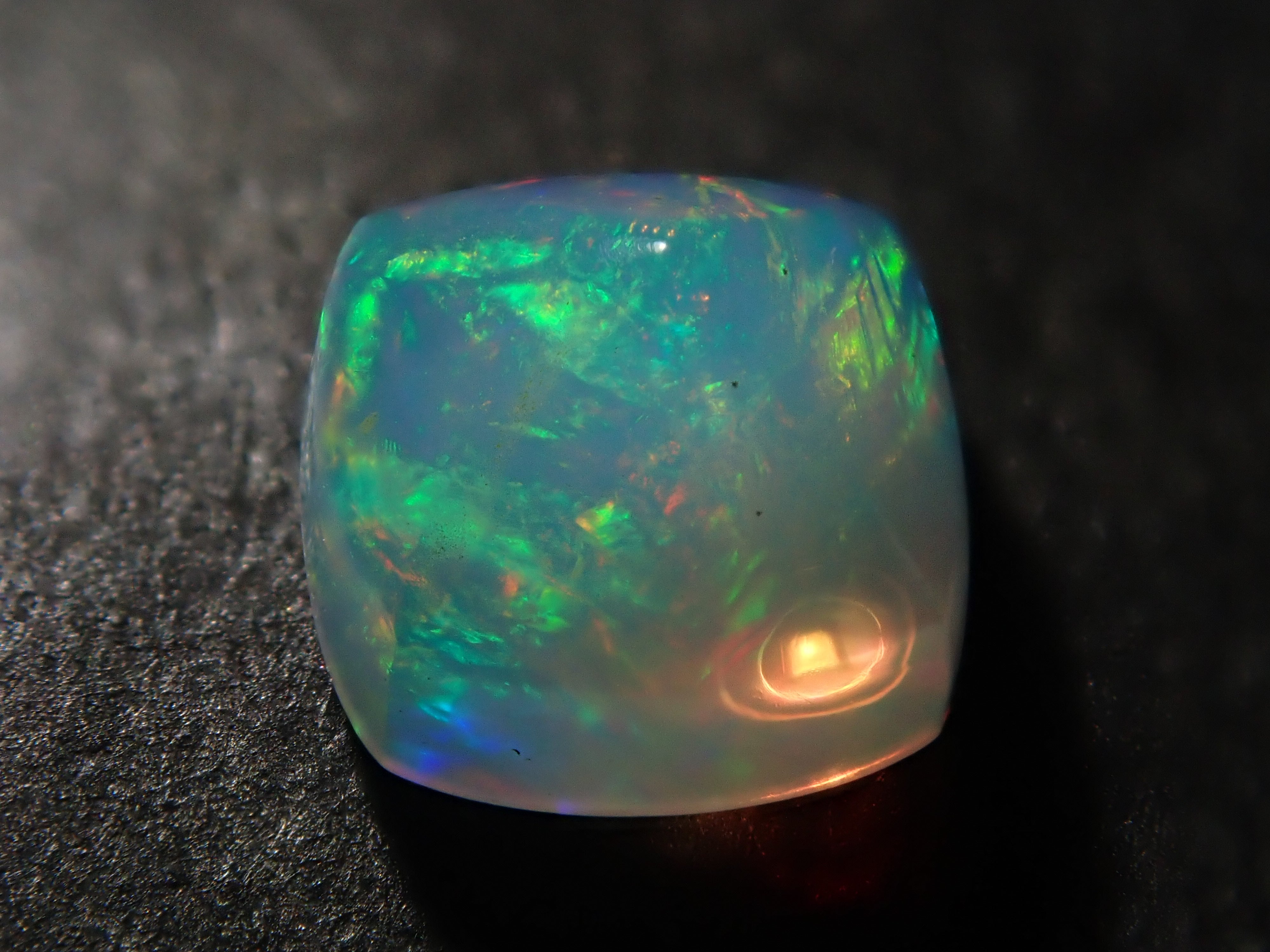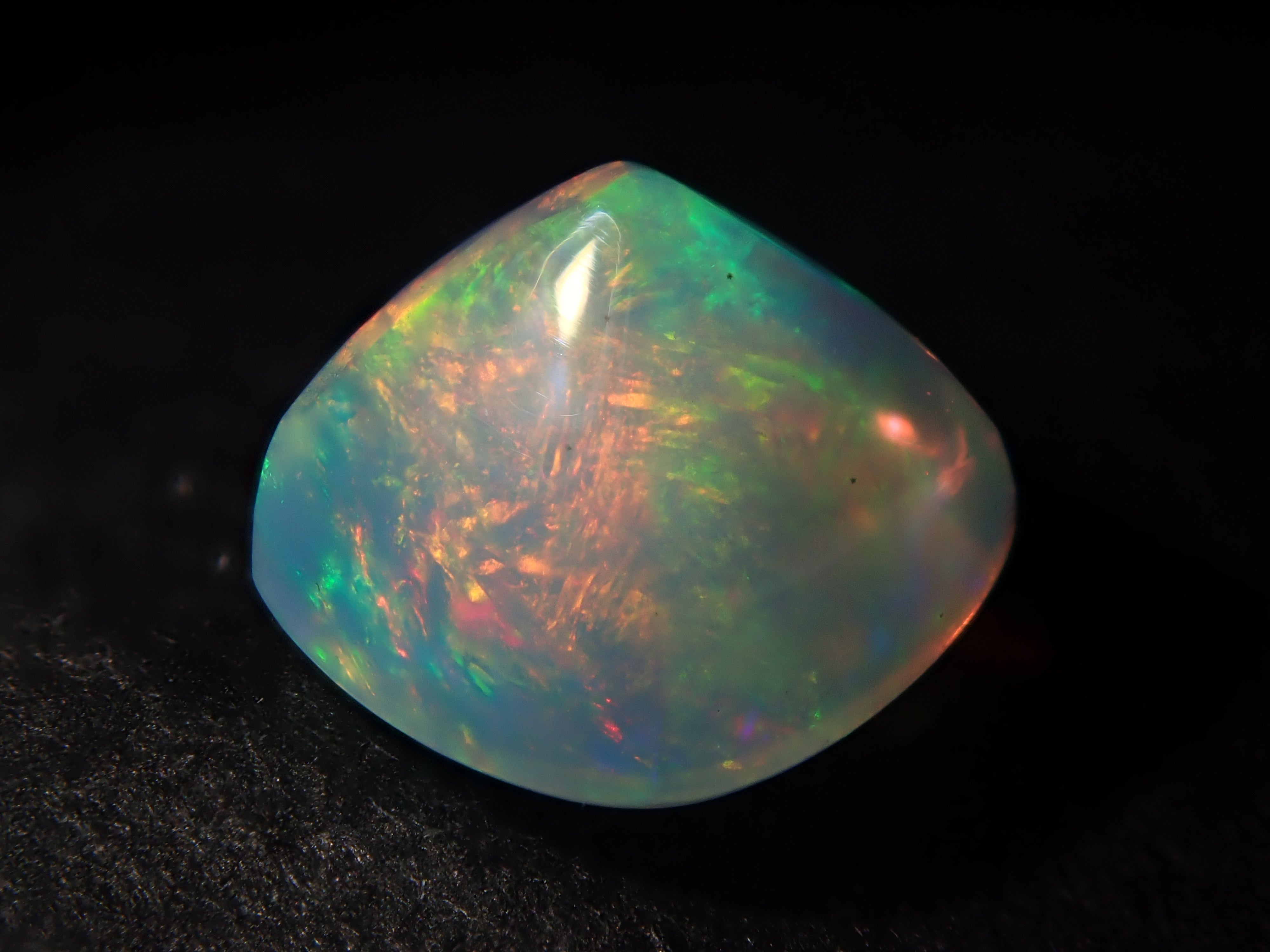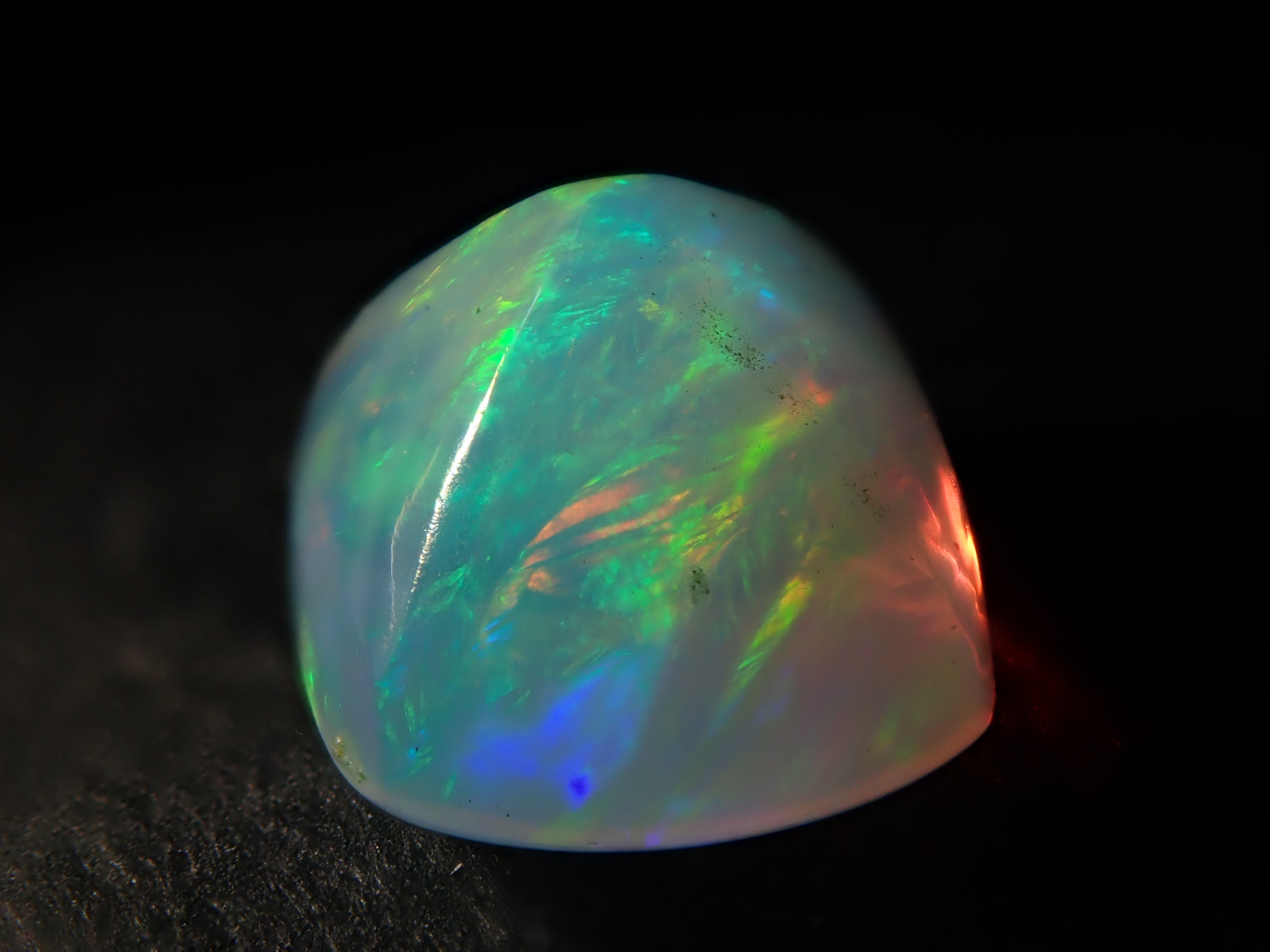 虹色の光のゆらめきが特徴の宝石、オパール。オパールは種類が多彩で様々な表情を見せる宝石。この魅力に取り憑かれオパールだけをコレクションする人もいるほど。撮影はペンライトを用いて行っています。 シュガーロフカットの遊色を十分に楽しめるオパールです。