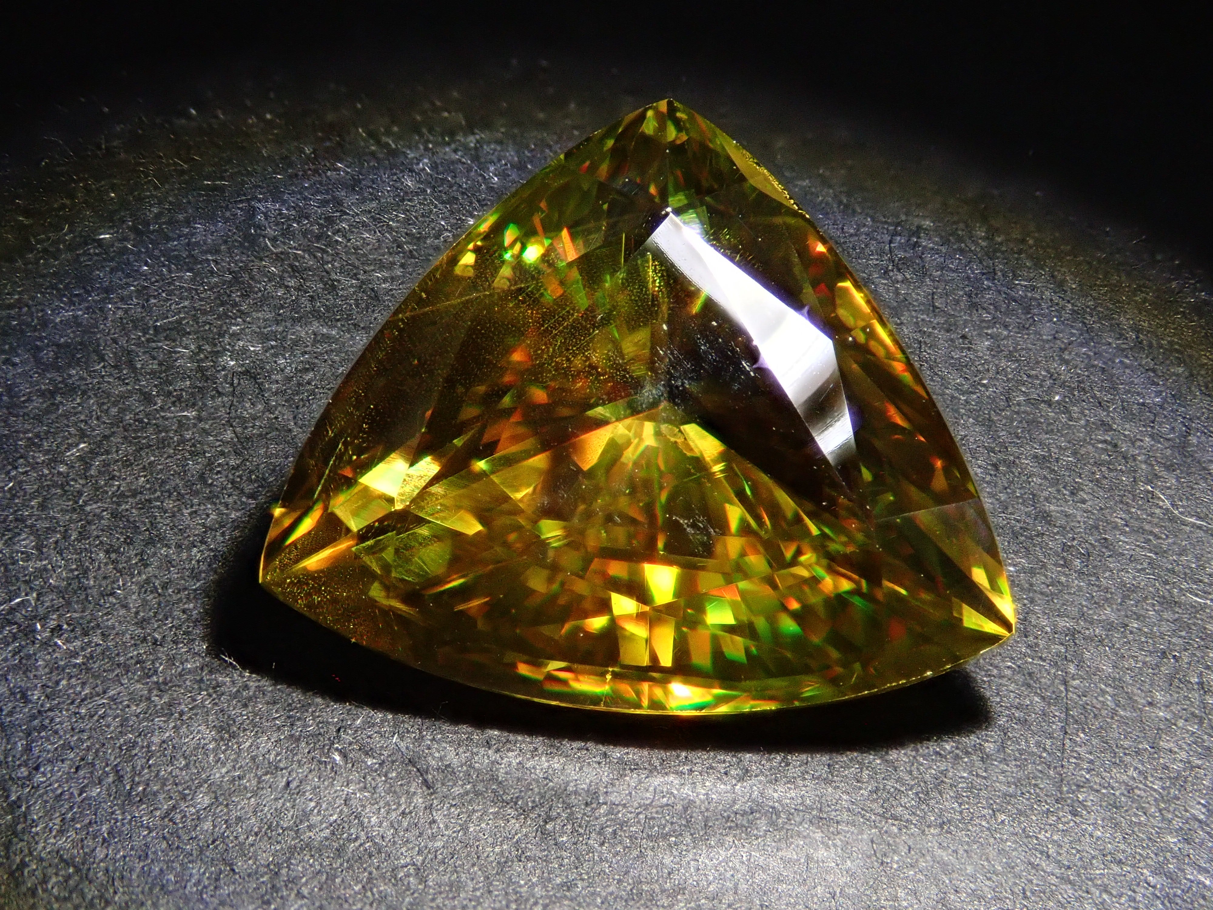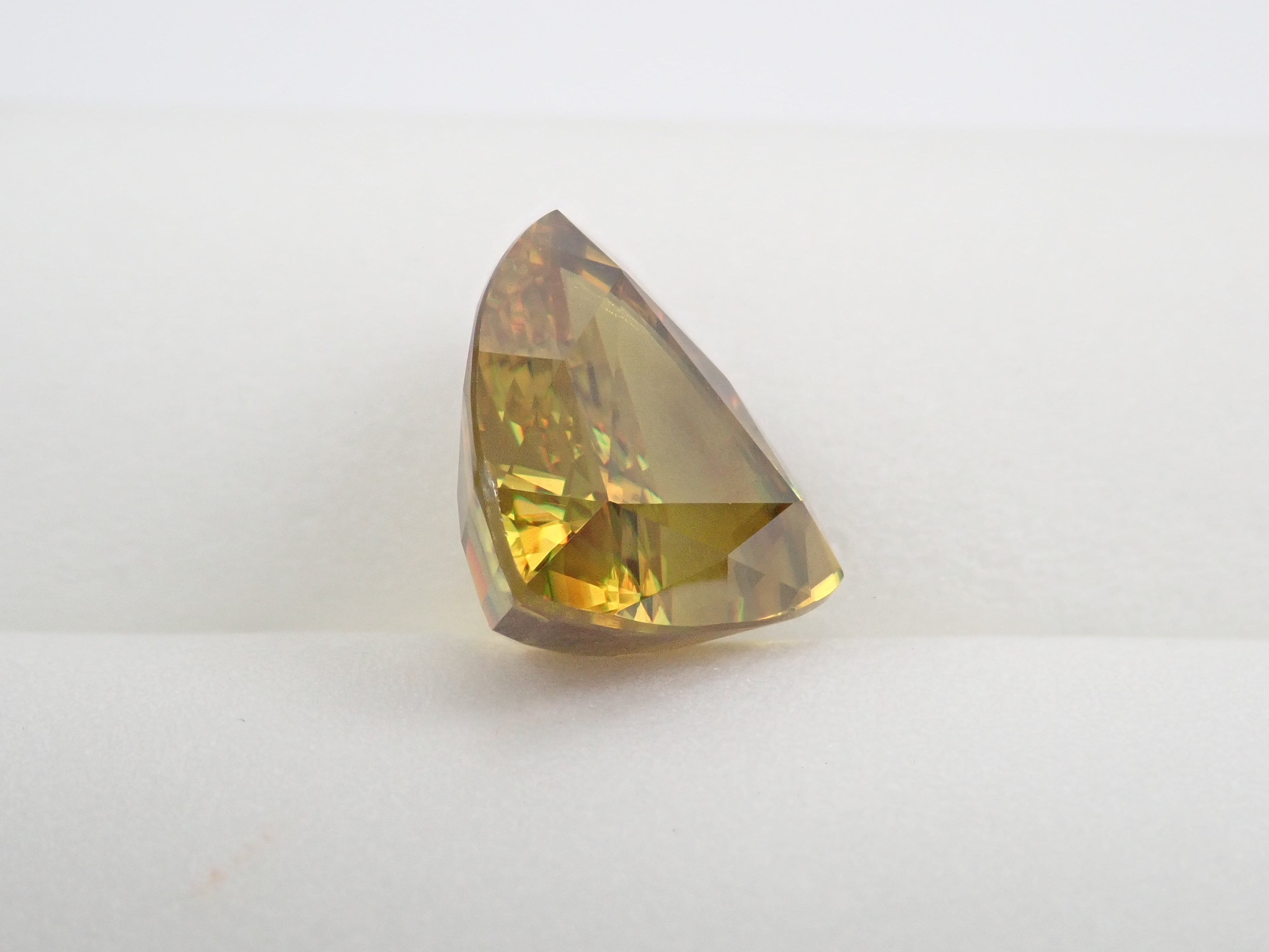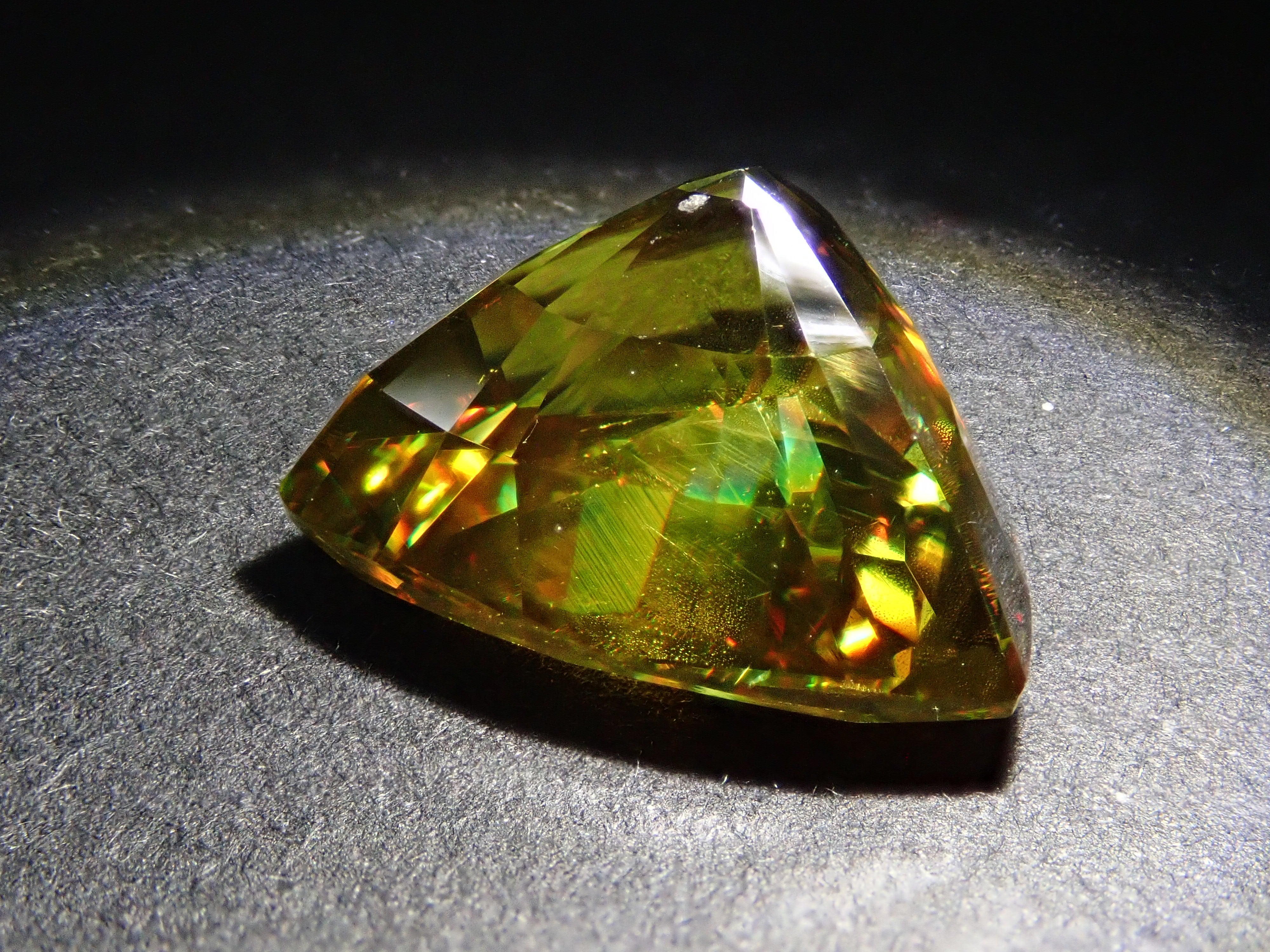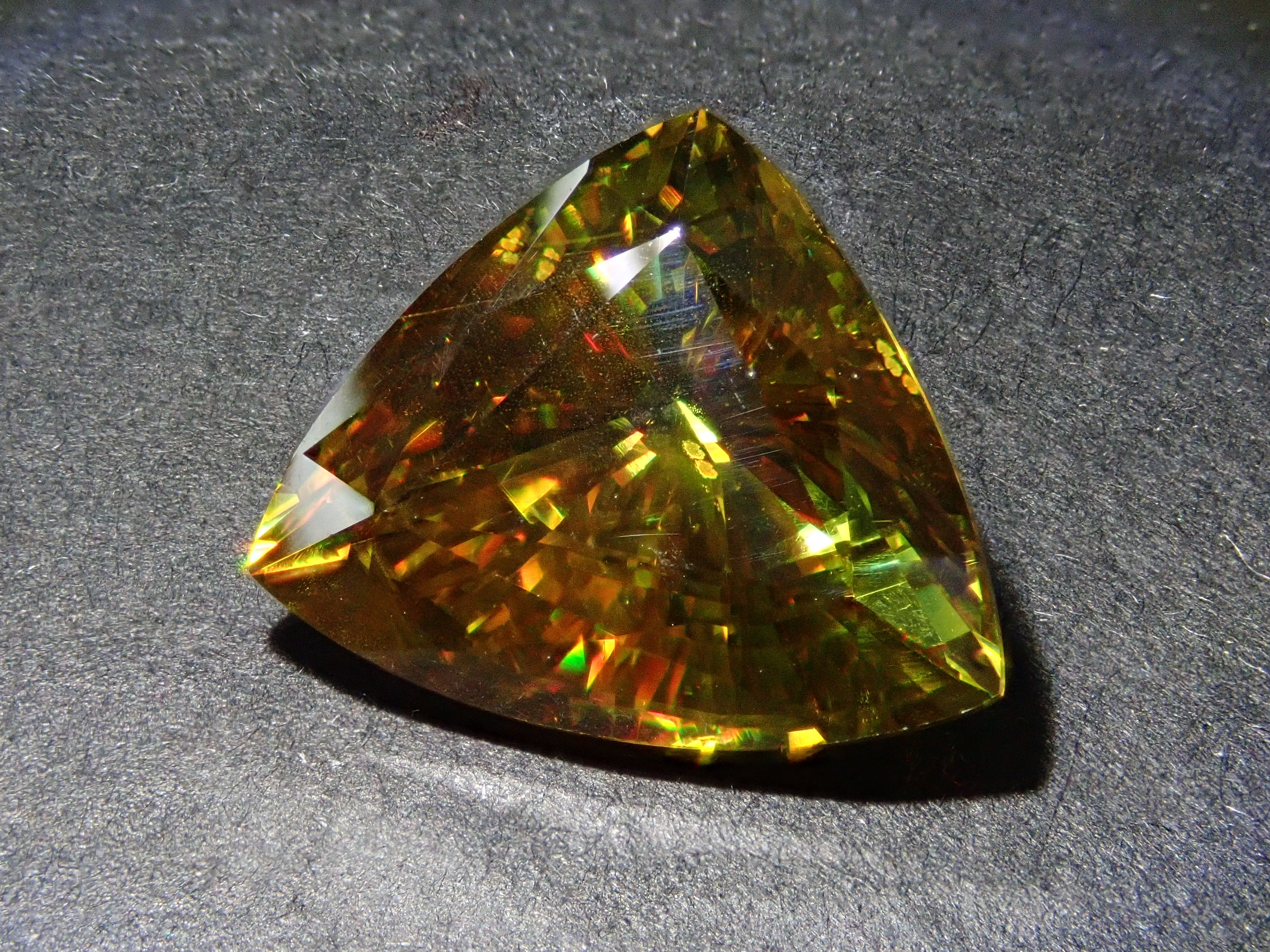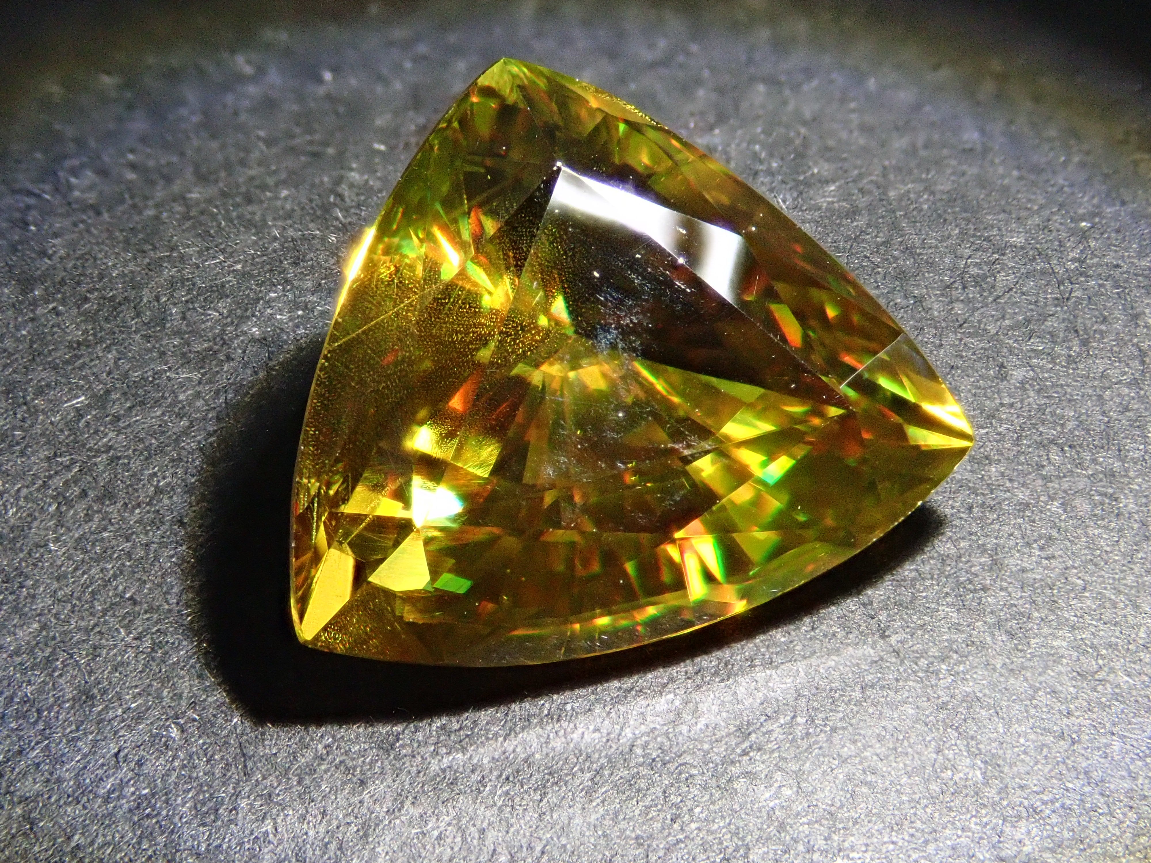 黄金色の輝きと豪華なファイアを見せるスフェーン。ダイヤモンドよりも強力なファイアを放つ魅力的な宝石として、コレクターからの人気が高まっています。角度によって目まぐるしく輝きの表情が変わるスフェーン。カラーチェンジは赤系のカラーチェンジ用ペンライトを使ってお楽しみください。透明度も高く、ファイアも楽しめる品質の高いパキスタン産カラーチェンジスフェーンです。