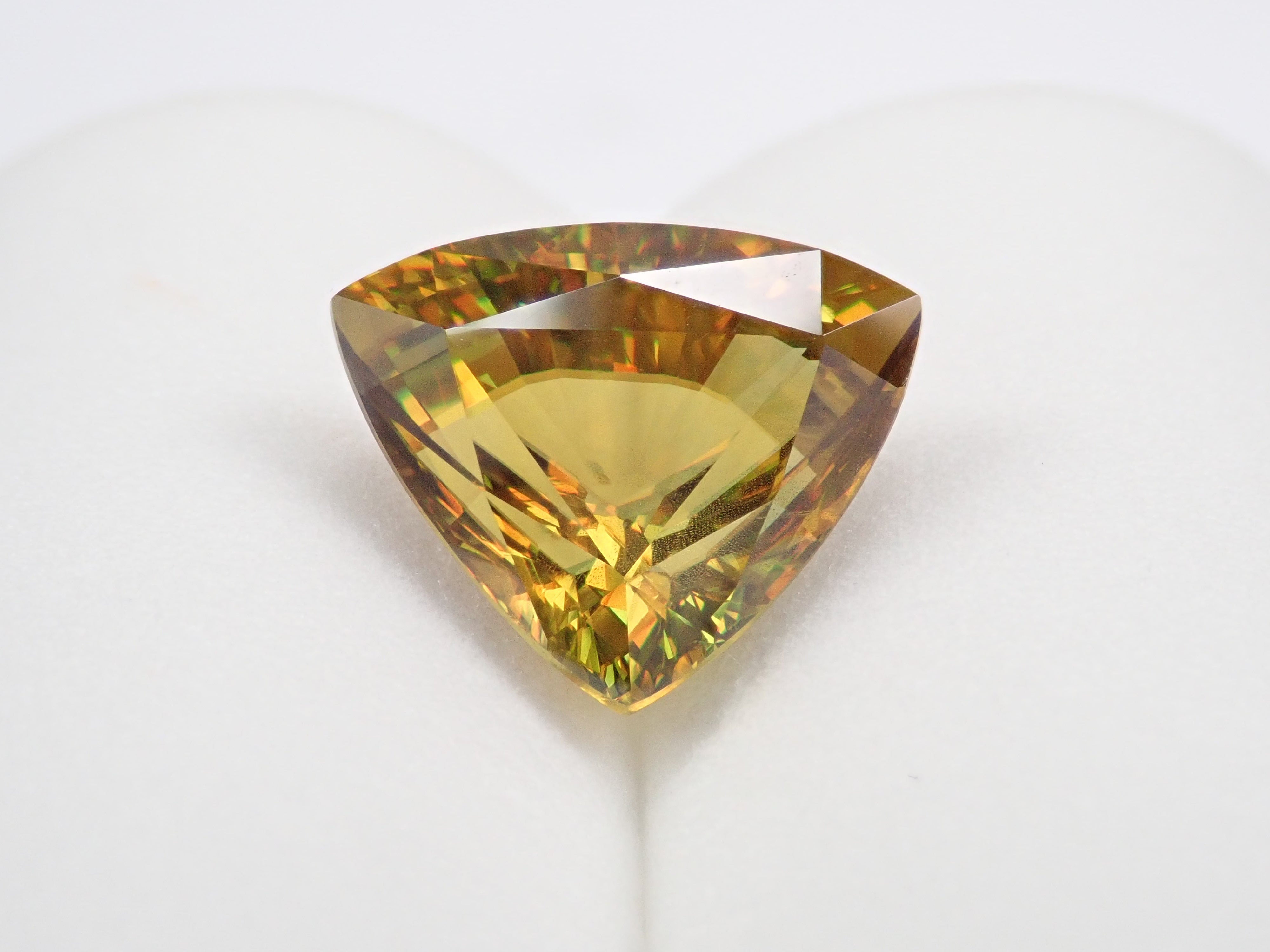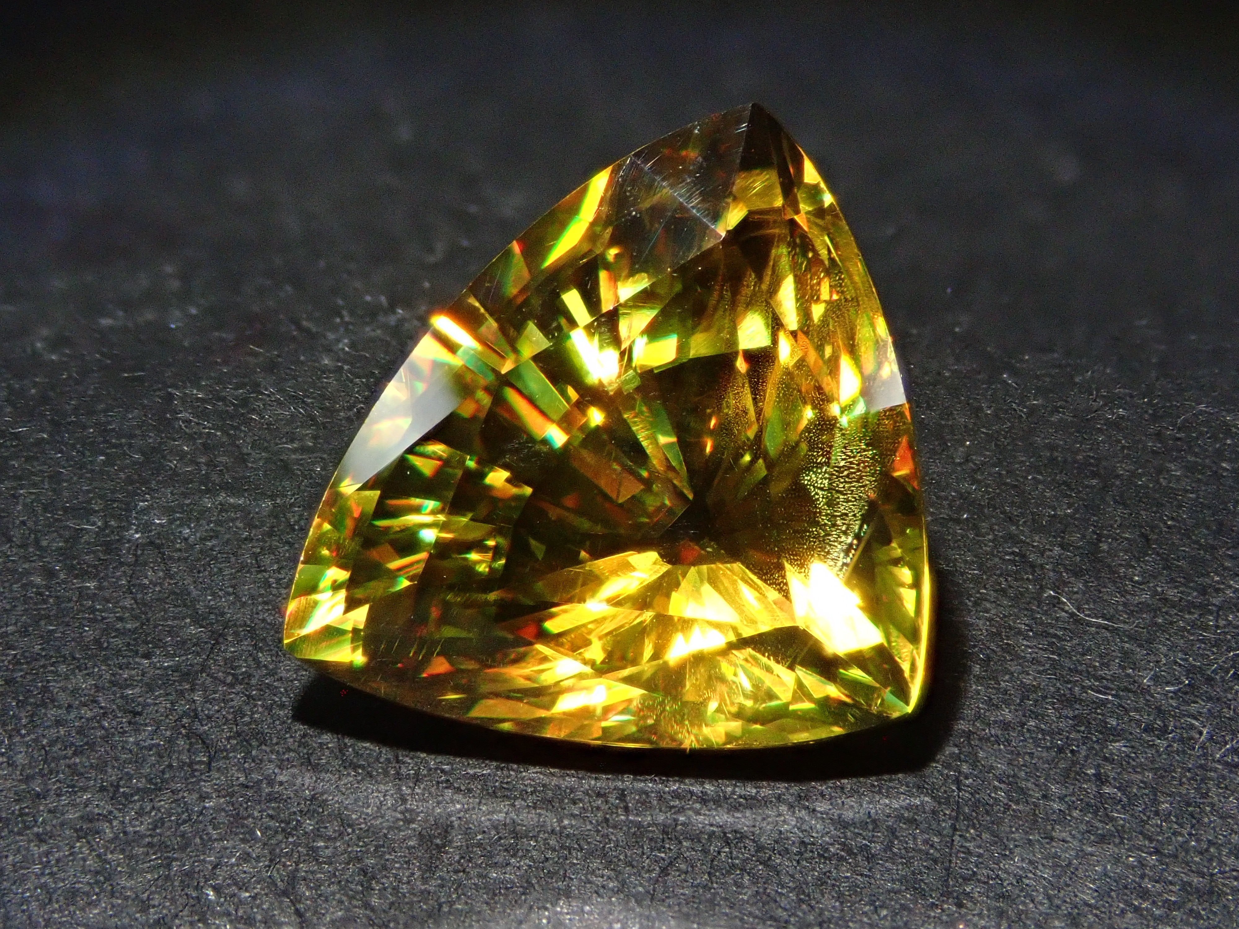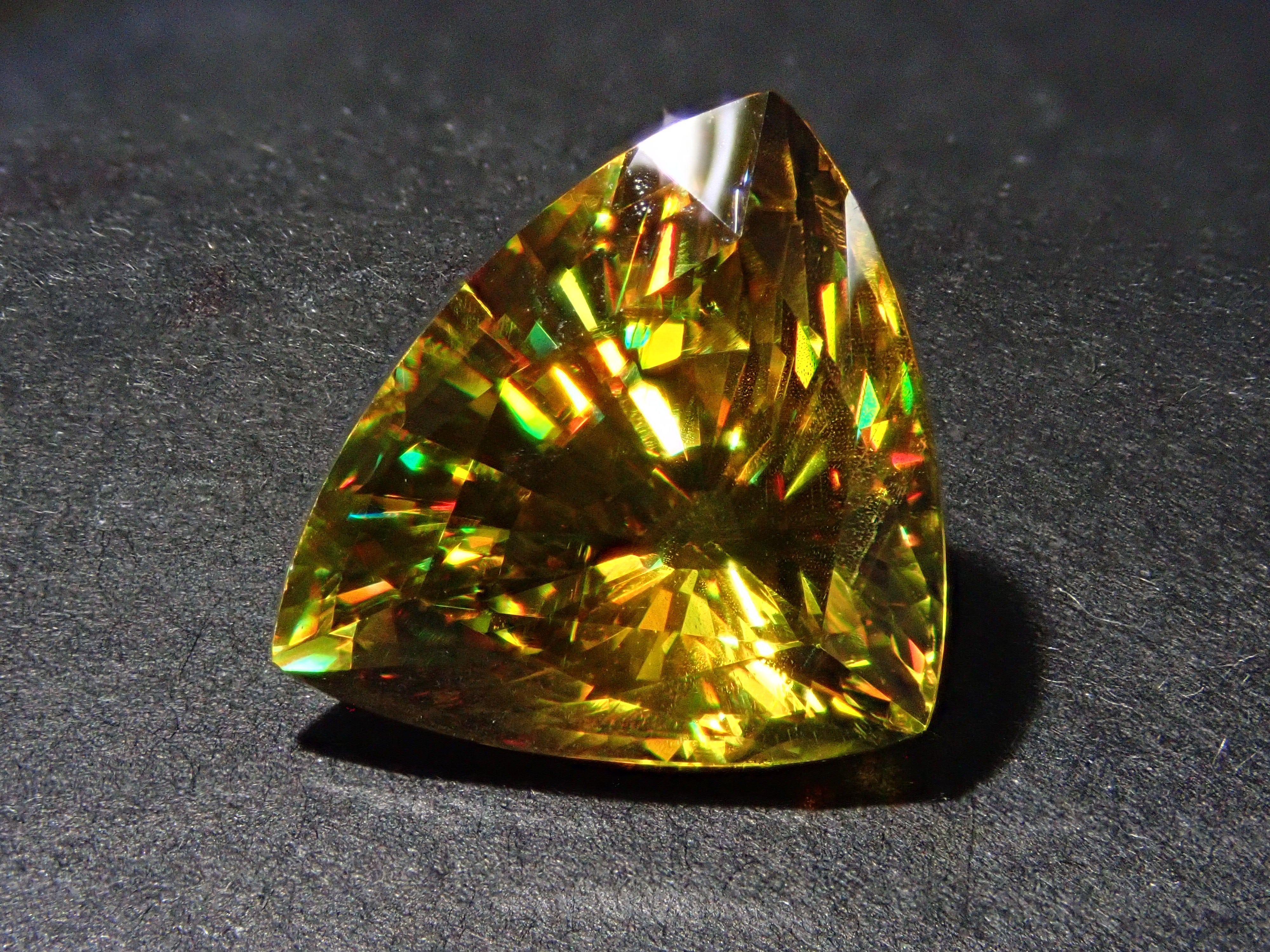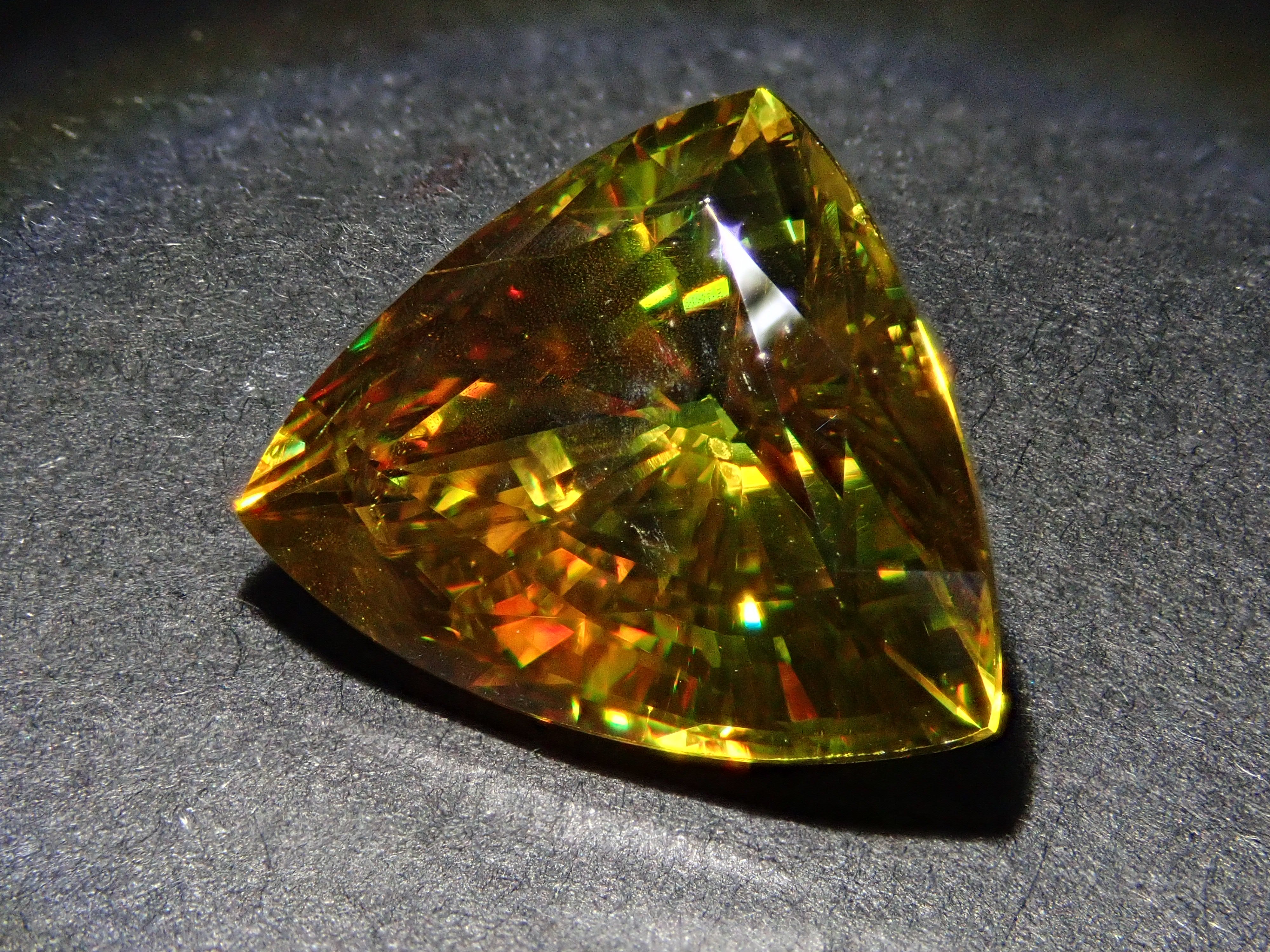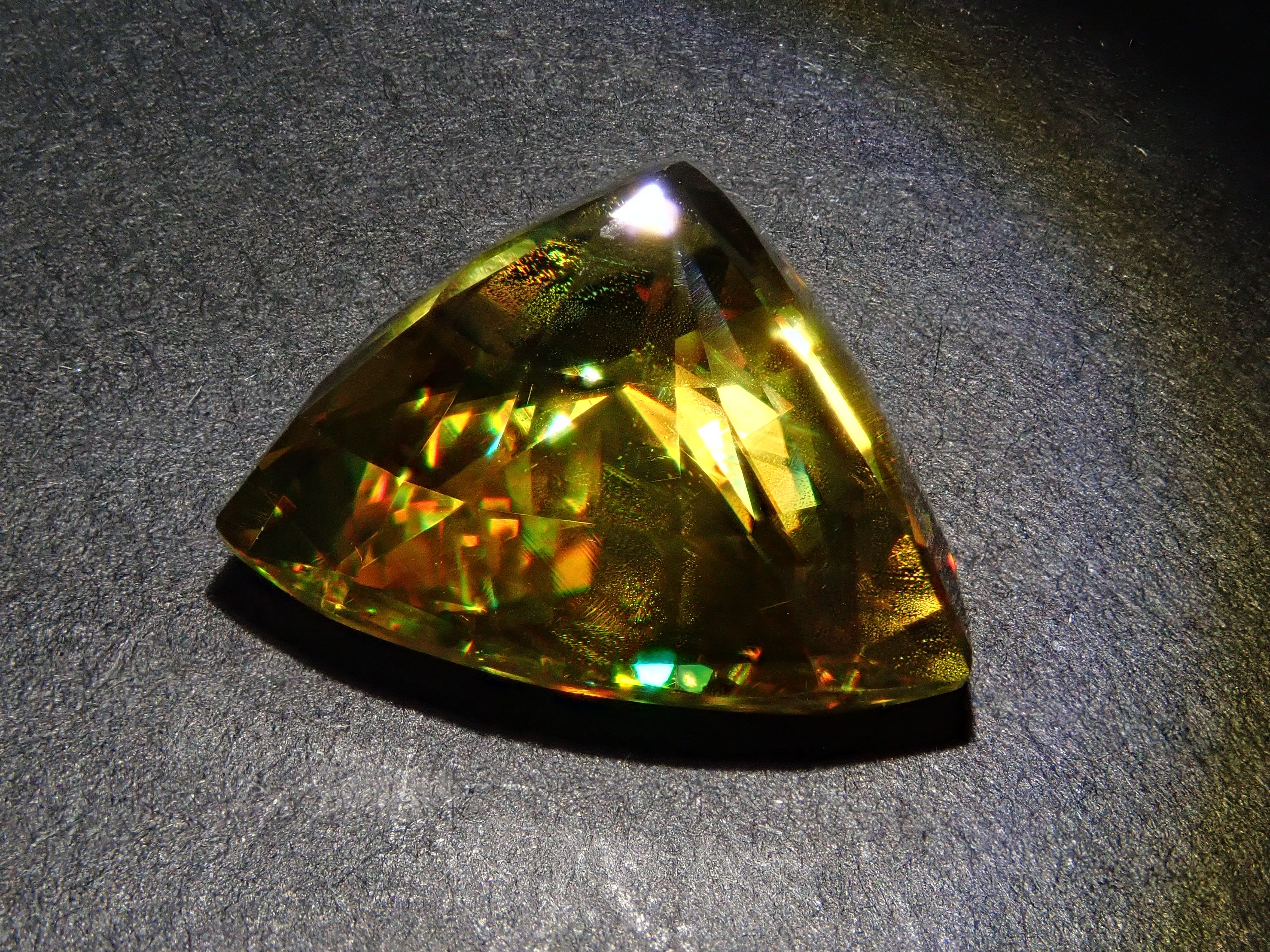 黄金色の輝きと豪華なファイアを見せるスフェーン。ダイヤモンドよりも強力なファイアを放つ魅力的な宝石として、コレクターからの人気が高まっています。角度によって目まぐるしく輝きの表情が変わるスフェーン。カラーチェンジは赤系のカラーチェンジ用ペンライトを使ってお楽しみください。透明度も高く、ファイアも楽しめる品質の高いパキスタン産カラーチェンジスフェーンです。