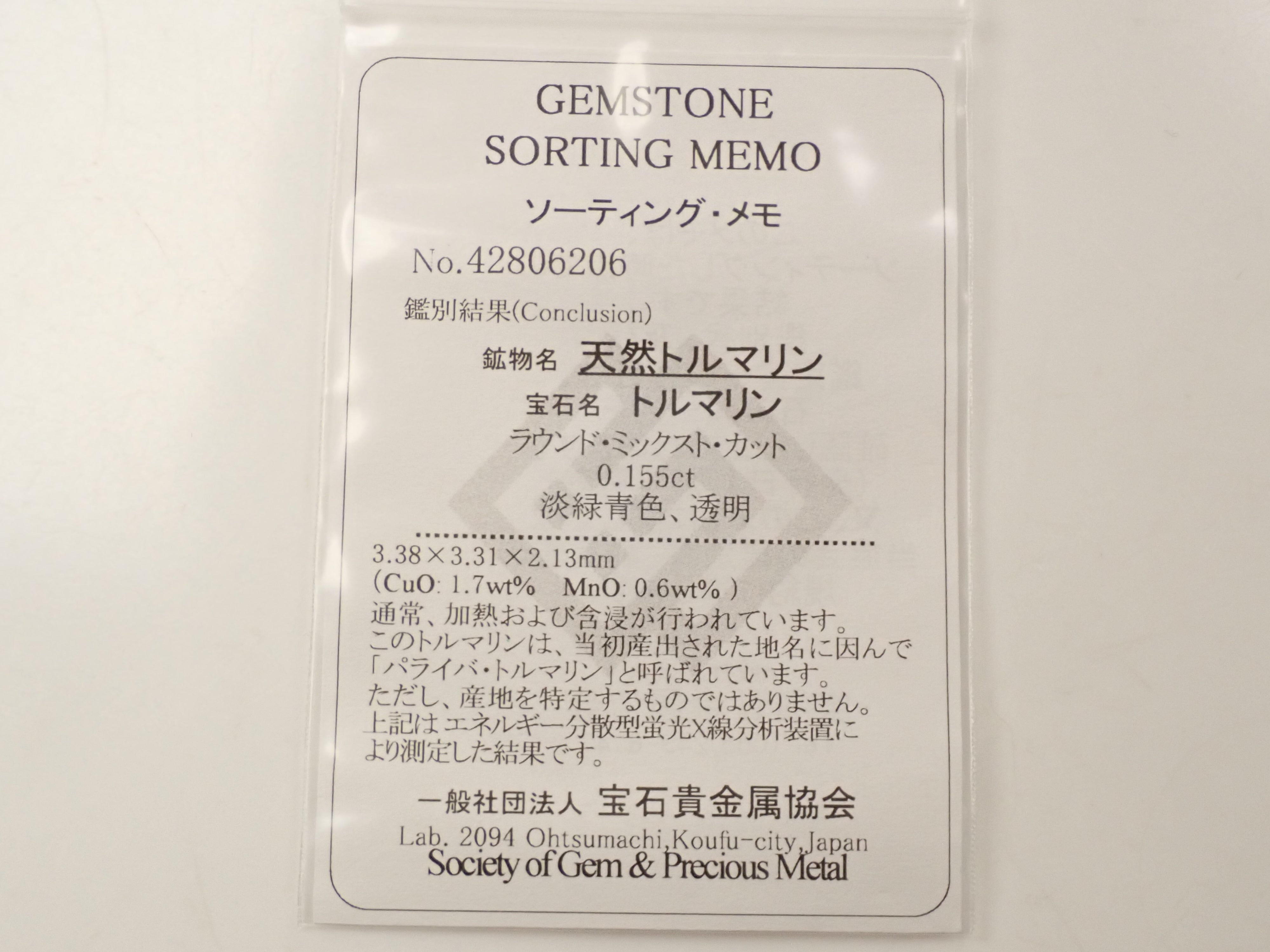 透明度も高く、鮮やかな色合いも楽しめる上質なブラジル・バターリャ産パライバトルマリンです。CuO:1.7%、MnO:1.6%のブラジル産パライバトルマリンです。一般社団法人 宝石貴金属協会のソーティングが付属しています。
