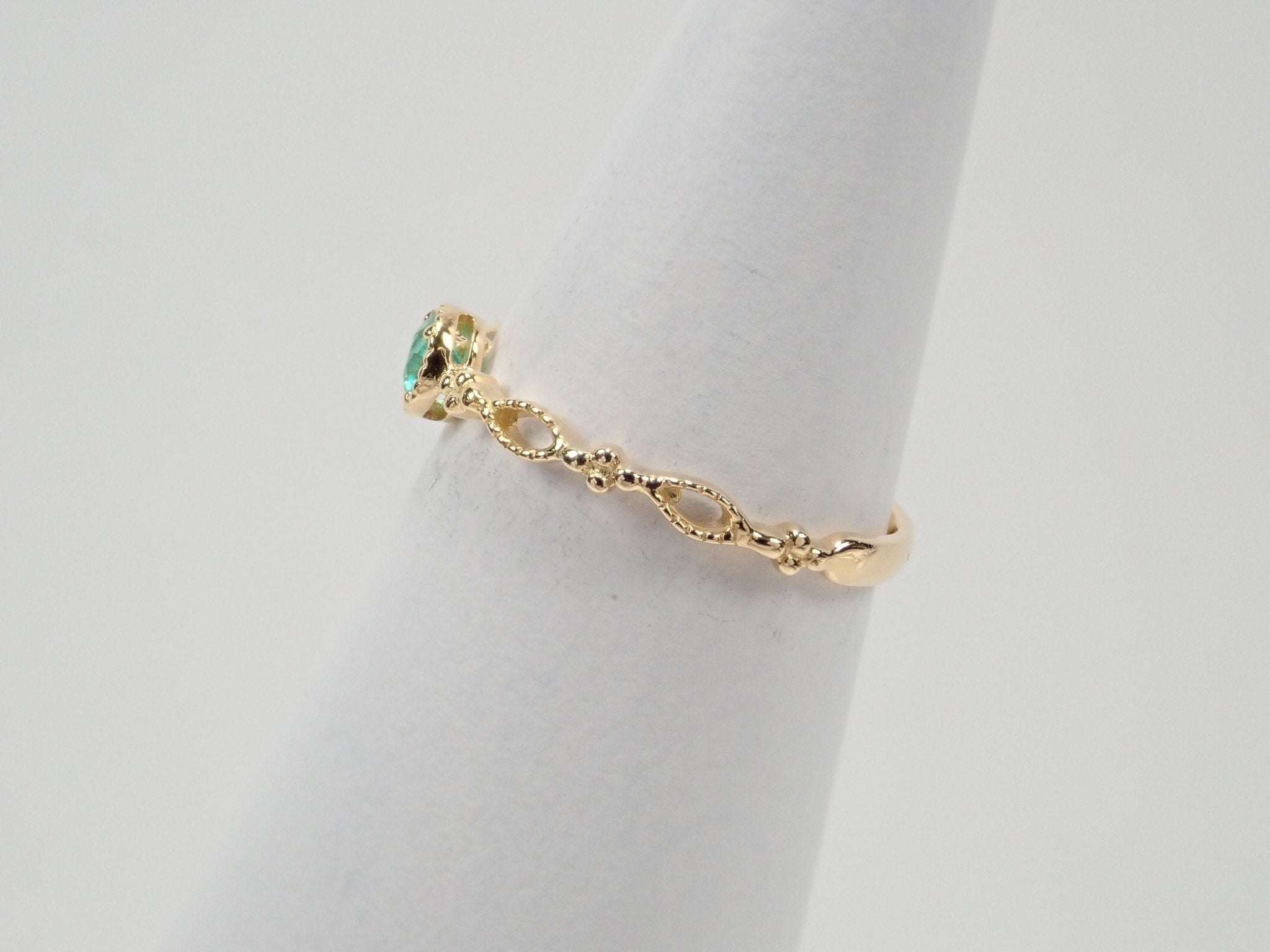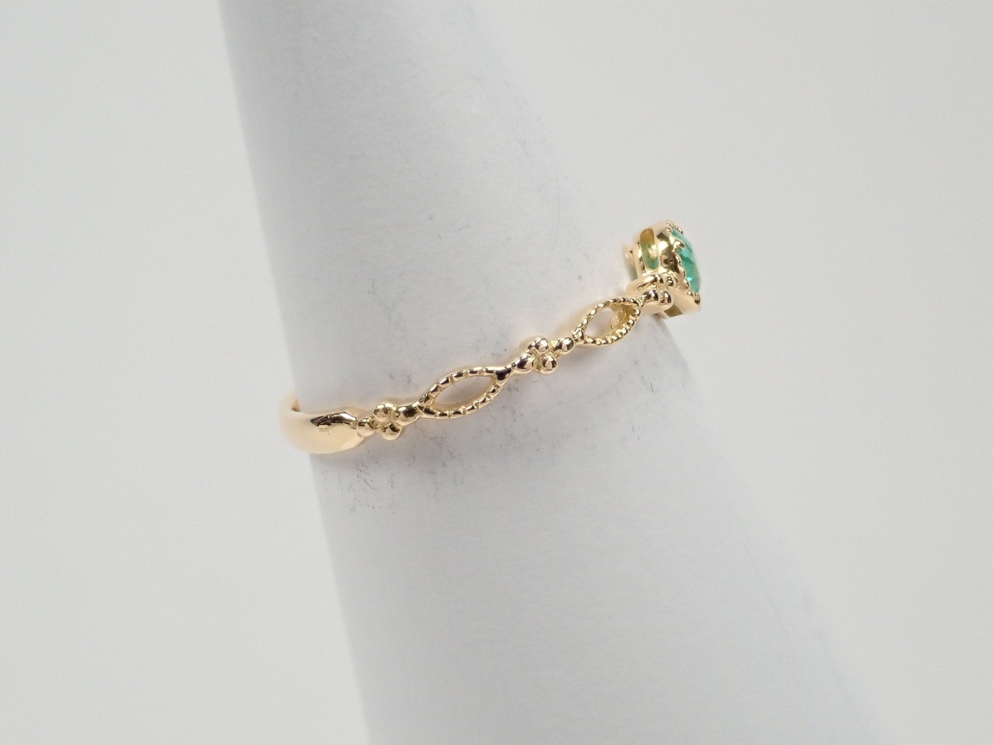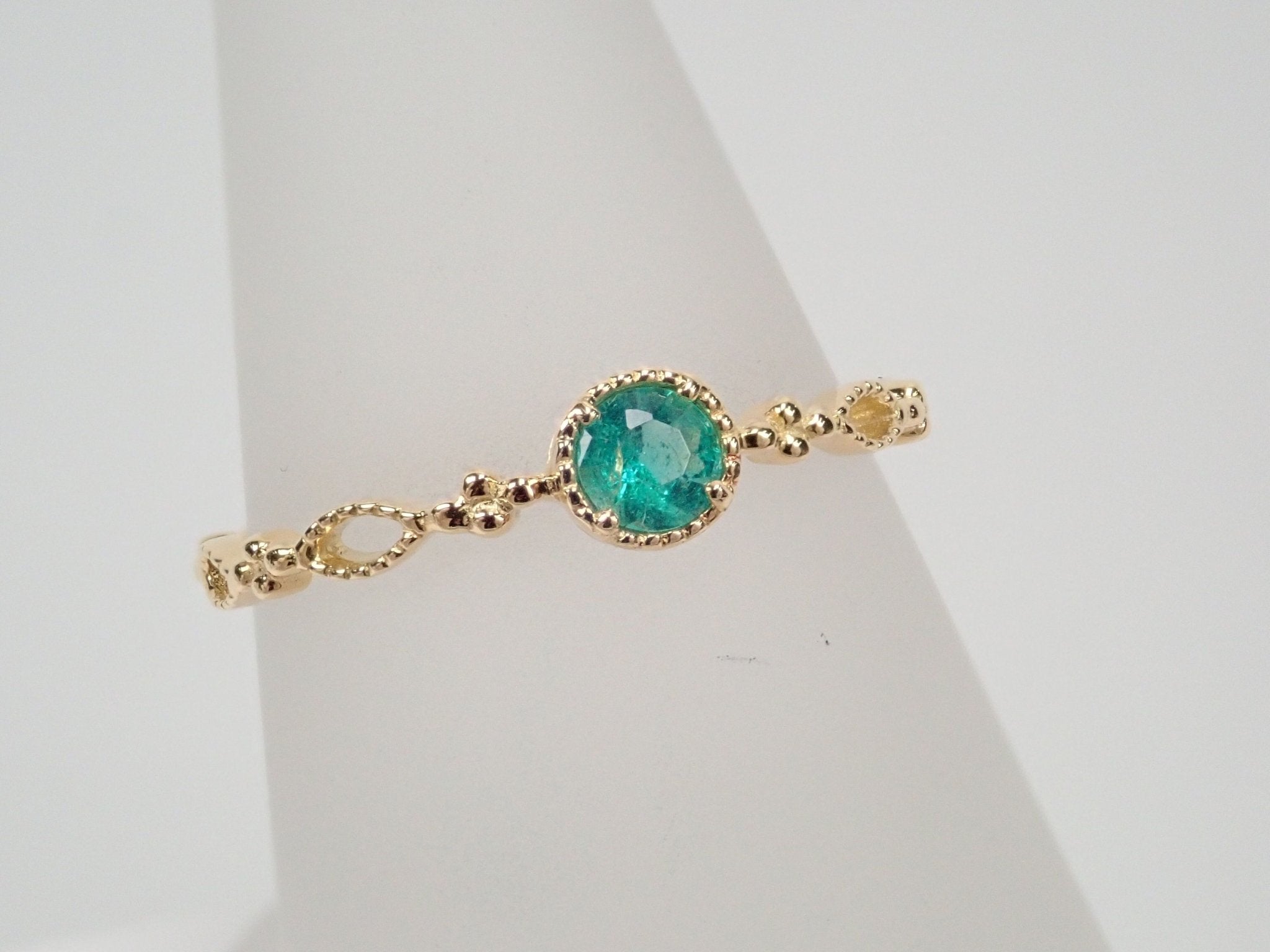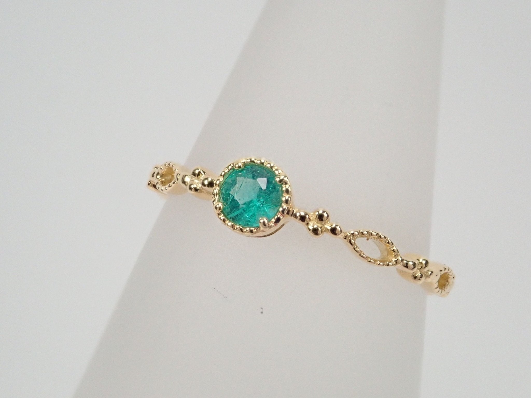 落ち着いた品のある色であるエメラルドグリーンが美しいエメラルドのリング。繊細なレースのようなデザインは品良くエメラルドを際立たせ、アンティークジュエリーにような味わい深さもあります。