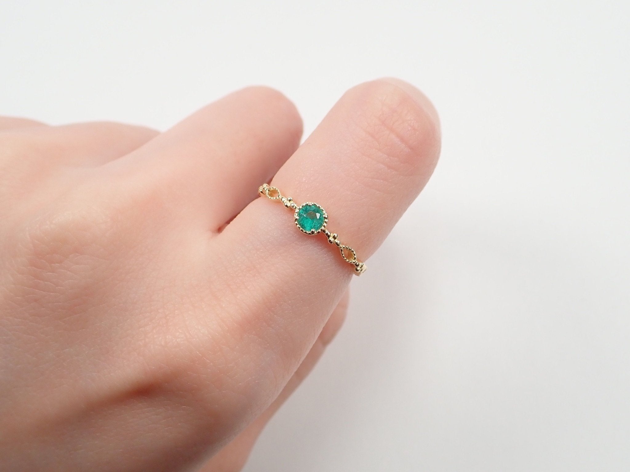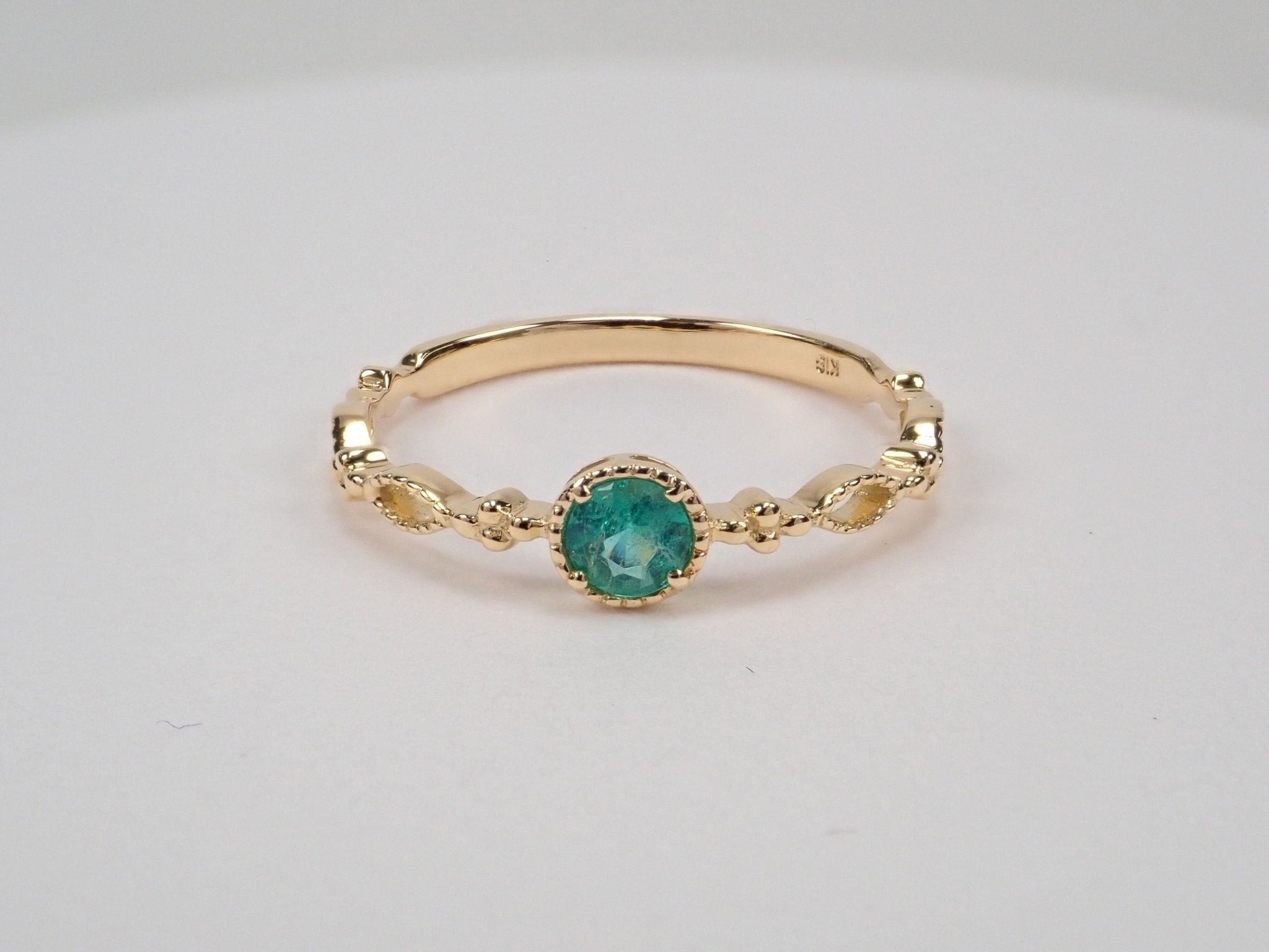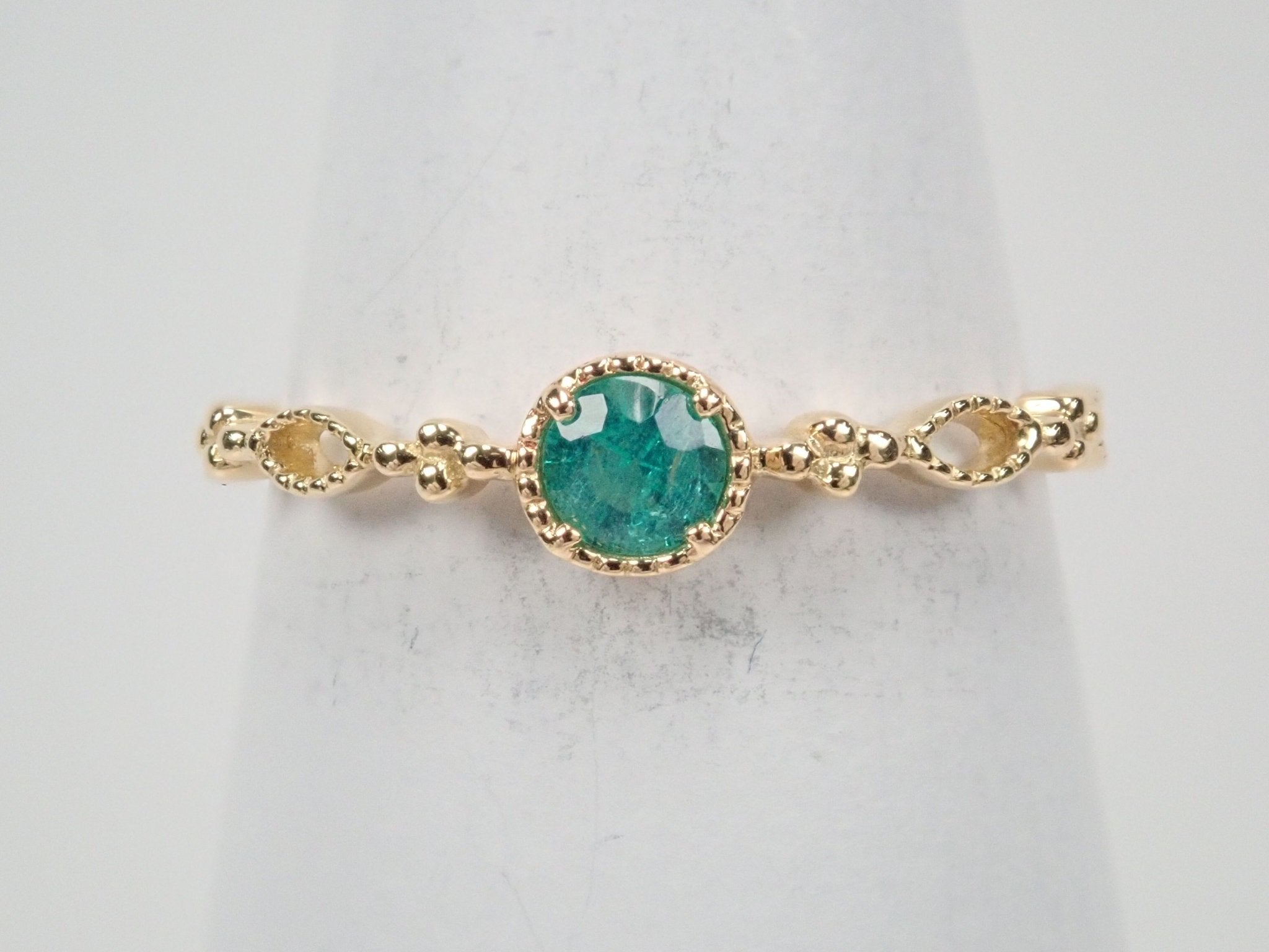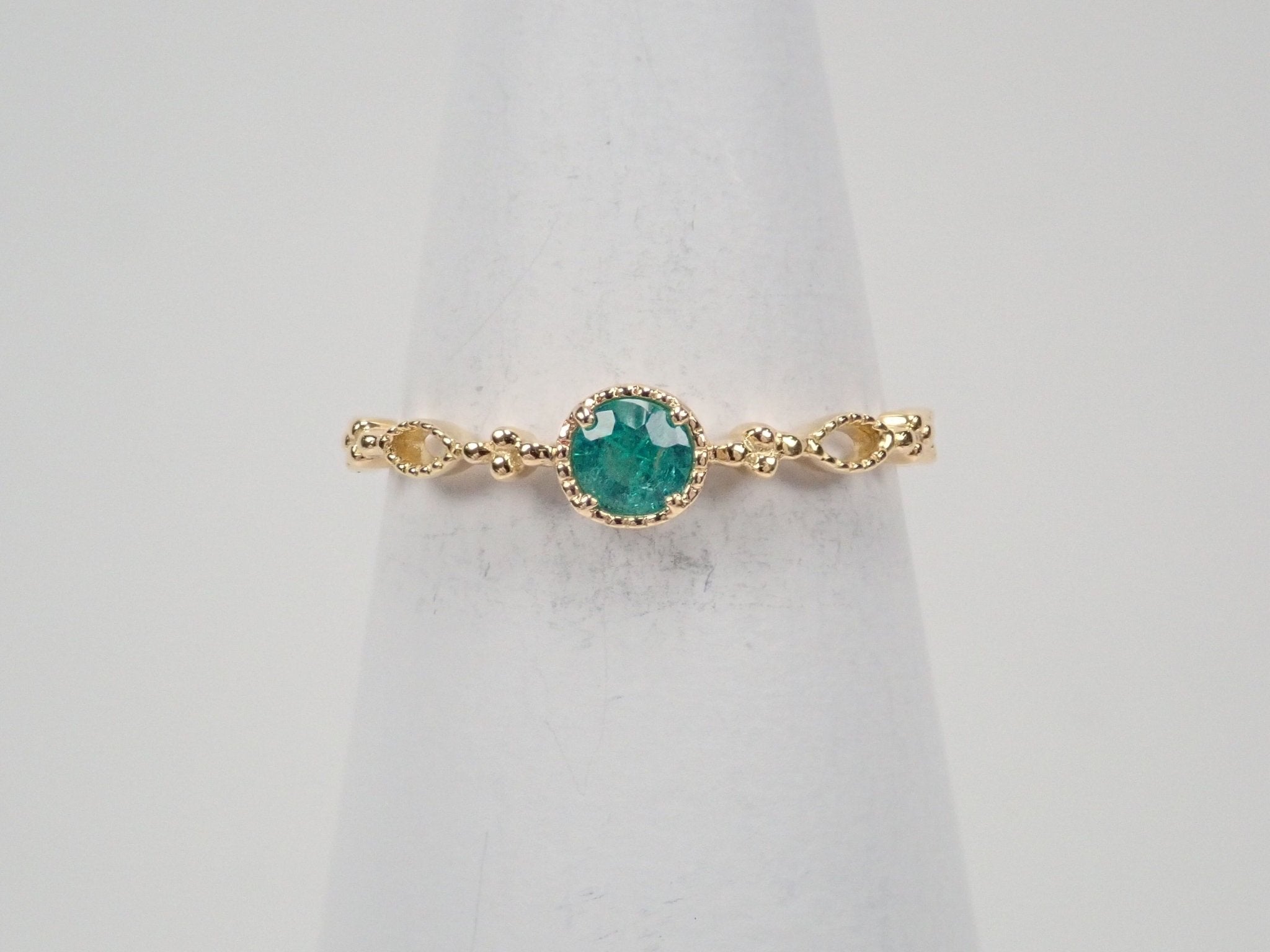 落ち着いた品のある色であるエメラルドグリーンが美しいエメラルドのリング。繊細なレースのようなデザインは品良くエメラルドを際立たせ、アンティークジュエリーにような味わい深さもあります。