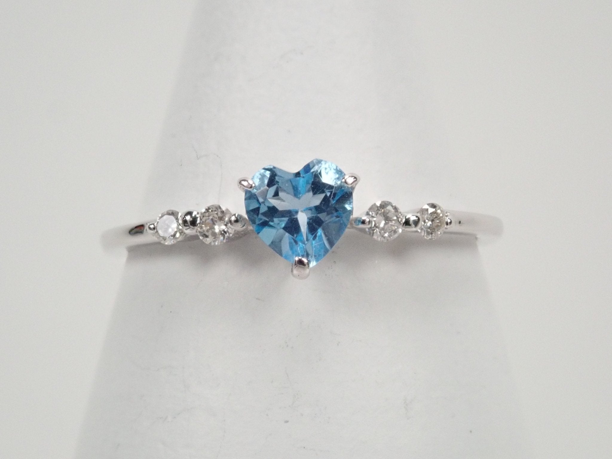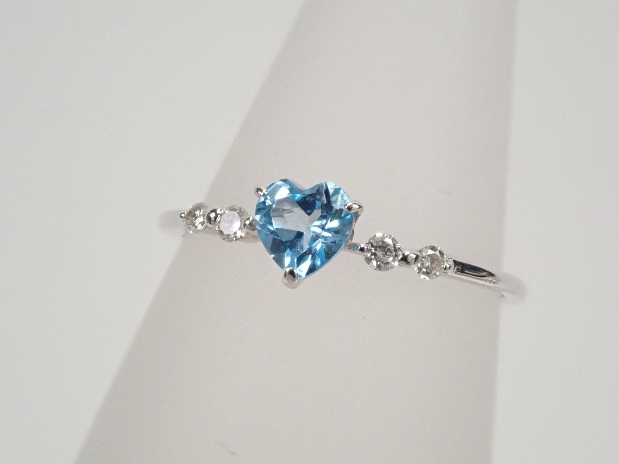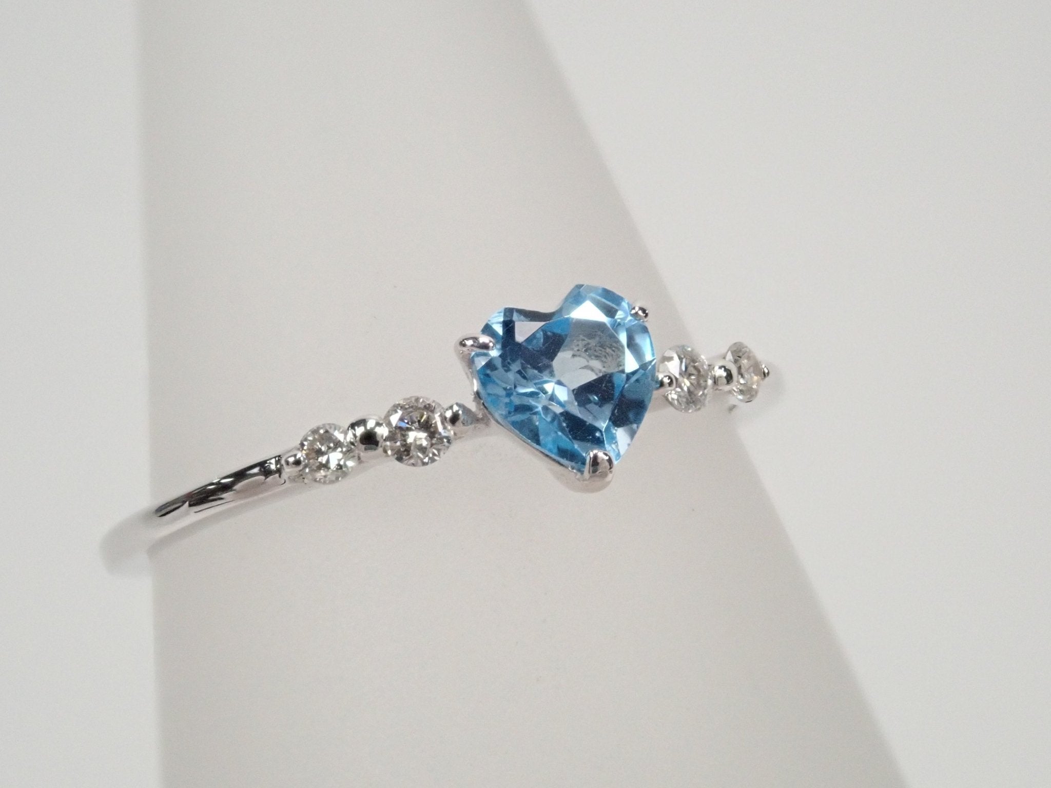 抜けるような透明感と鮮やかな水色が美しいブルートパーズ。両サイドにはダイヤモンドが施され、涼しげな印象に。ハート型のカットは可愛らしさがありながら甘くなりすぎず、さりげなくつけられそうですね♪