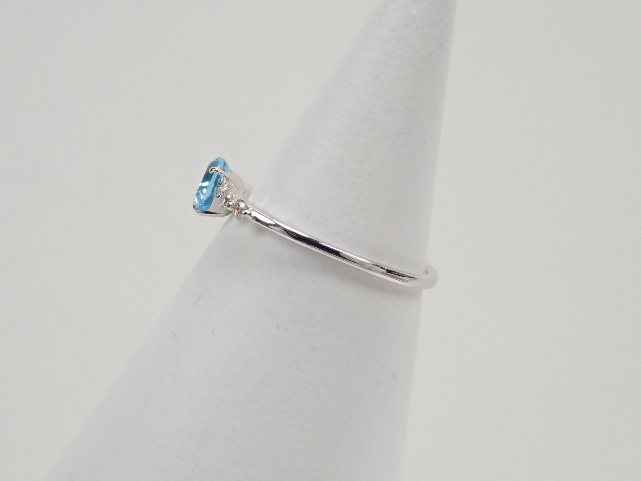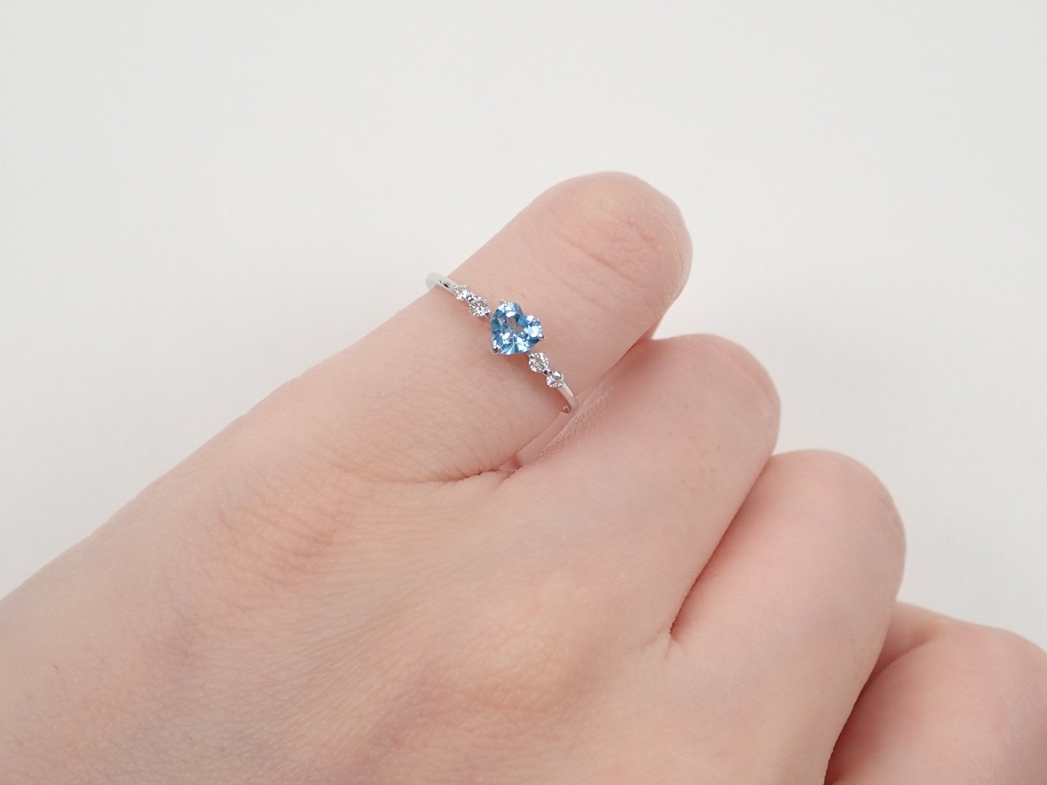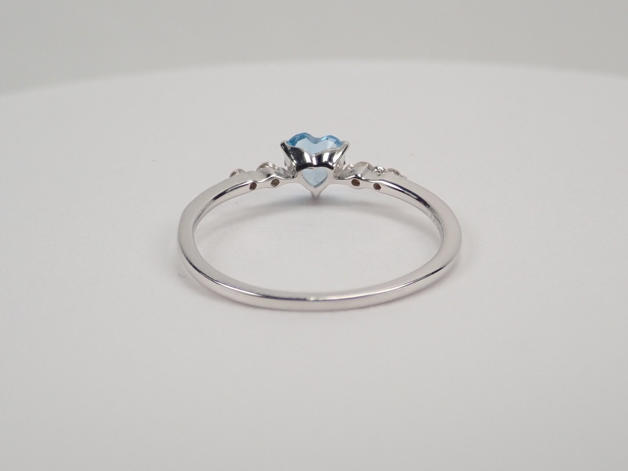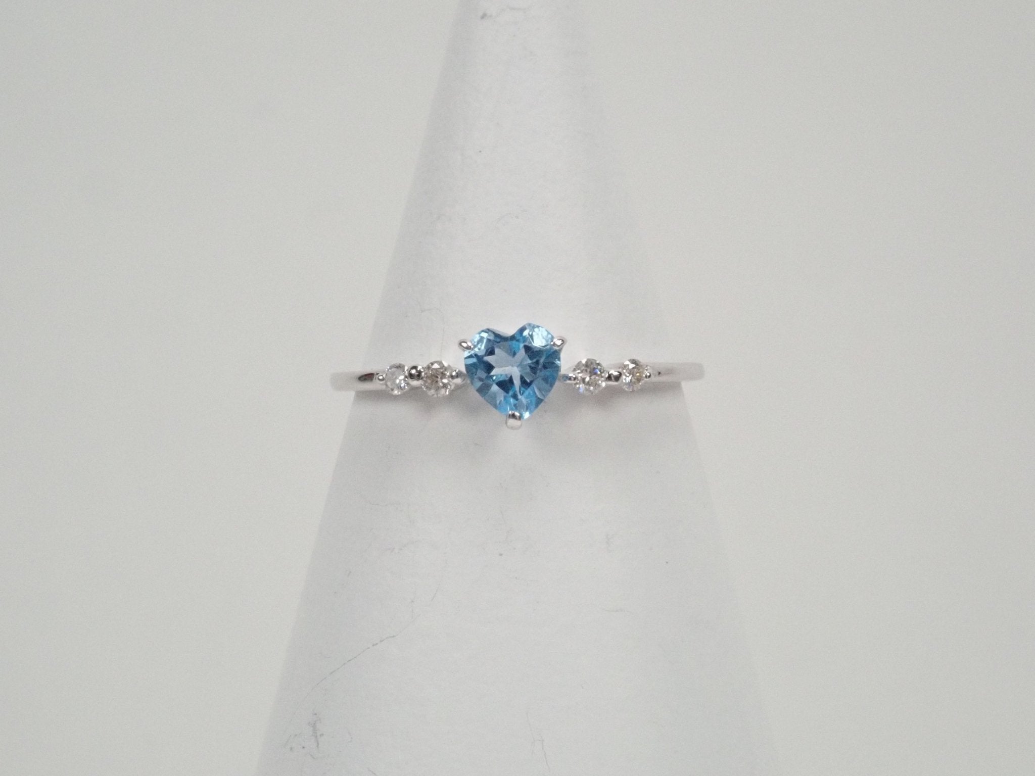 抜けるような透明感と鮮やかな水色が美しいブルートパーズ。両サイドにはダイヤモンドが施され、涼しげな印象に。ハート型のカットは可愛らしさがありながら甘くなりすぎず、さりげなくつけられそうですね♪