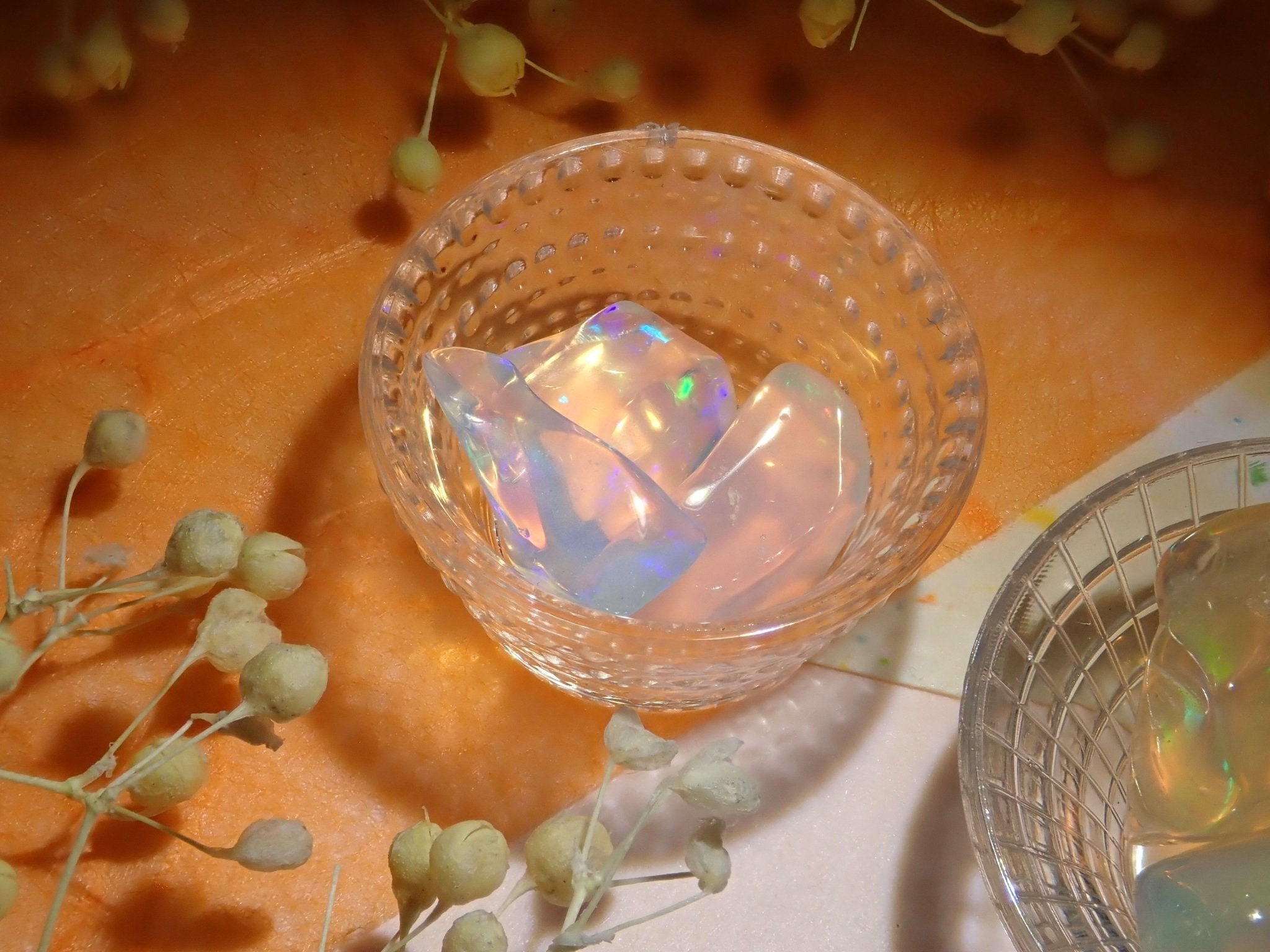 虹色の光のゆらめきが特徴の宝石、オパール。オパールは種類が多彩で様々な表情を見せる宝石。この魅力に取り憑かれオパールだけをコレクションする人もいるほど。撮影はペンライトを用いて行っています。