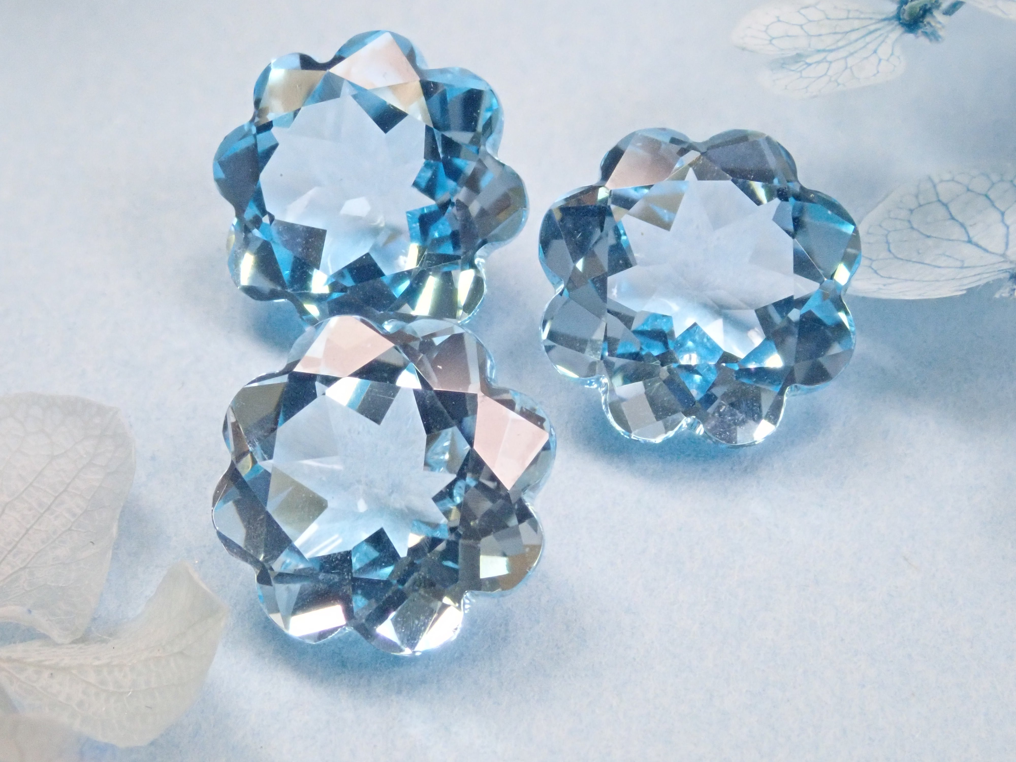 こちらはお花の形にカットしたスカイブルートパーズを1石をお送りします。キズカケ:S・インクルージョン:Sランクのルースを厳選しております。約10mmサイズです。