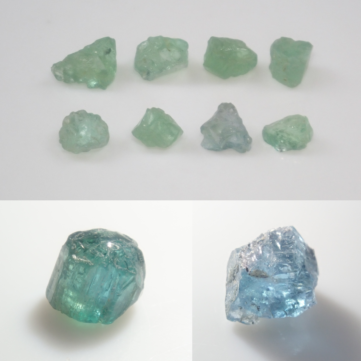 ブラジル産のパライバトルマリン原石は、それぞれブルー系、グリーン系が一つずつで、どちらも透明感がある美しいものを選んでいます。こちらにはソーティングがついています。