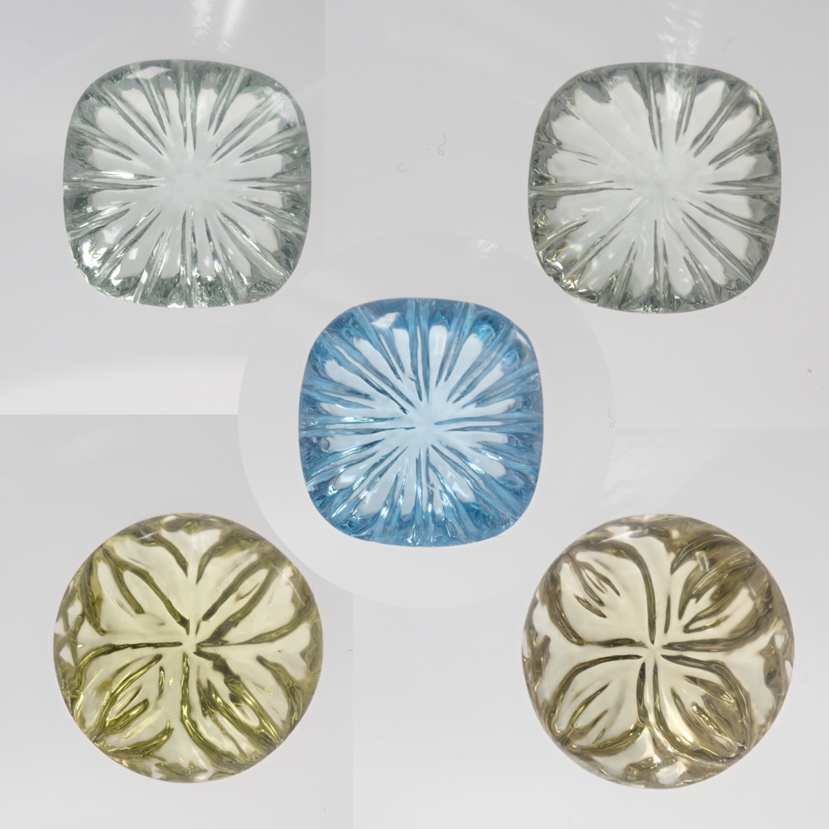 宝石の種類はグリーンクォーツ、レモンクォーツ、ブルートパーズです。お花のような模様が宝石の美しさを引き立てます。こちらのカービングはインドにて研磨されたものです。