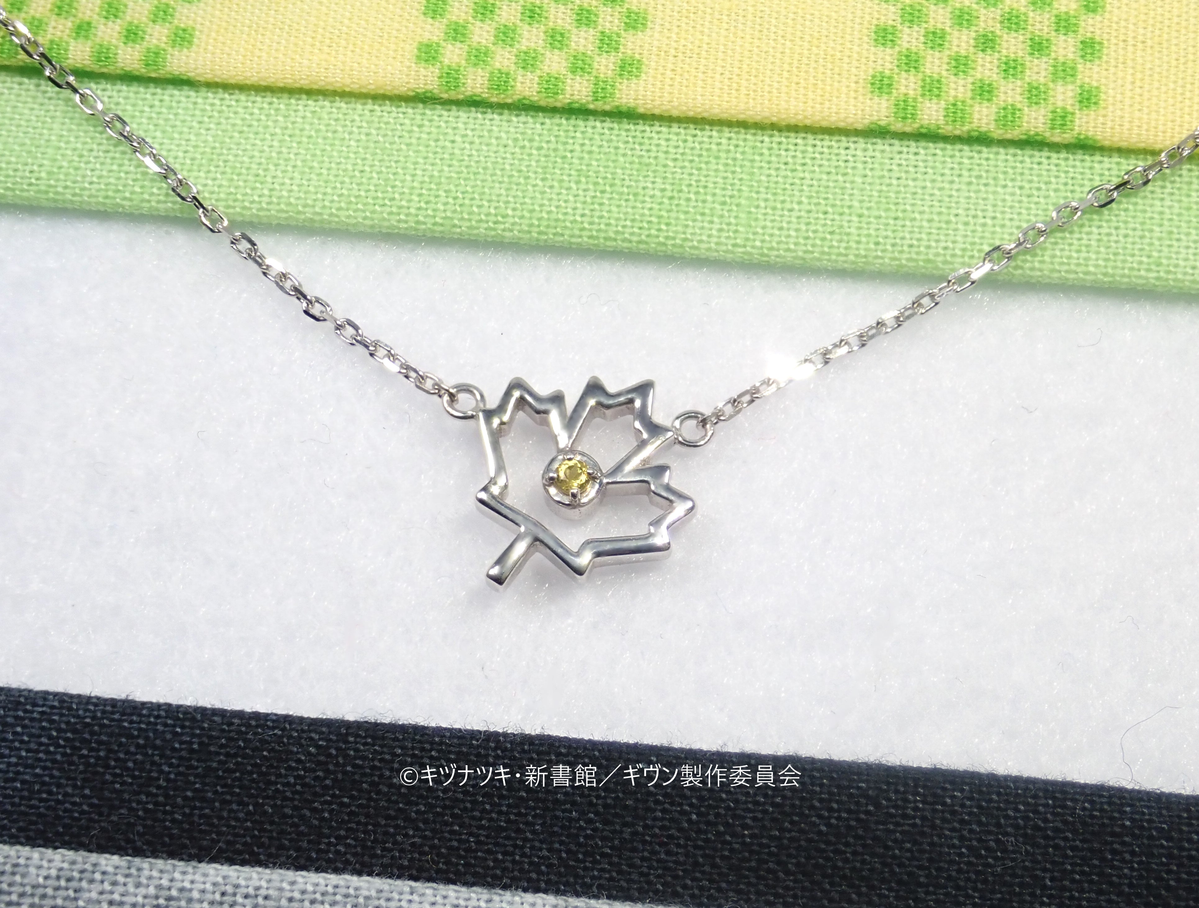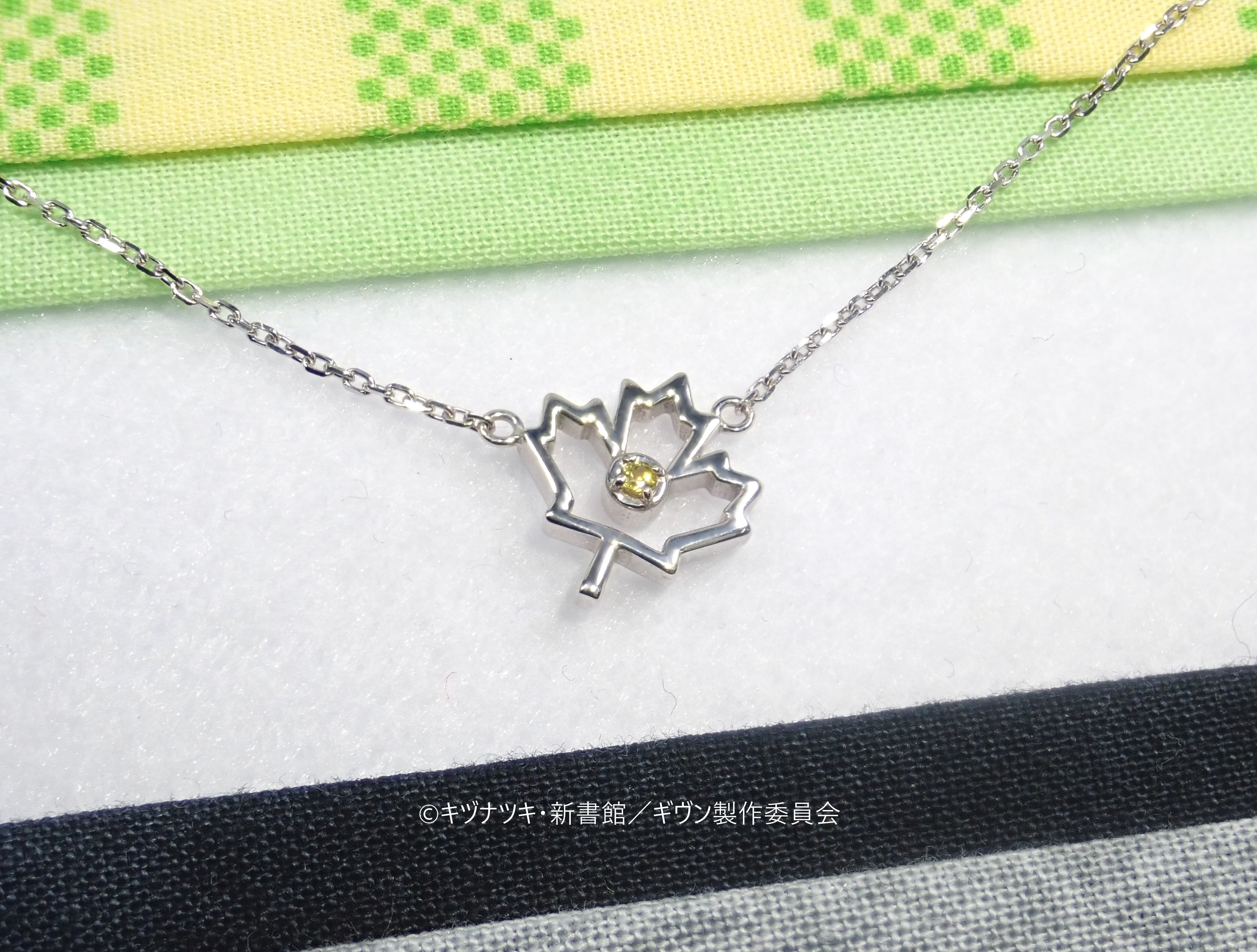 舞い落ちる葉をイメージしたデザインに、秋彦の誕生石であるトルマリンを添えて。色も産地も非常に豊富なこの宝石には、秋の訪れを告げるような黄色があります。石言葉は「充実」と「以心伝心」。