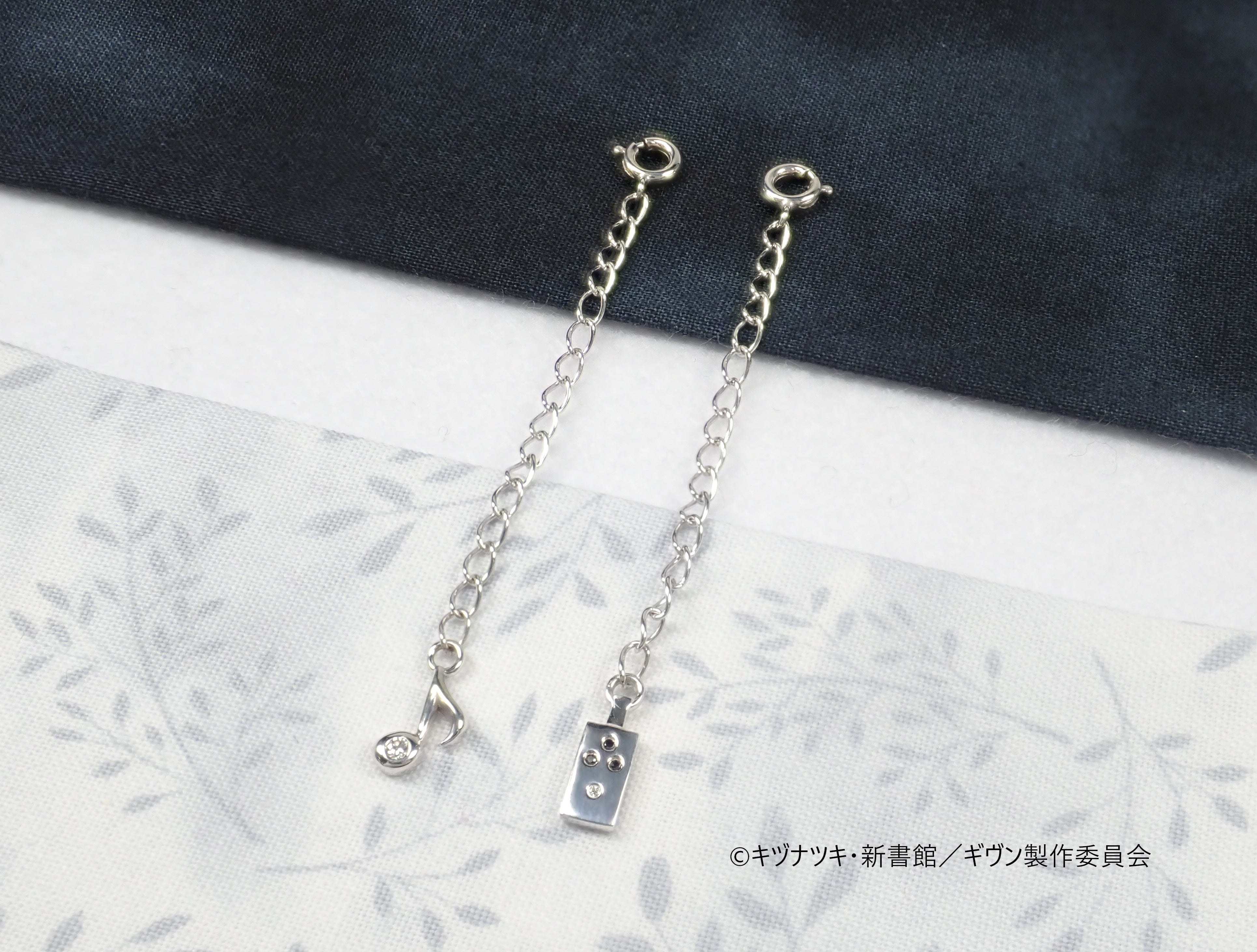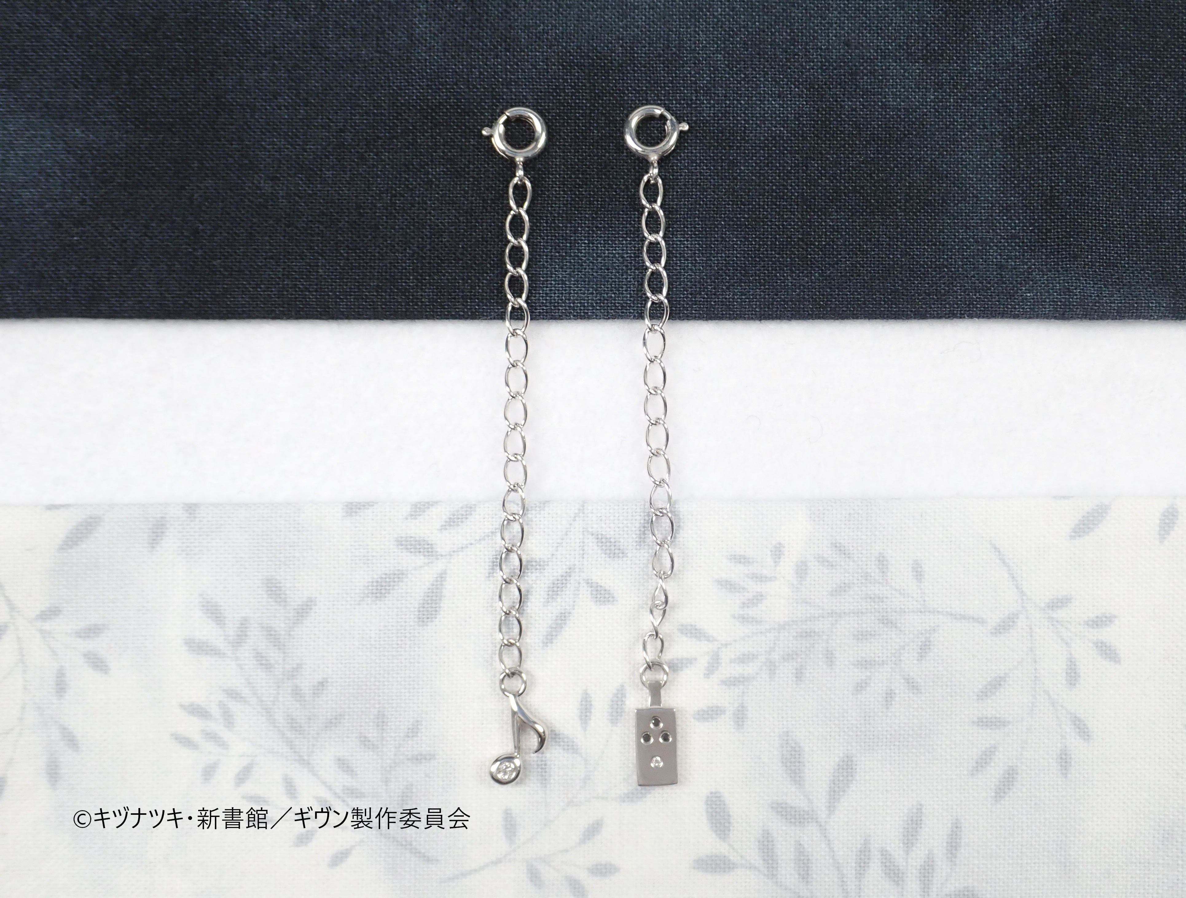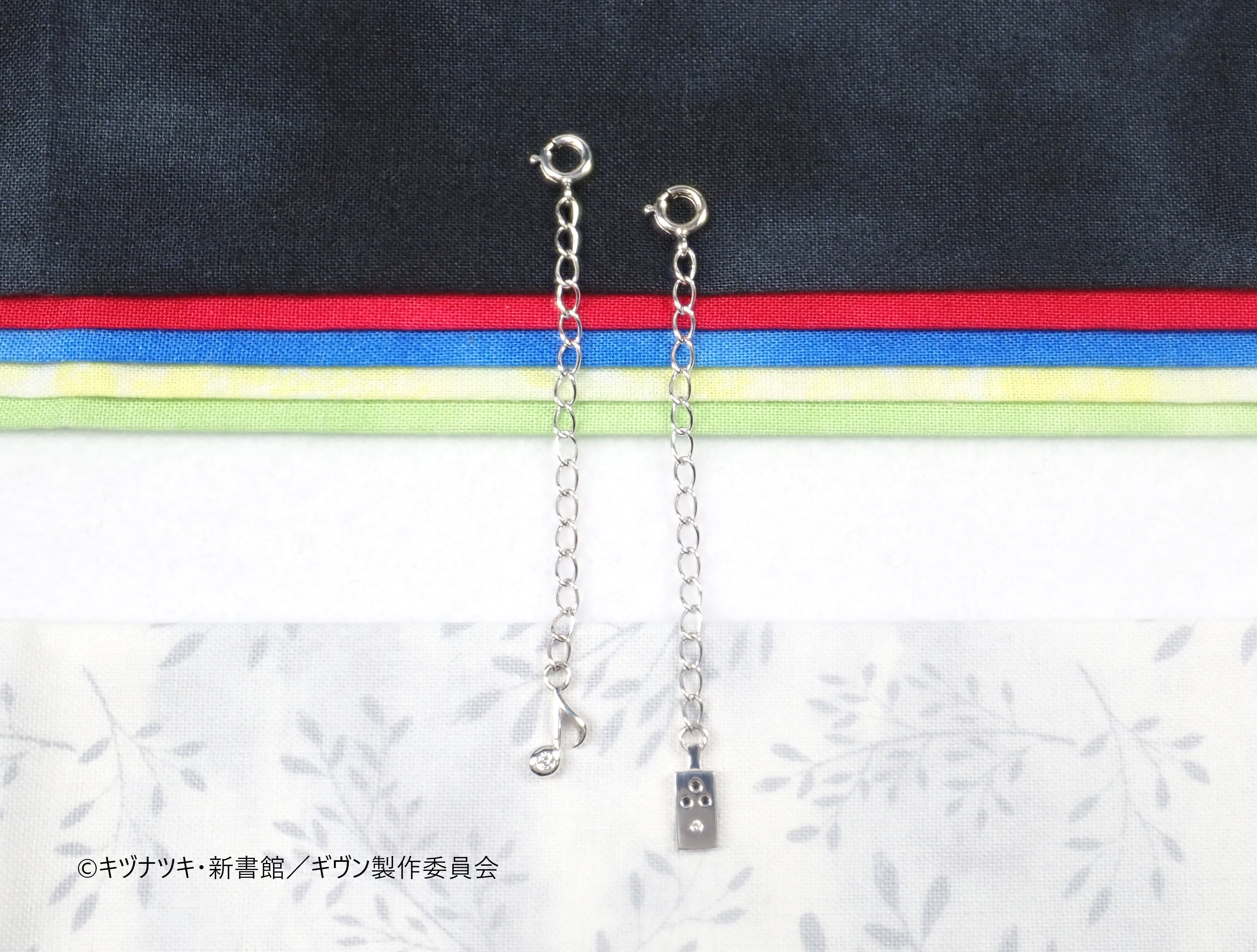 延長チェーンにもギヴンのエッセンスを散りばめています。エンドバーツはシンプルで合わせやすい音符Ver.と、作中で真冬たちが使用しているオーバードライブVer.をご用意いたしました。それぞれ、カラーレスダイヤモンドとブラックダイヤモンドをセットしたこだわりのデザインです。
