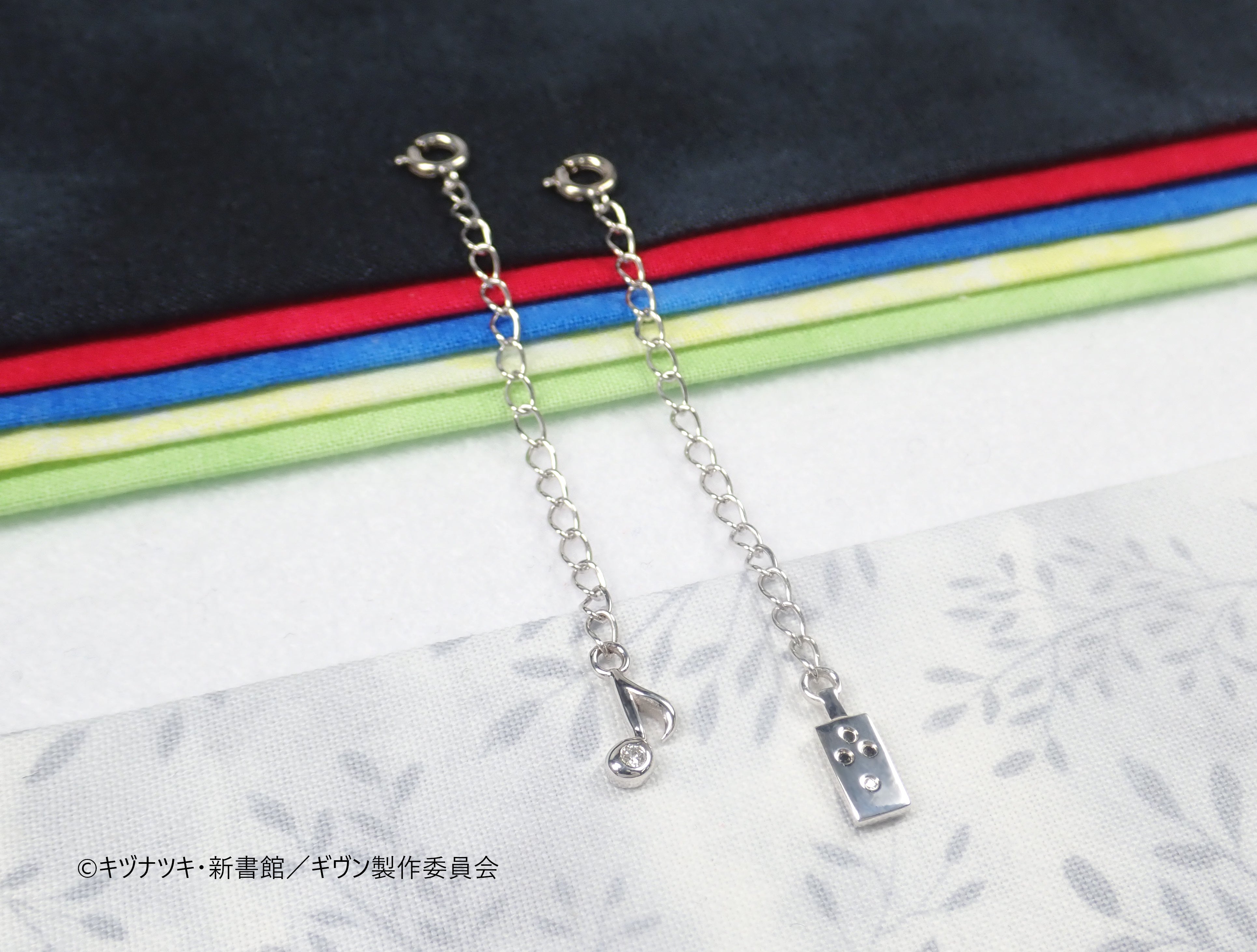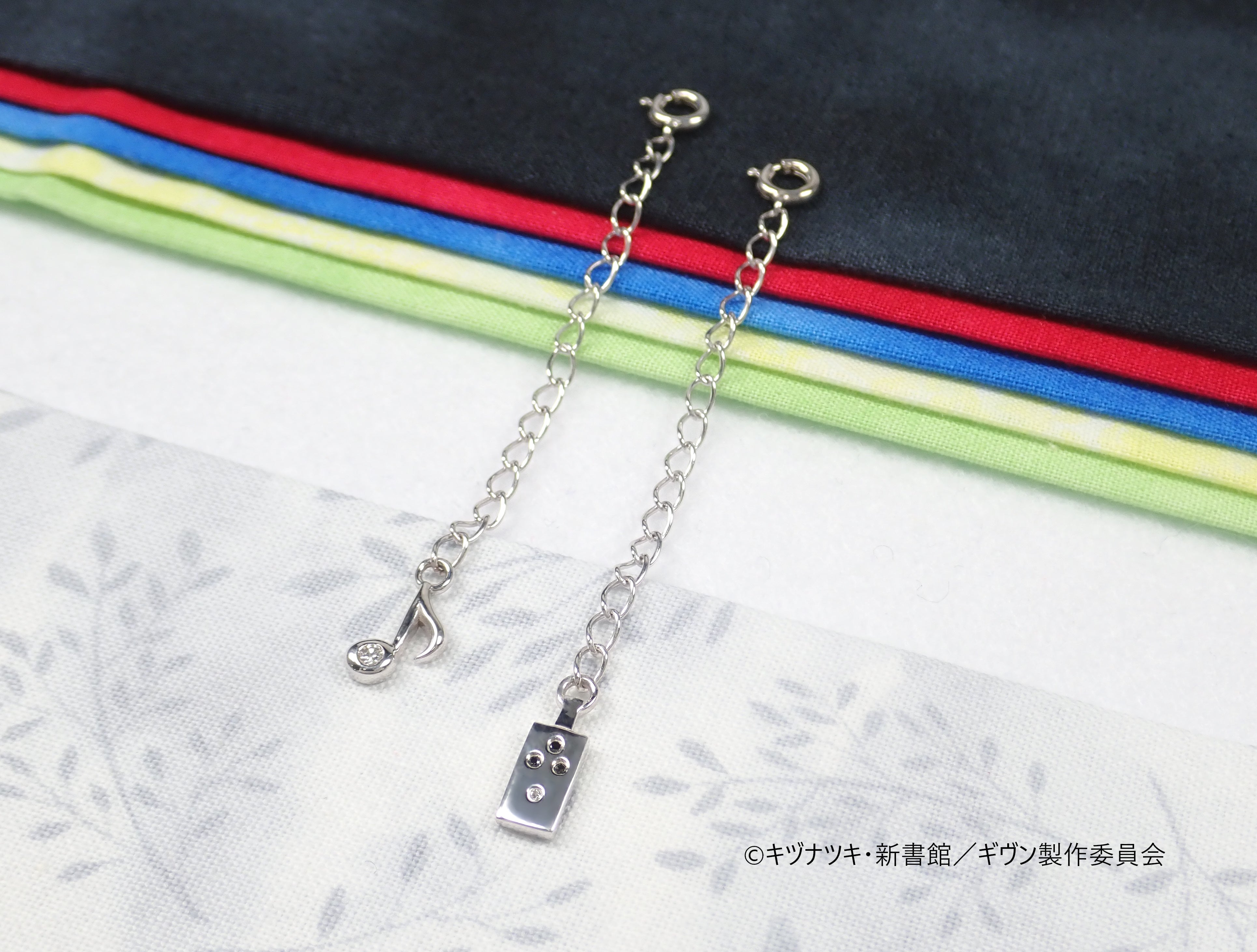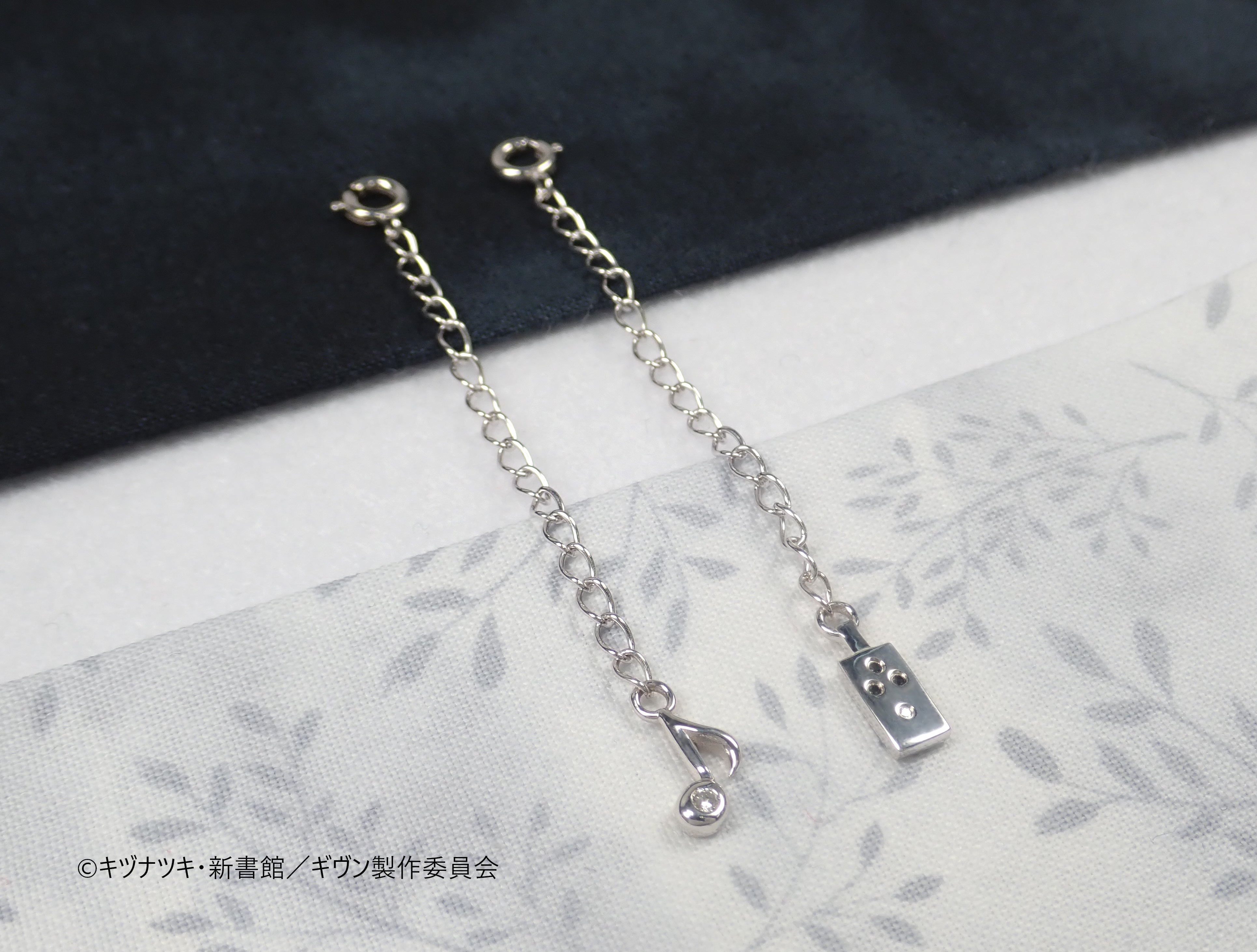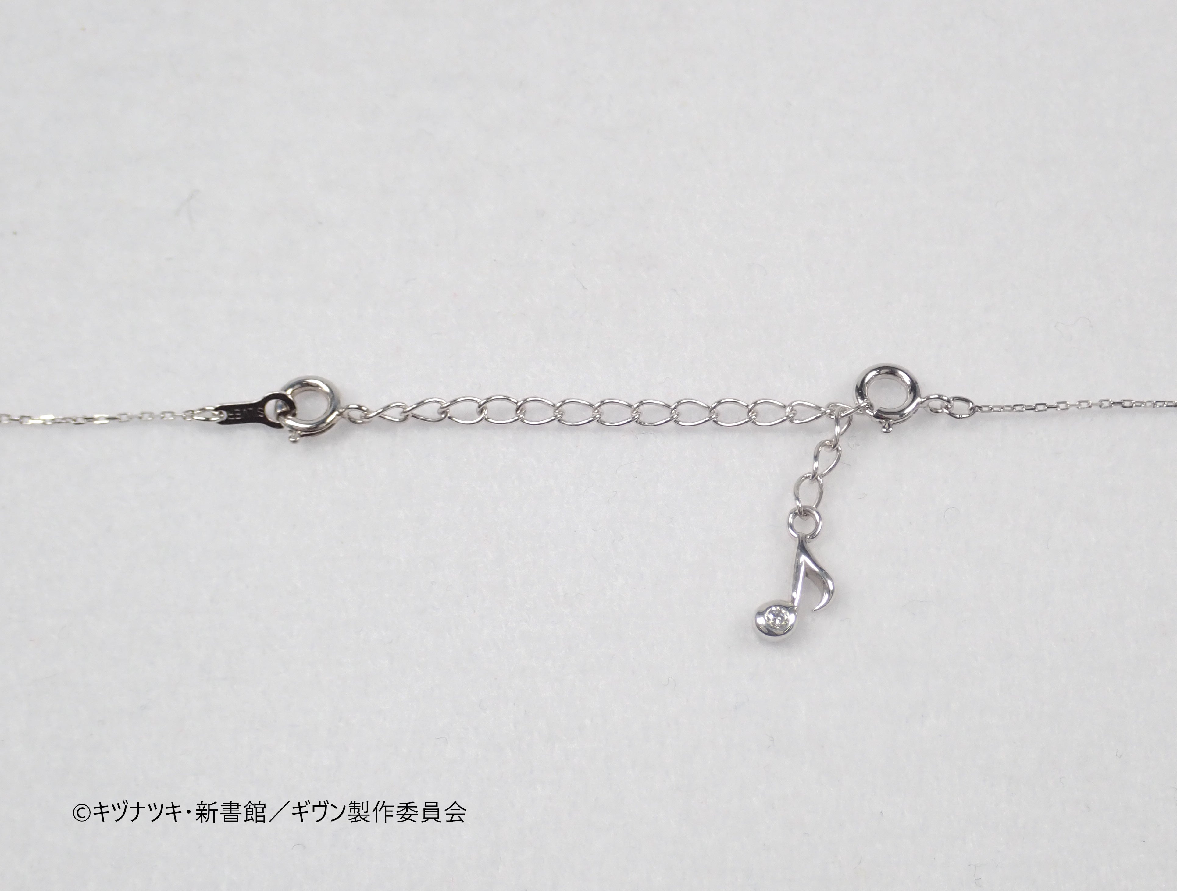 延長チェーンにもギヴンのエッセンスを散りばめています。エンドバーツはシンプルで合わせやすい音符Ver.と、作中で真冬たちが使用しているオーバードライブVer.をご用意いたしました。それぞれ、カラーレスダイヤモンドとブラックダイヤモンドをセットしたこだわりのデザインです。