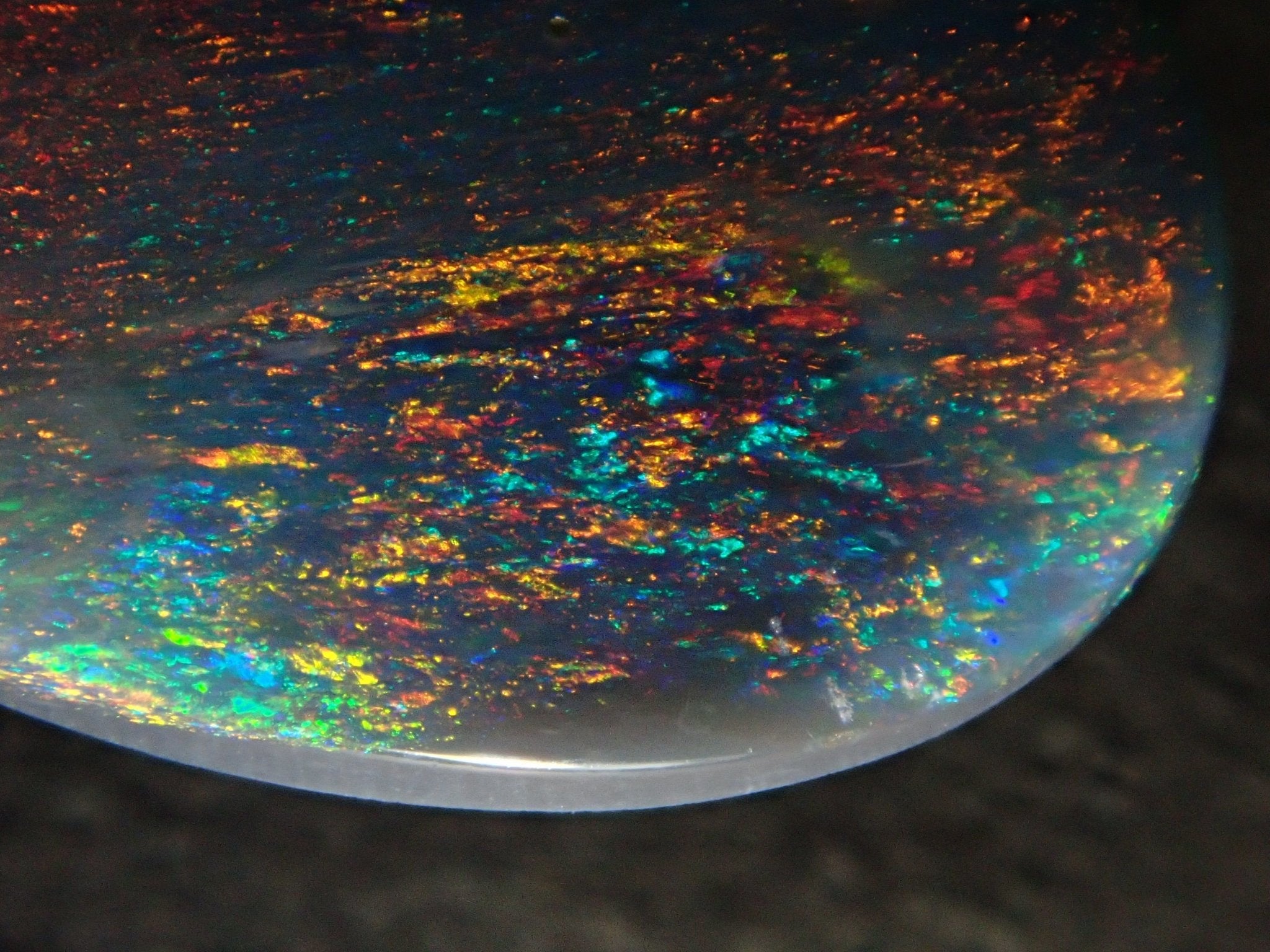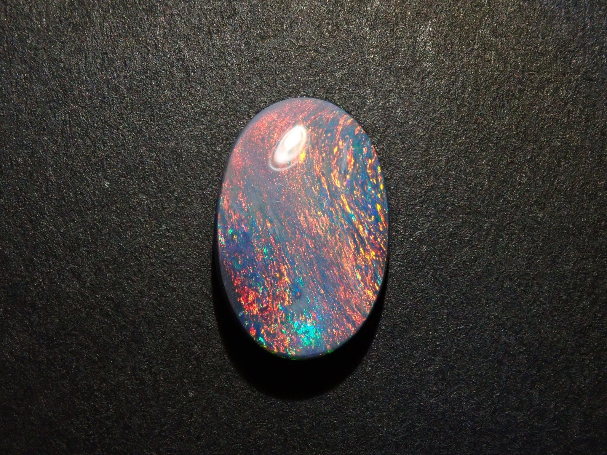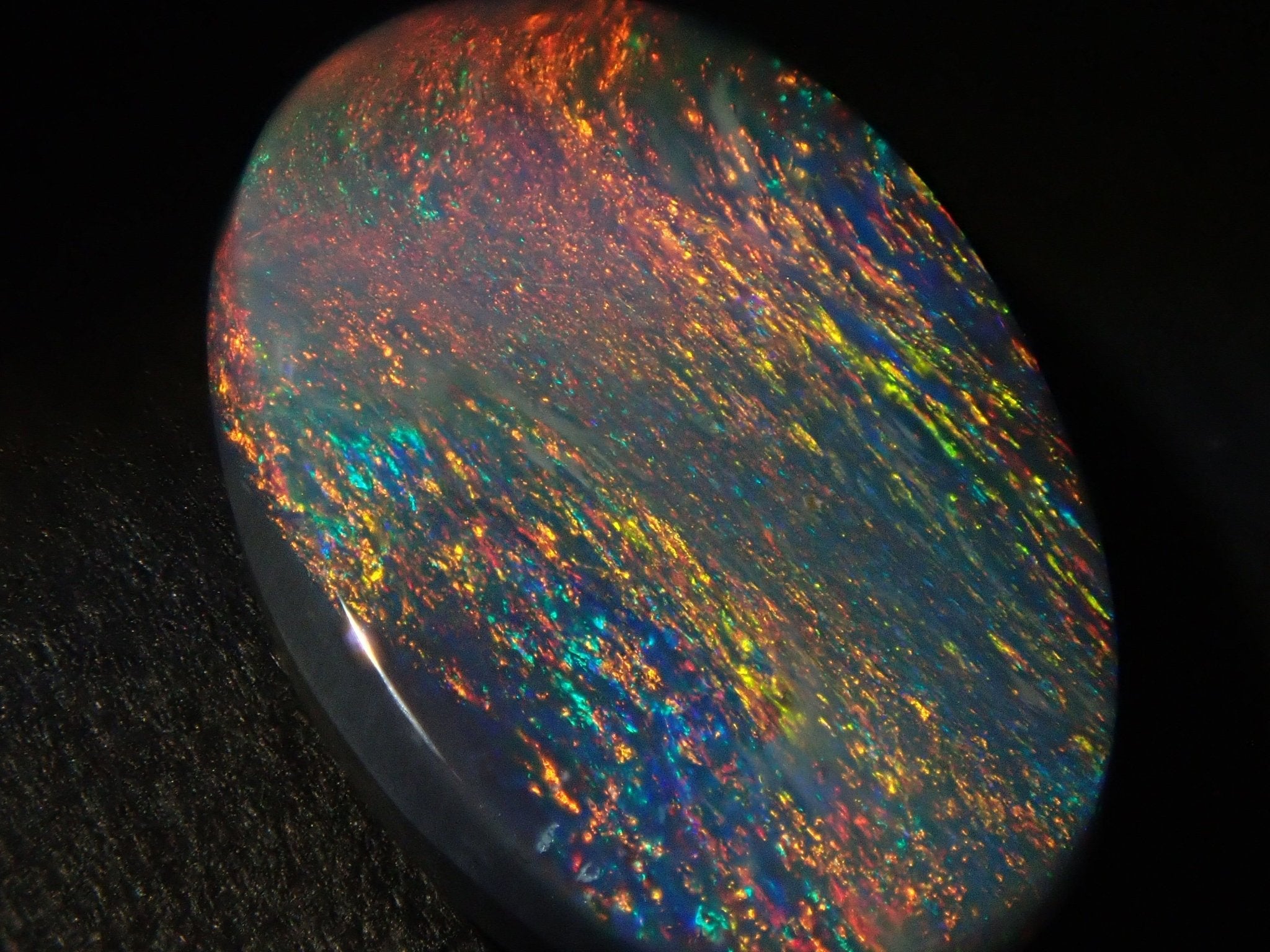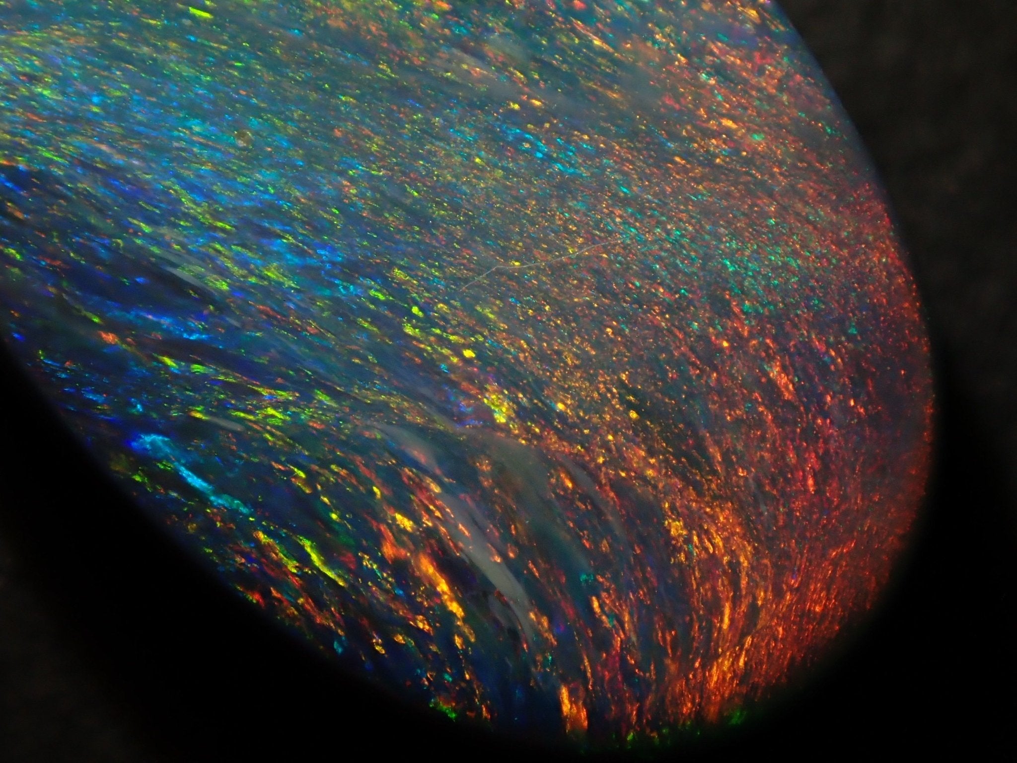 蛋白石是一種閃爍著彩虹色光芒的寶石。蛋白石有好幾種類型,但其中,黑蛋白石漆黑的黑暗中搖曳的紅色火焰美得讓人無法移開目光。底色包括黑色、藍色和灰色。照片是使用筆燈拍攝的。