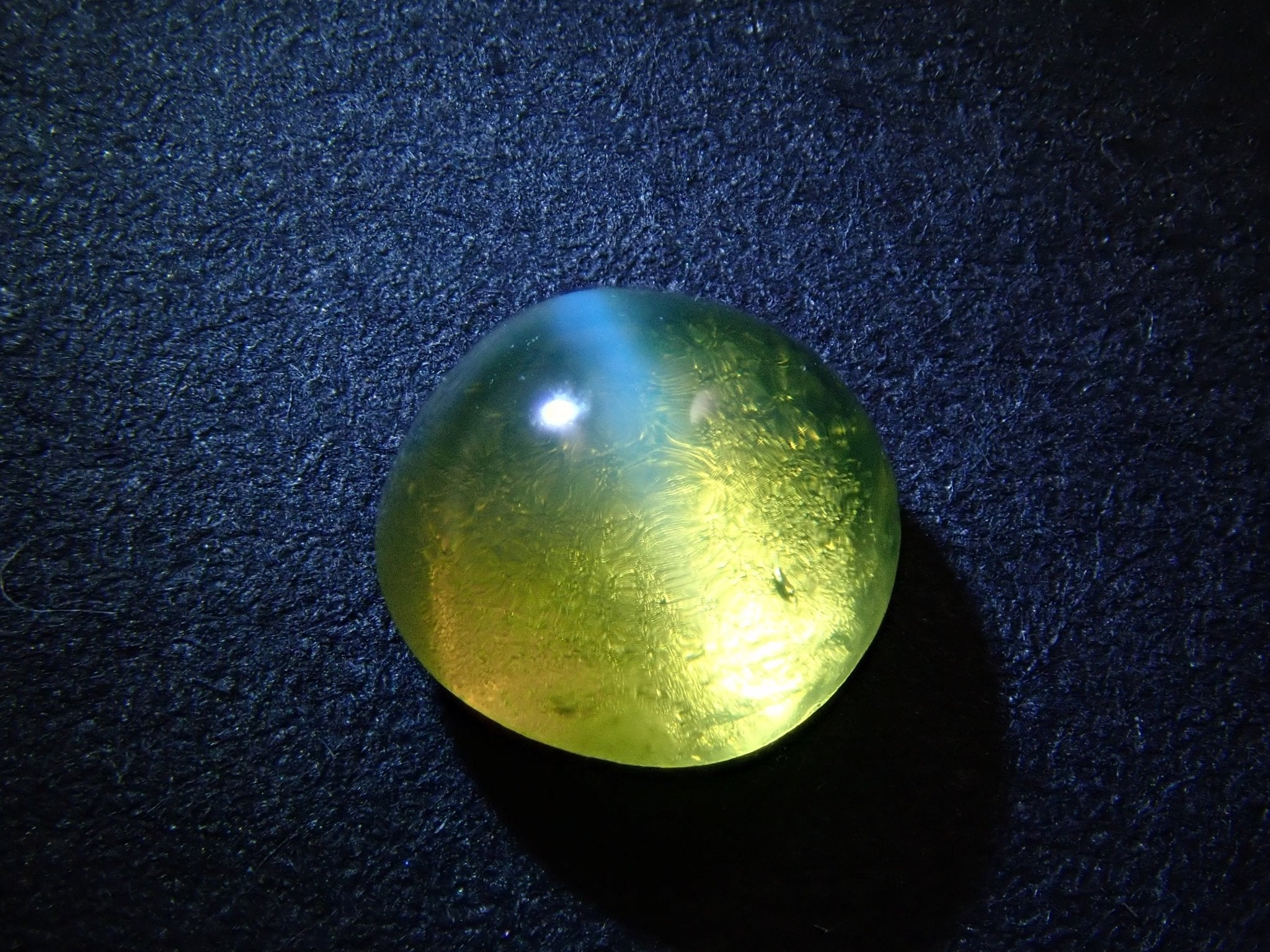 金綠寶石是一種有多種色調的寶石,從淺黃色到綠色再到深棕色。它是一種堅硬耐用的寶石。這是可以看到貓眼效果的類型,使用筆燈拍攝。石頭的背面基本上是未拋光的。