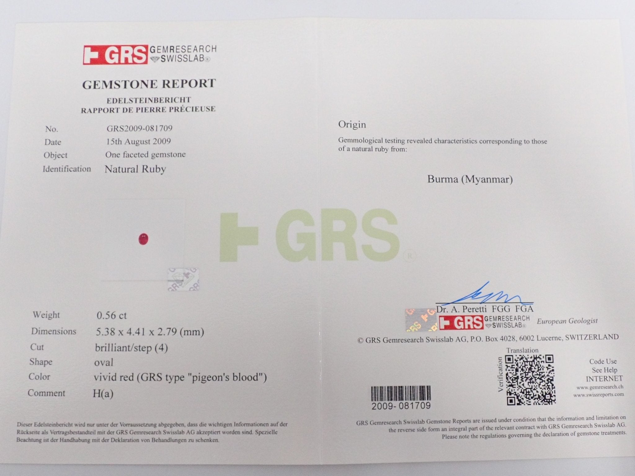 緬甸鴿血紅紅寶石 0.56 克拉裸石,附 GRS