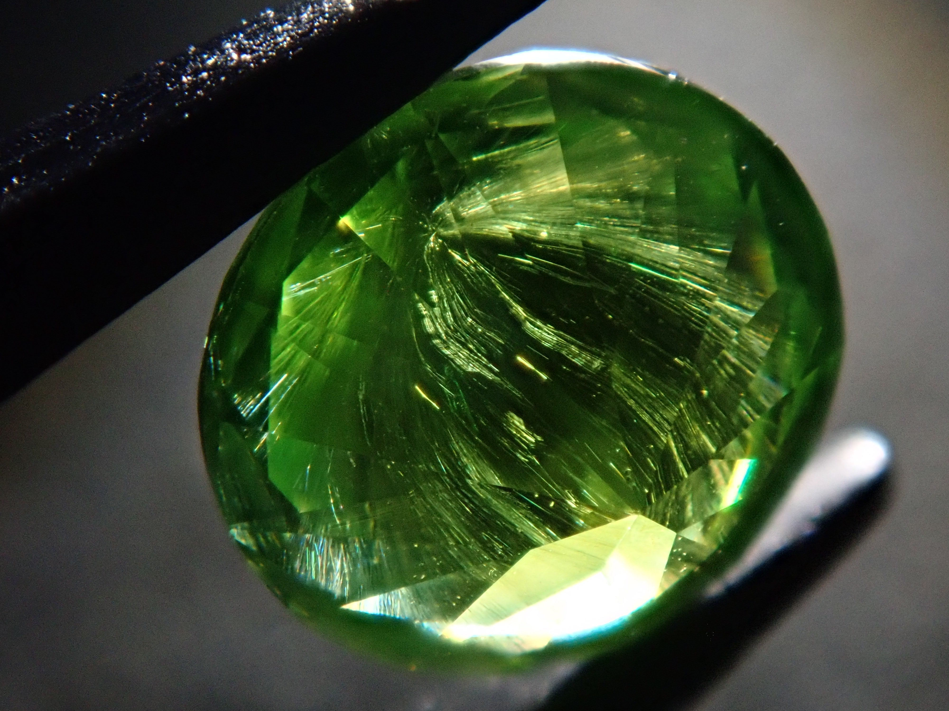 石榴石具有強烈的光色散和強烈的閃光。其中,這顆綠色的「濃綠榴石」是一種特別美麗且稀有的石榴石。這種類型稱為“馬尾”,內含物看起來像馬尾。馬尾的存在或不存在已透過顯微鏡檢查來確認。這是來自俄羅斯的稀有產品。一顆 1.1 克拉的大型俄羅斯濃綠榴石石榴石,帶有美麗的馬尾內含物。