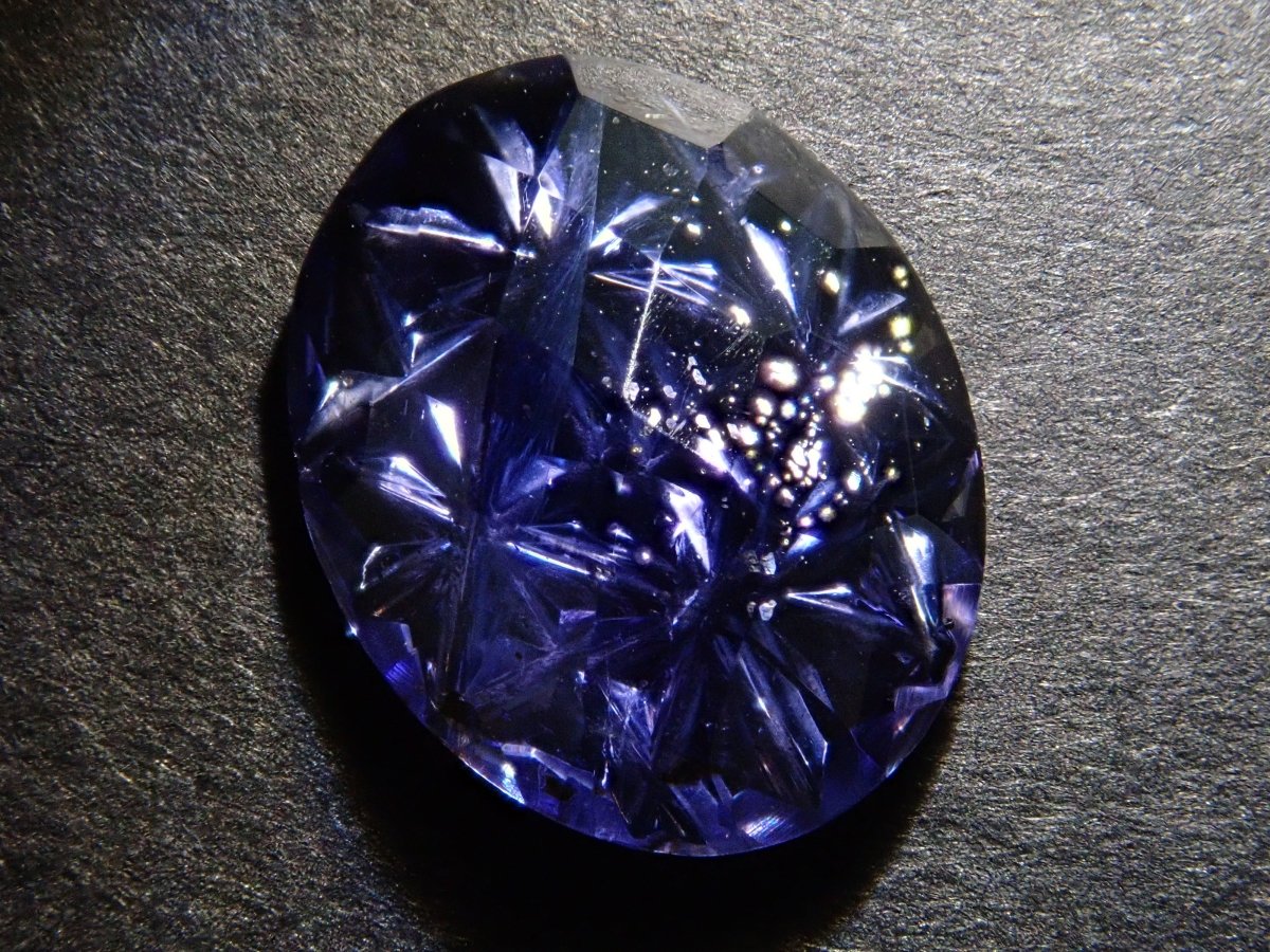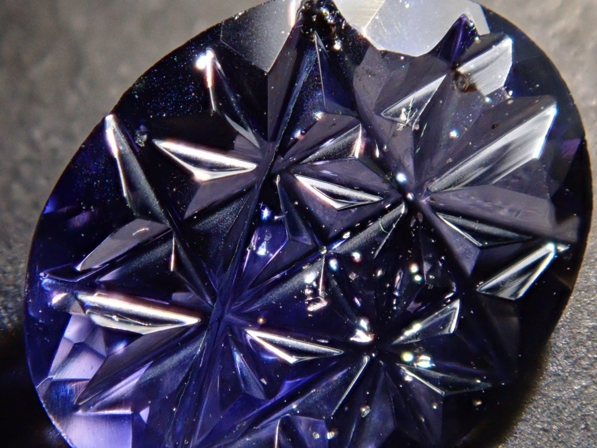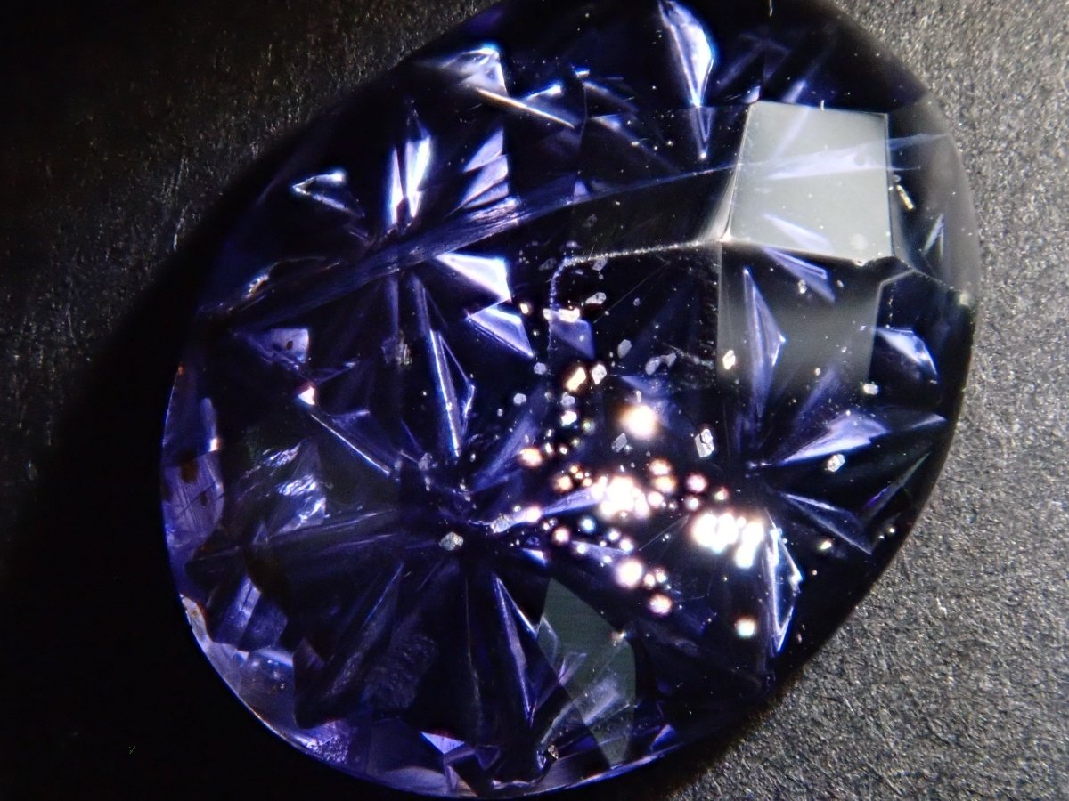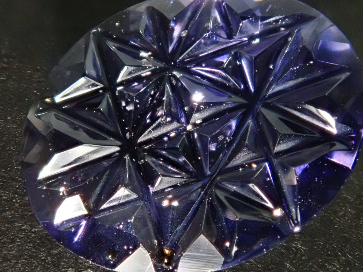 這是由清水寶石的代表清水幸雄先生和Jewelry Craft Fukasawa代表的深澤洋一先生兩位大師創作的甲州寶石切子的原創切工類型。清水先生負責刻面,深澤先生負責刻面。深藍色堇青石日光石猶如浩瀚的夜空,飾有被稱為 irodori 的精緻切割。底色較深,可欣賞清晰的切割線。