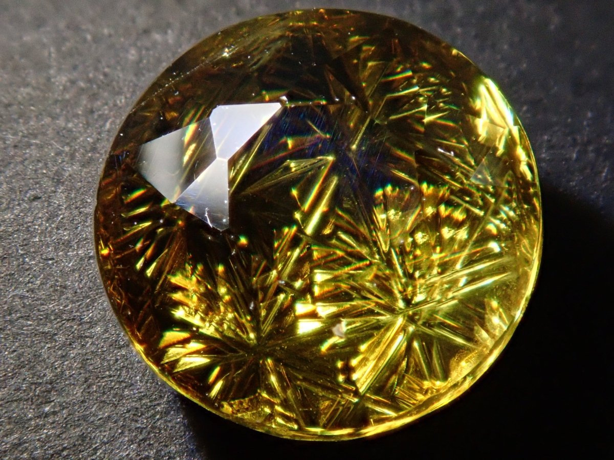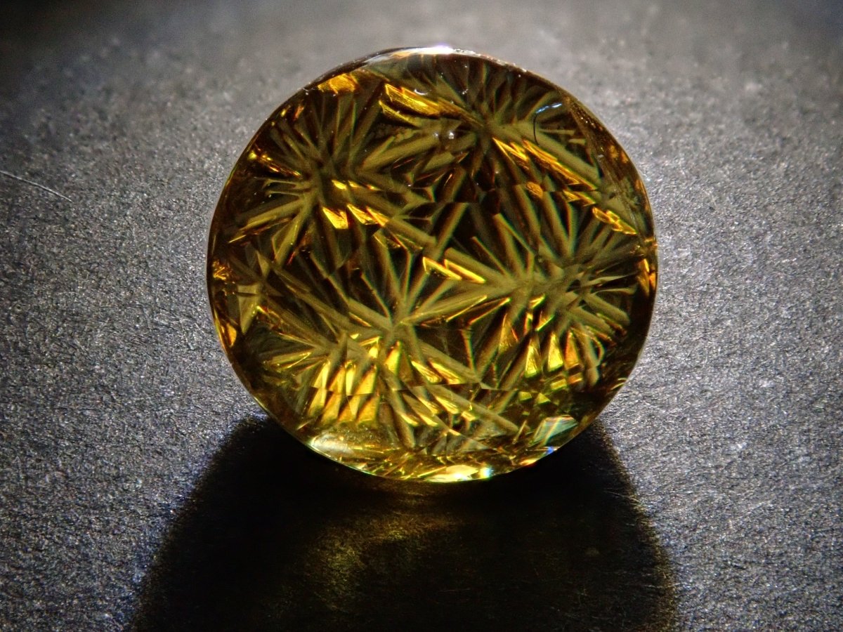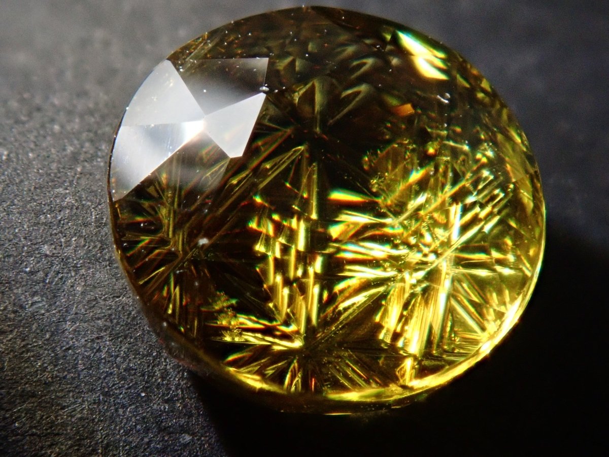 呈現出金色光芒和奢華火焰的榍石。它作為一種有吸引力的寶石而受到收藏家的歡迎,它散發出比鑽石更強大的火彩。輝度隨角度而快速變化的榍石。請在陽光下在手中滾動並觀察。請注意,有些照片是使用筆燈拍攝的。