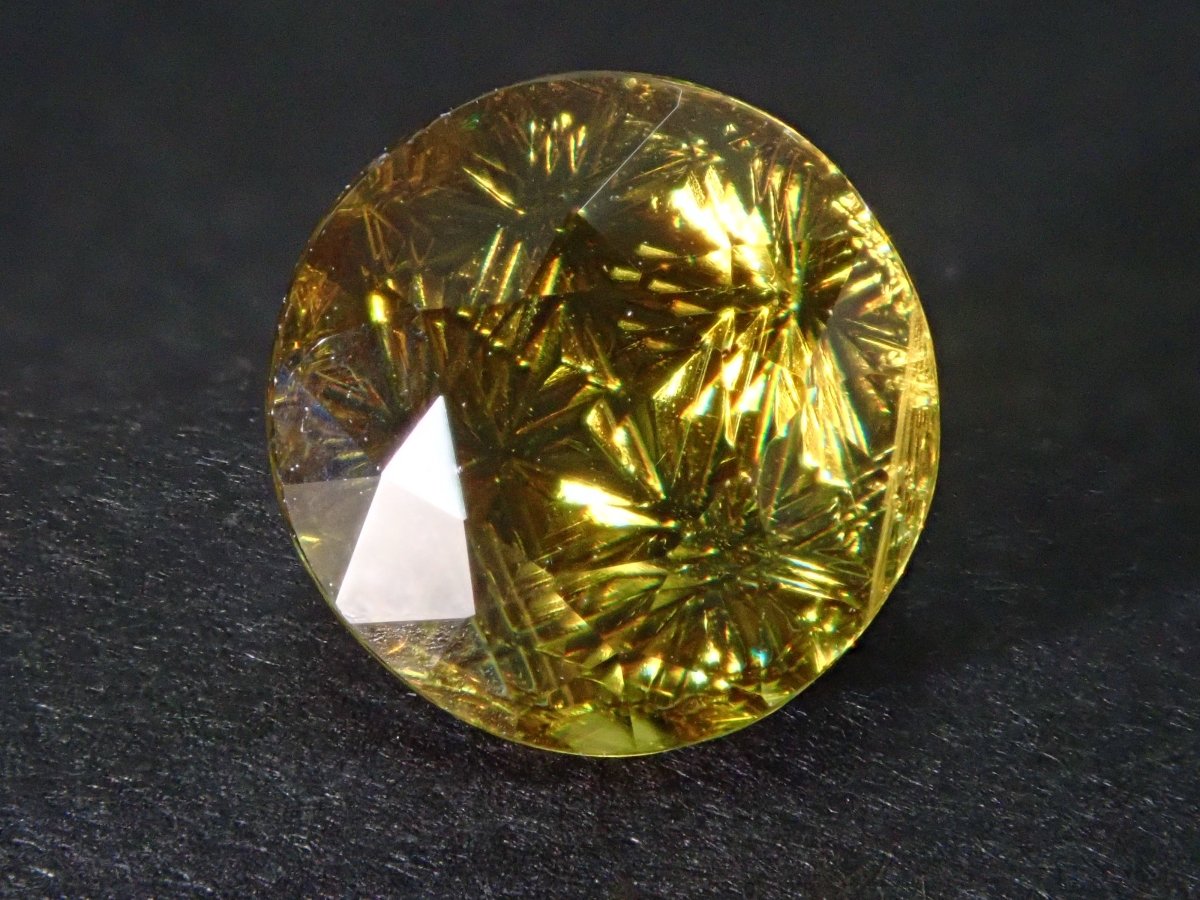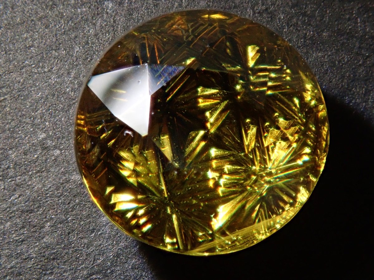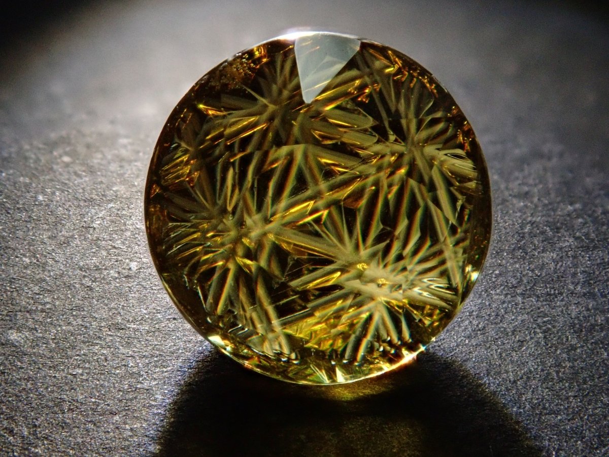呈現出金色光芒和奢華火焰的榍石。它作為一種有吸引力的寶石而受到收藏家的歡迎,它散發出比鑽石更強大的火彩。輝度隨角度而快速變化的榍石。請在陽光下在手中滾動並觀察。請注意,有些照片是使用筆燈拍攝的。