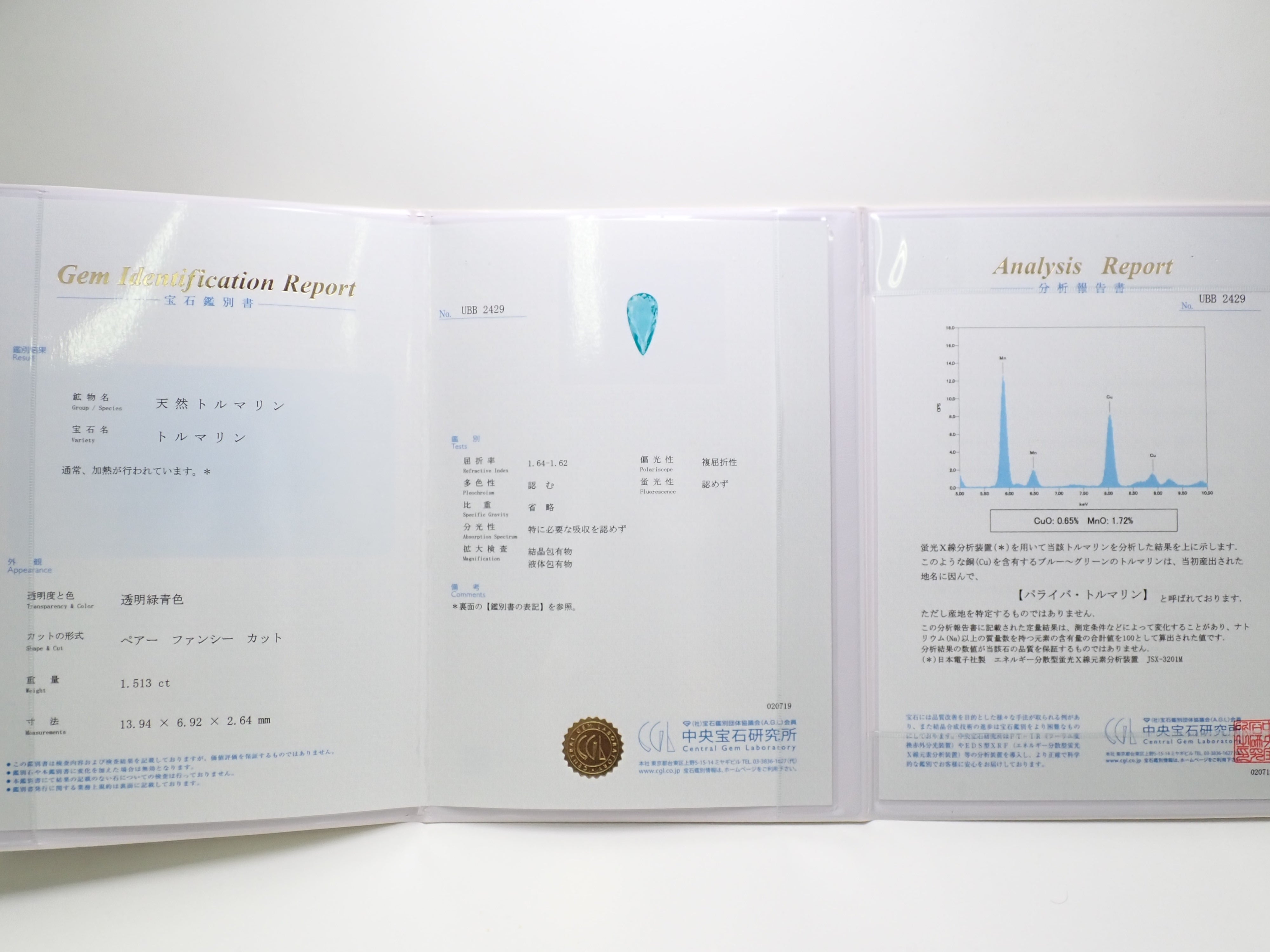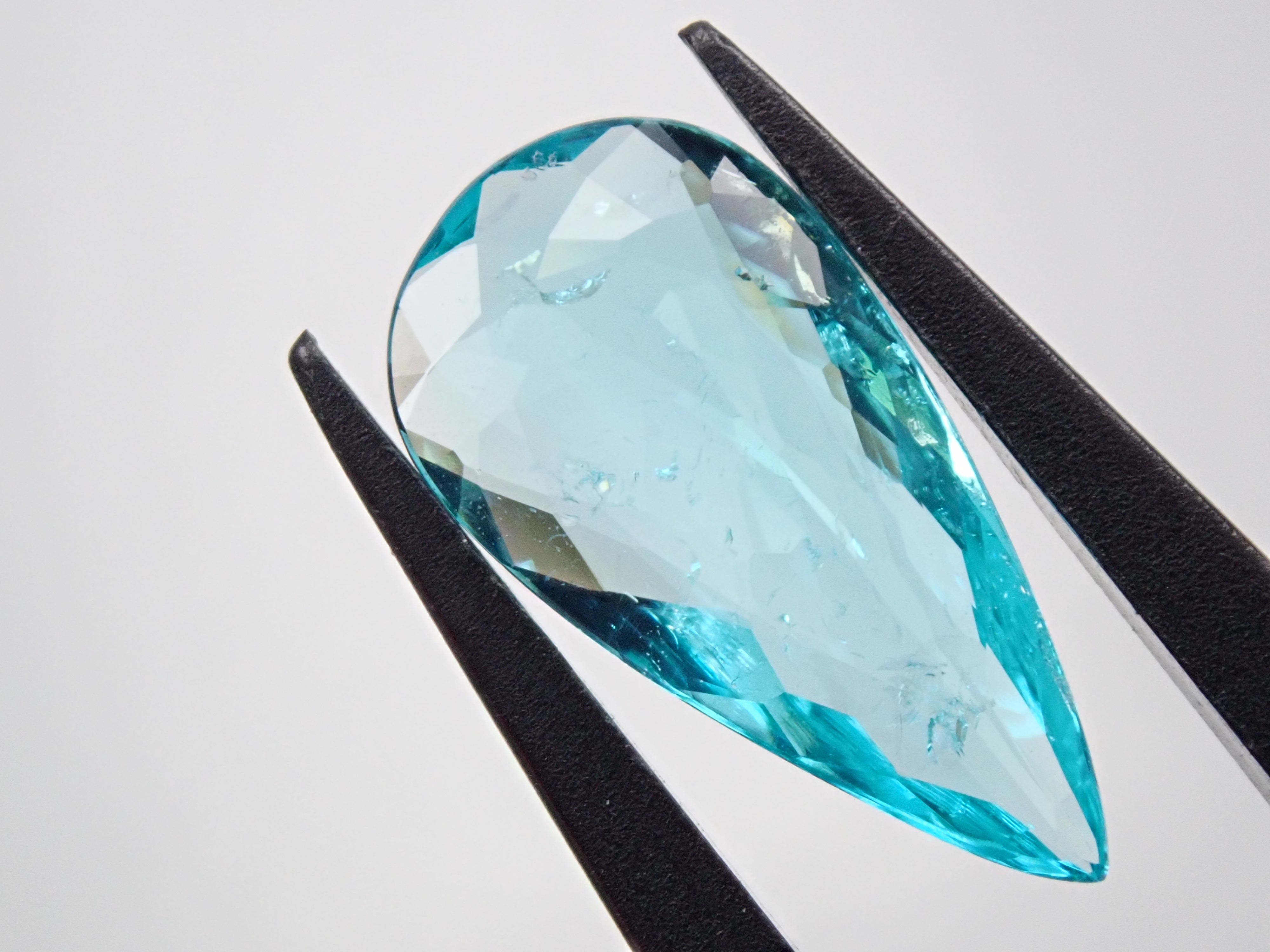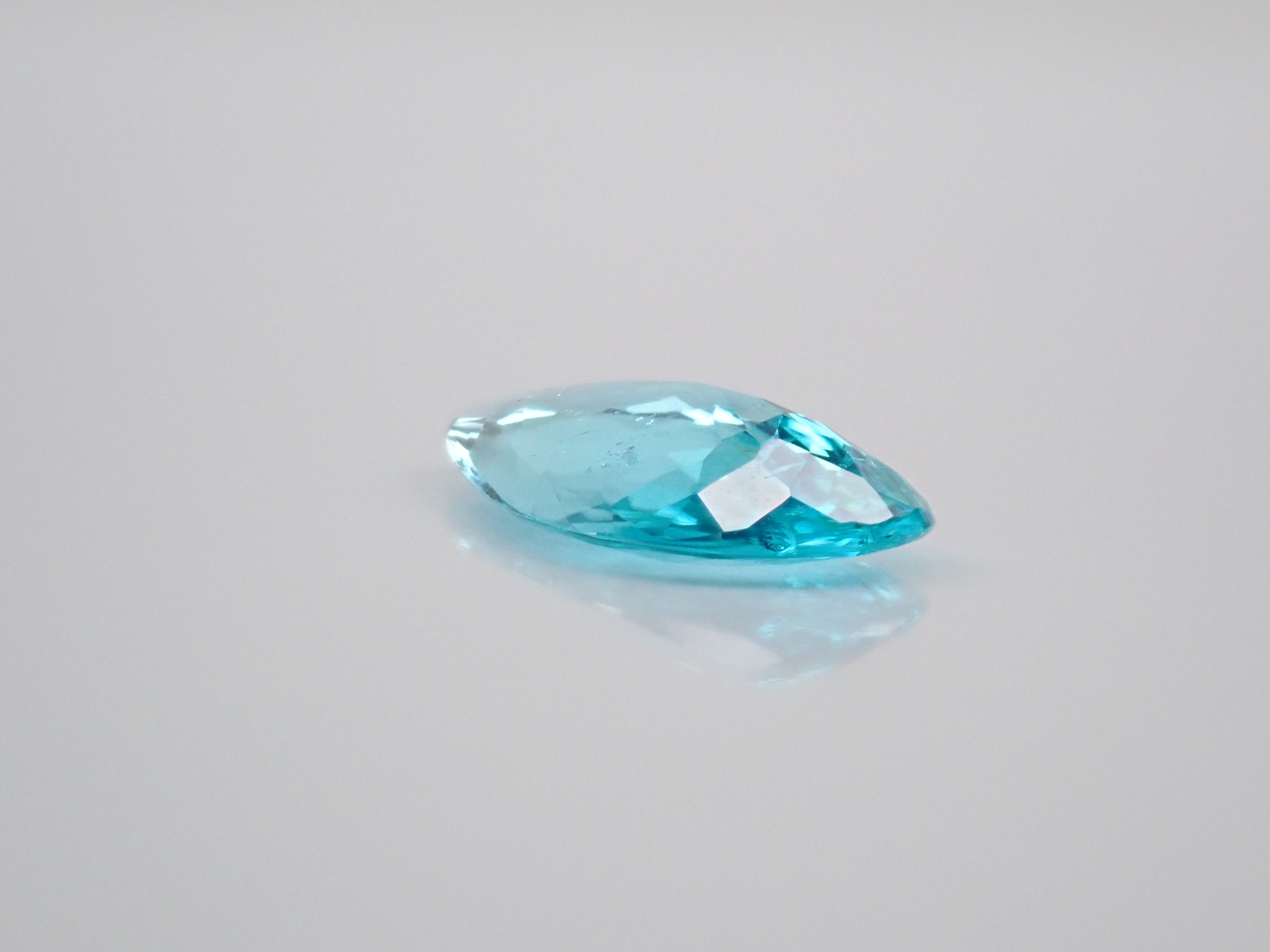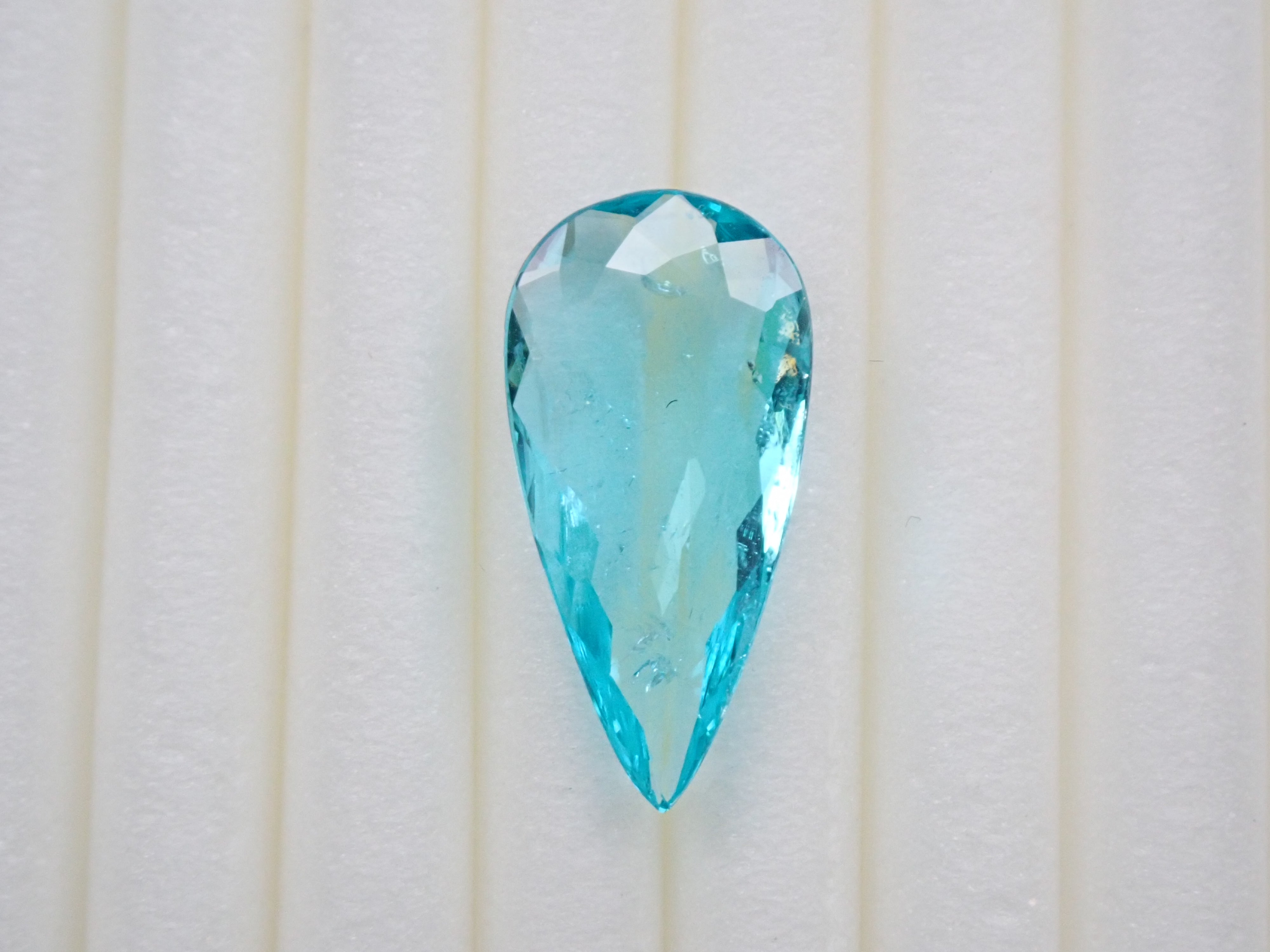 帕拉伊巴碧璽有著不同於大海的藍色或天空的藍色的精緻色彩。它在日本的定義是“含有銅和錳的藍色到綠色碧璽(無論產地)。”它是一種非常受歡迎的寶石。梨形切割帕拉伊巴碧璽,質地良好,透明度高。隨附中央寶石研究所頒發的鑑定證書。