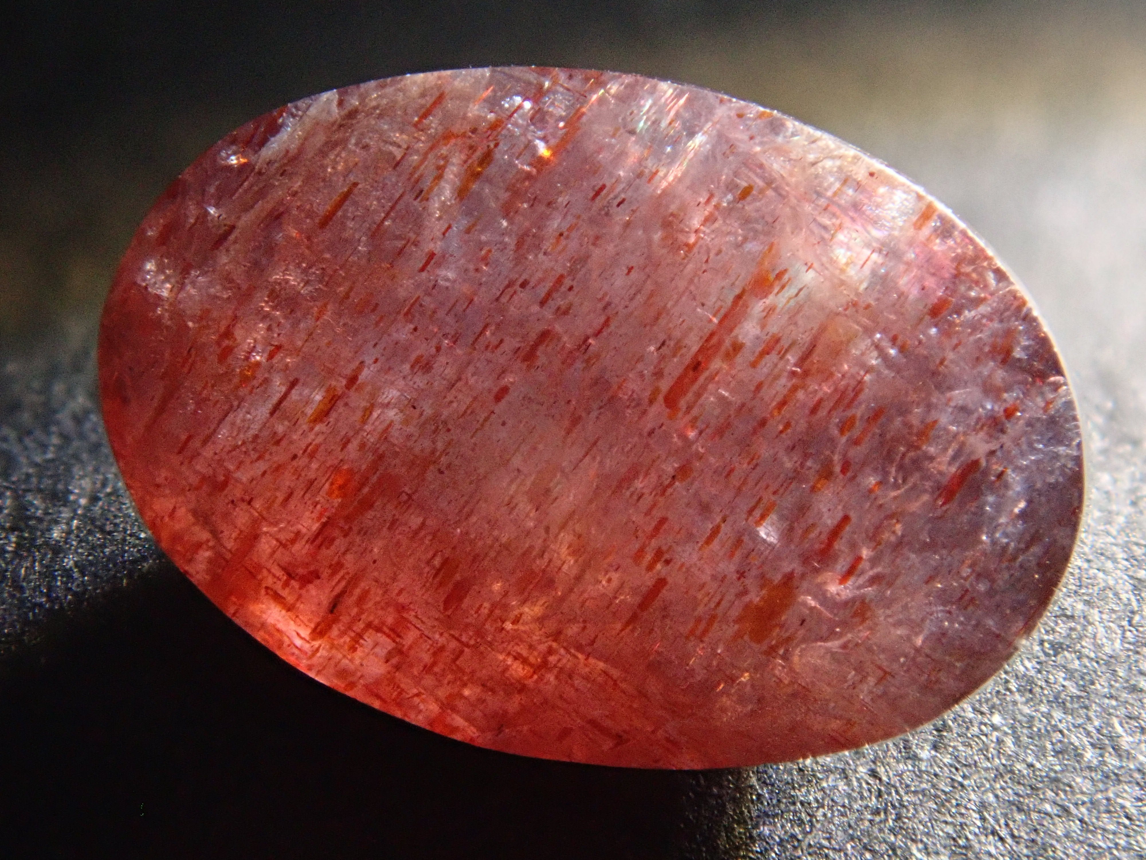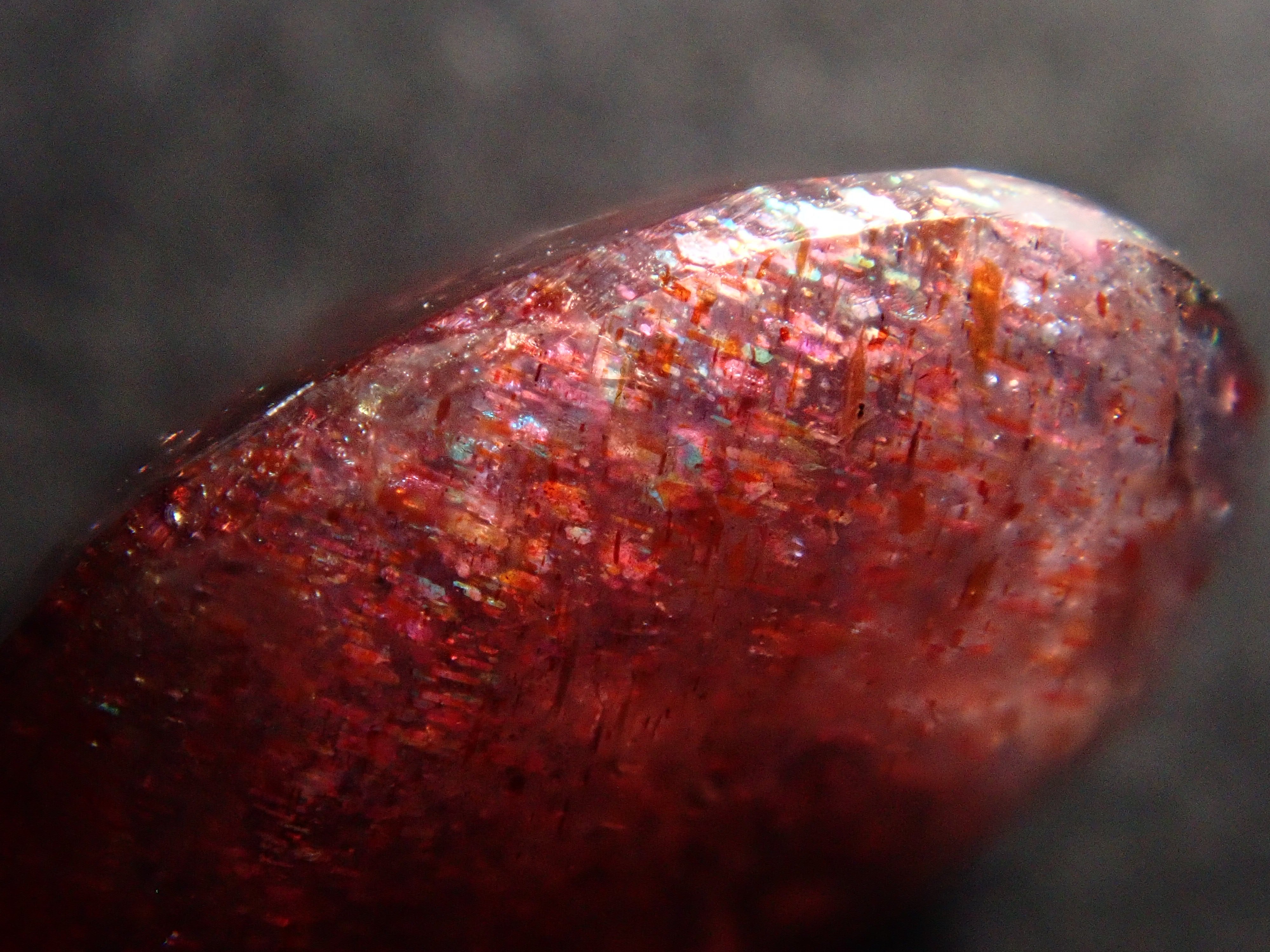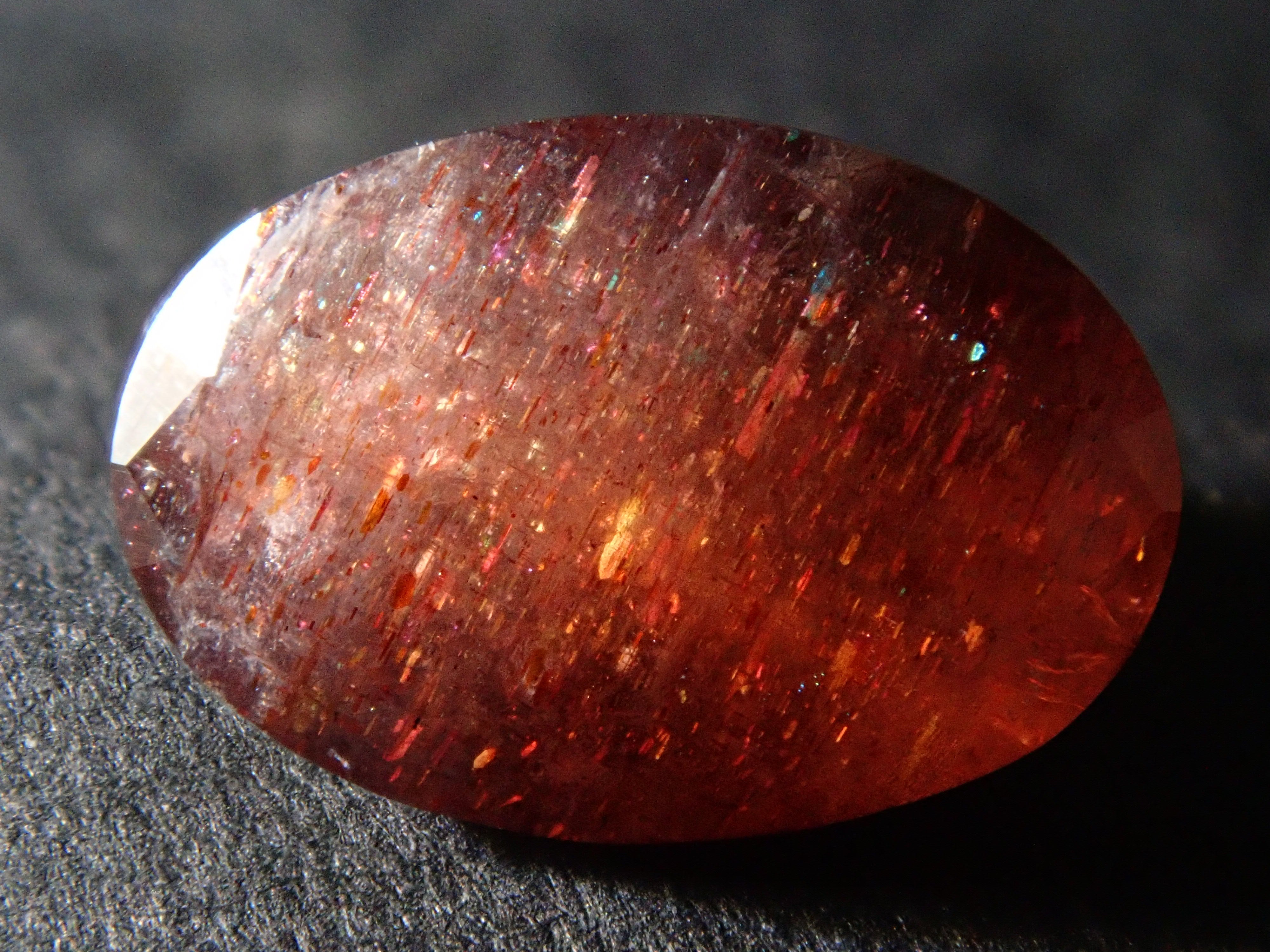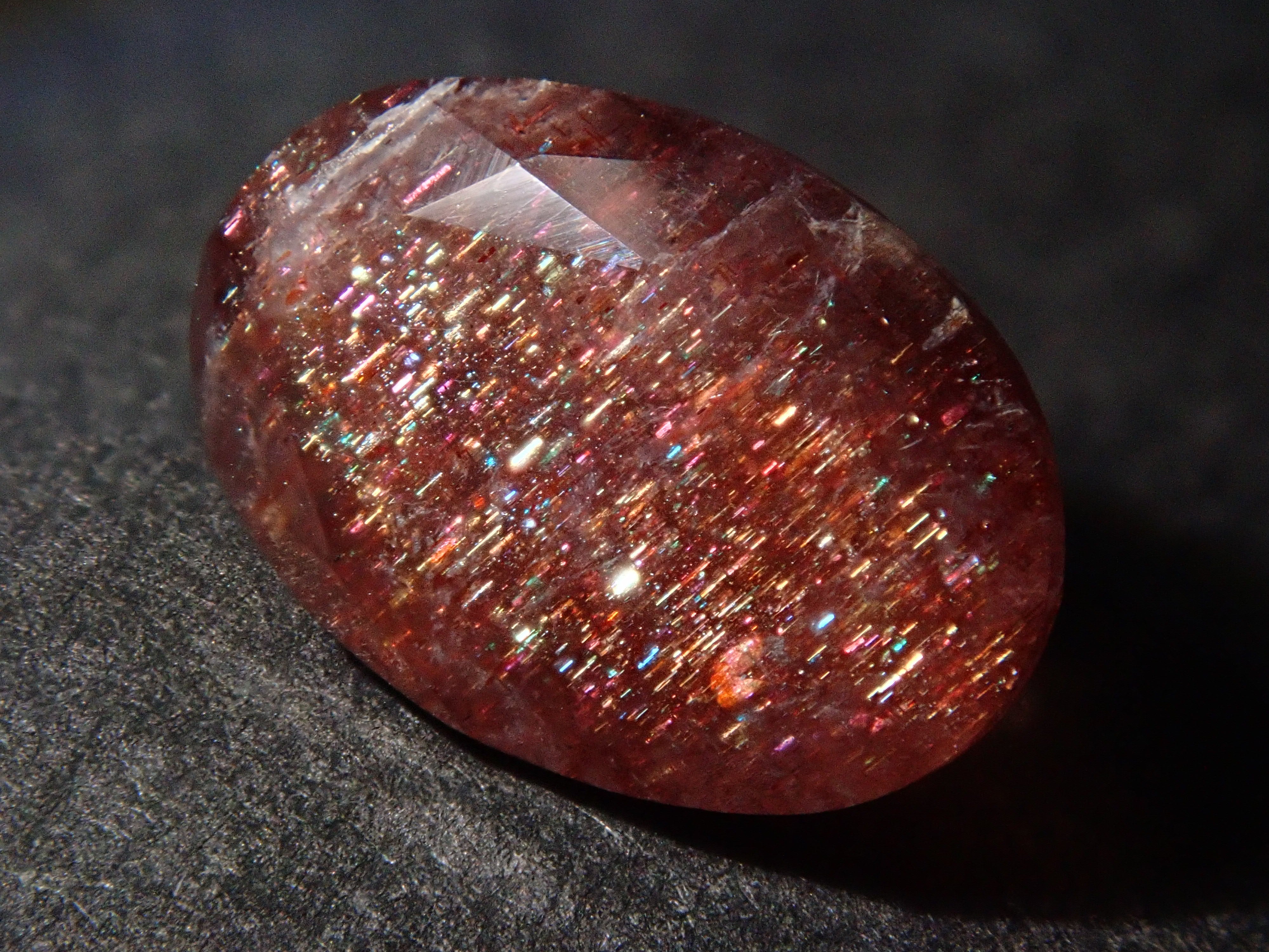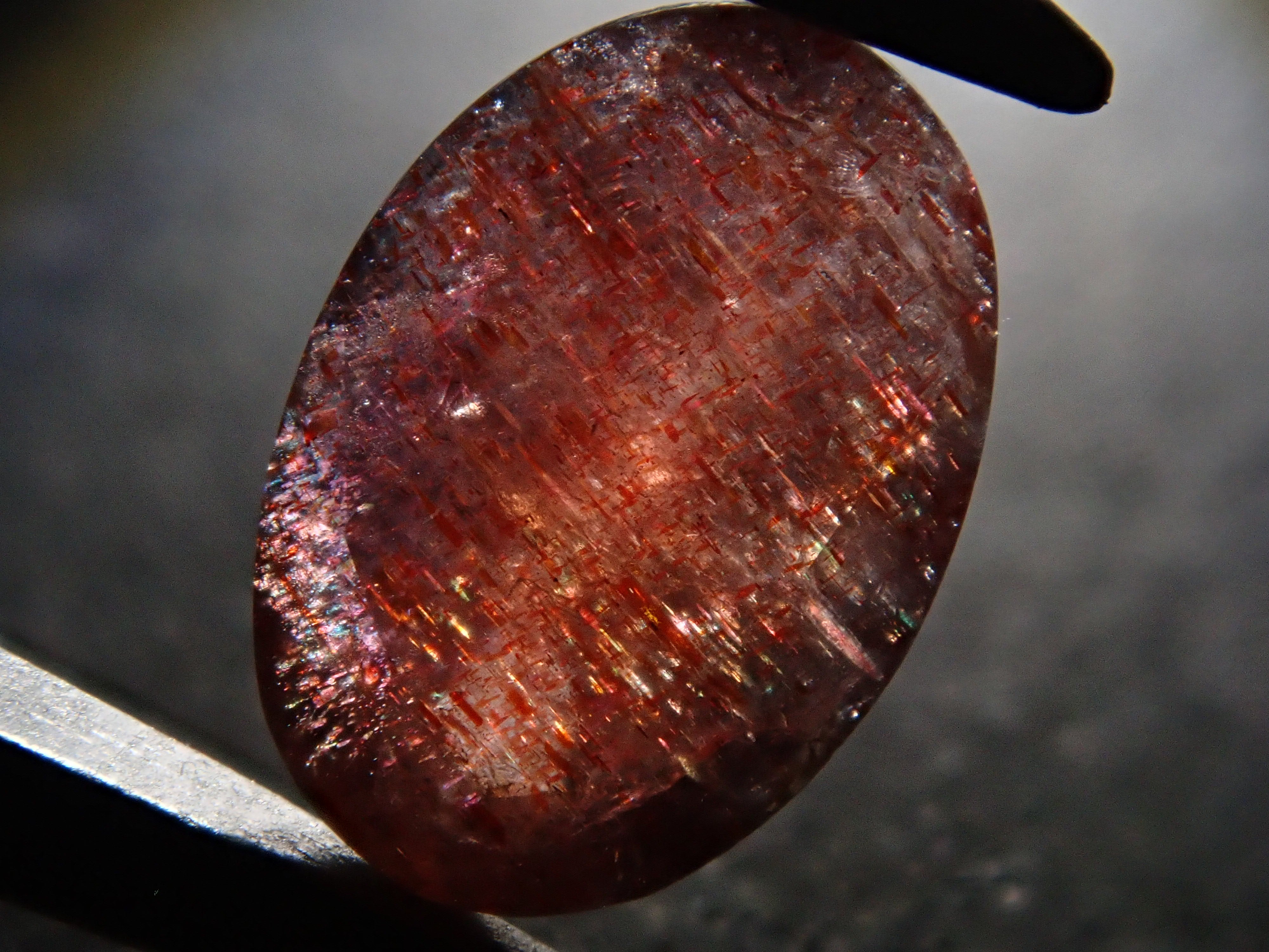 堇青石擁有如紫羅蘭花般美麗的深藍紫色澤,是一種具有多色性的寶石,這意味著從不同角度觀看時,它會呈現出不同的顏色。堇青石增加了多種元素。首先,它具有一種名為「灑金光」的現象。它具有類似閃光的光學效果,這種寶石通常被稱為“堇青石日光石”或“灑金光堇青石”。在具有這種效果的寶石中,帶有紅色斑點圖案的被稱為“血絲”。據說,這种红色主要源自於纖鐵礦。這是一種彷彿充滿夜空魅力的寶石。照片使用了筆型手電筒拍攝。