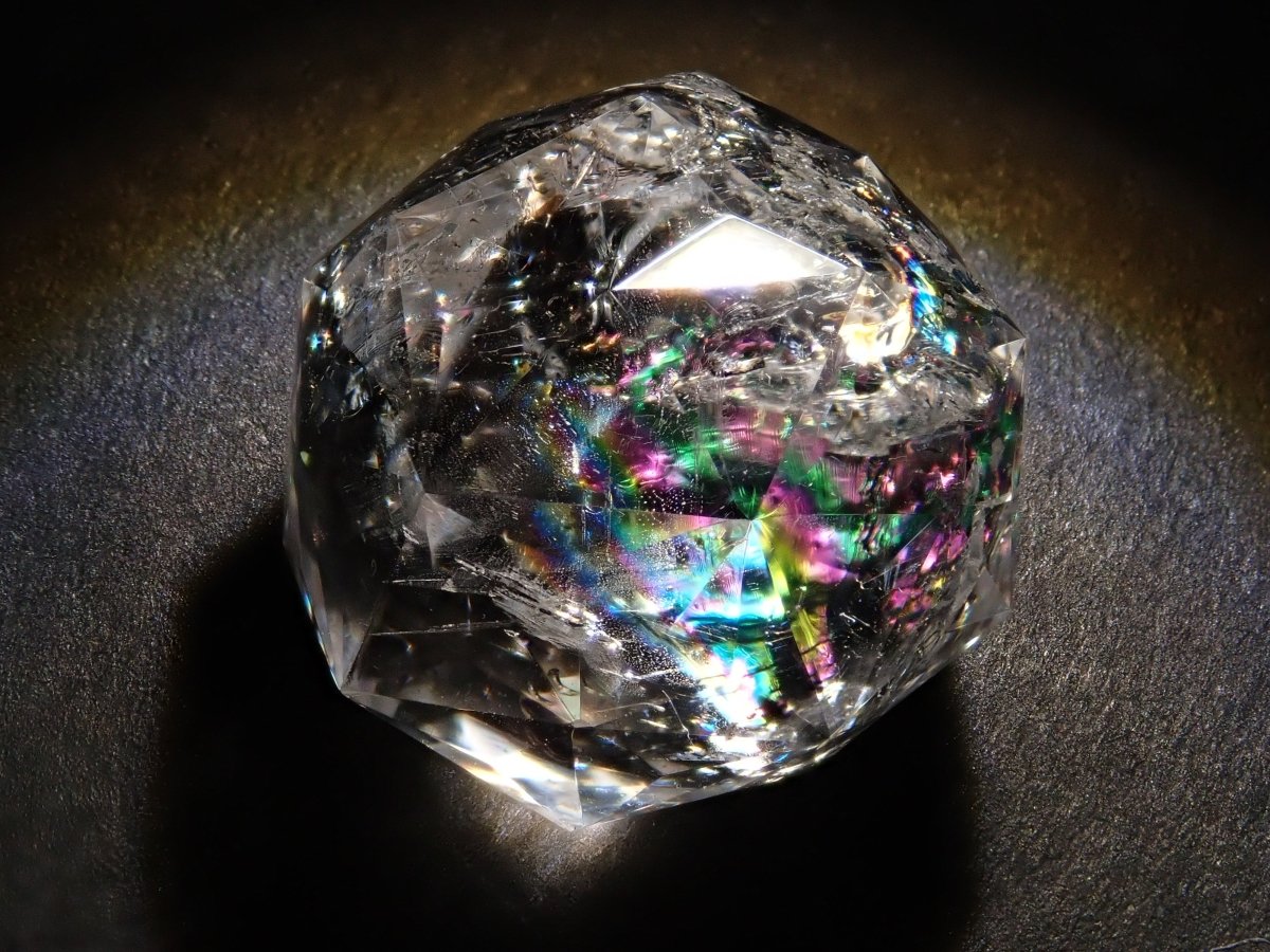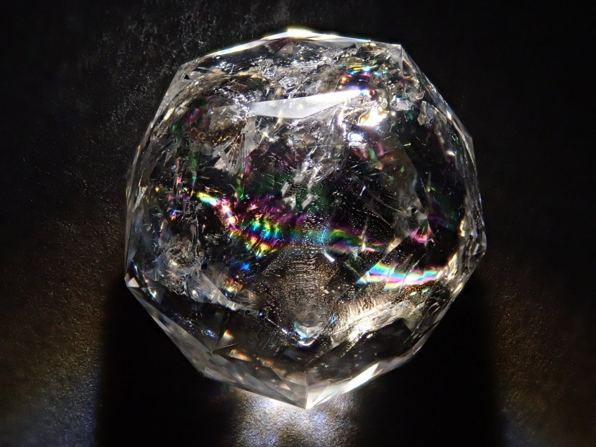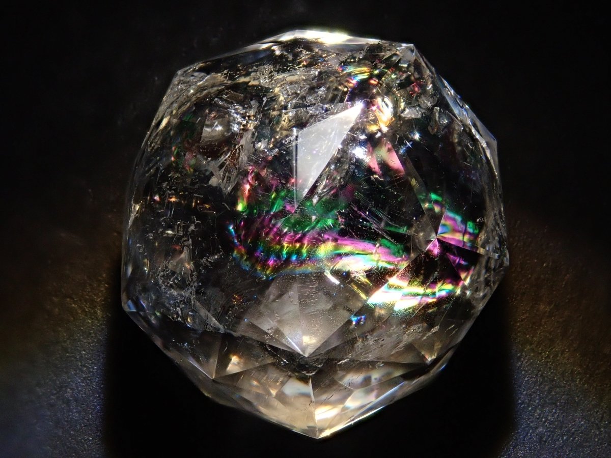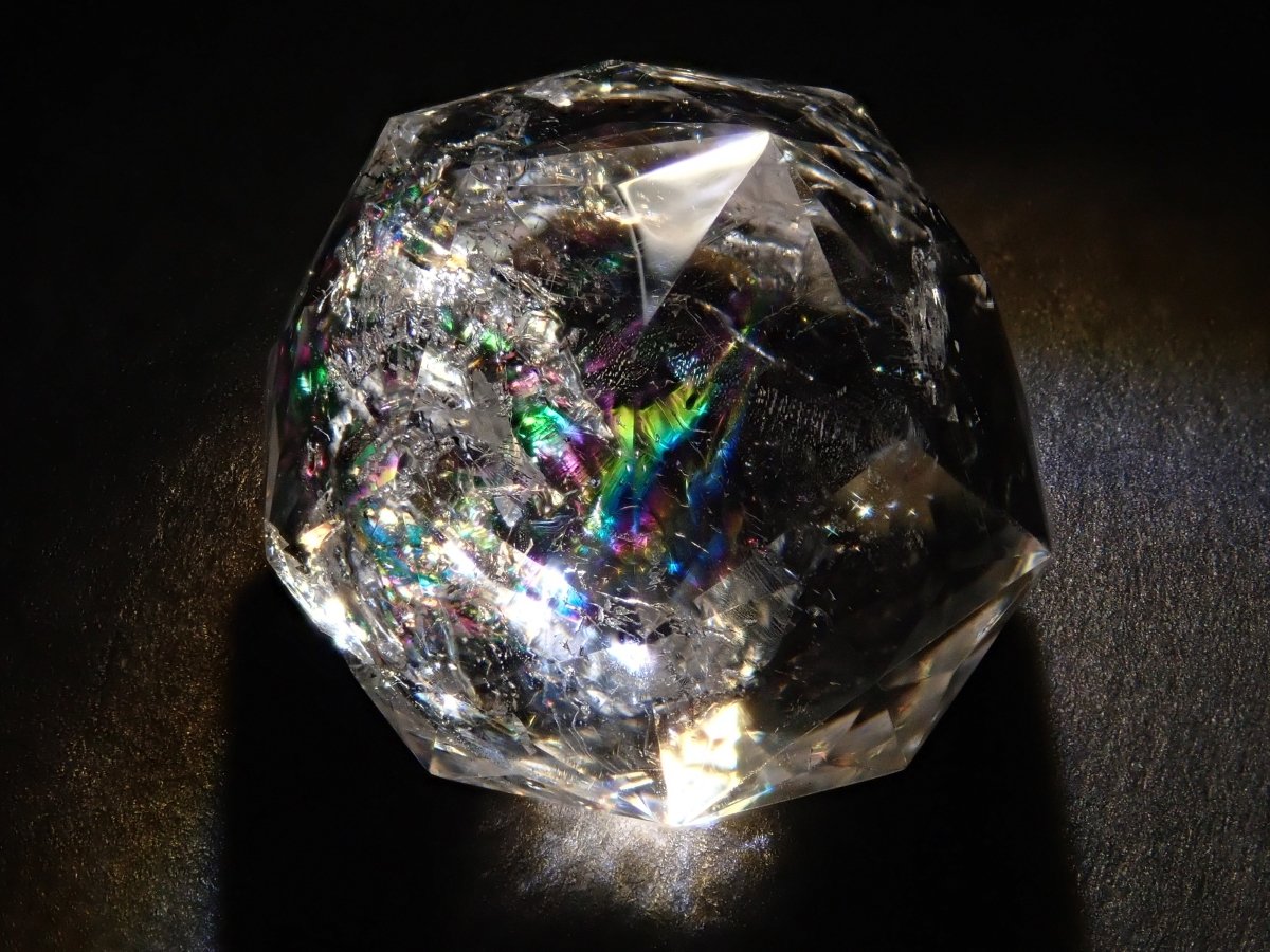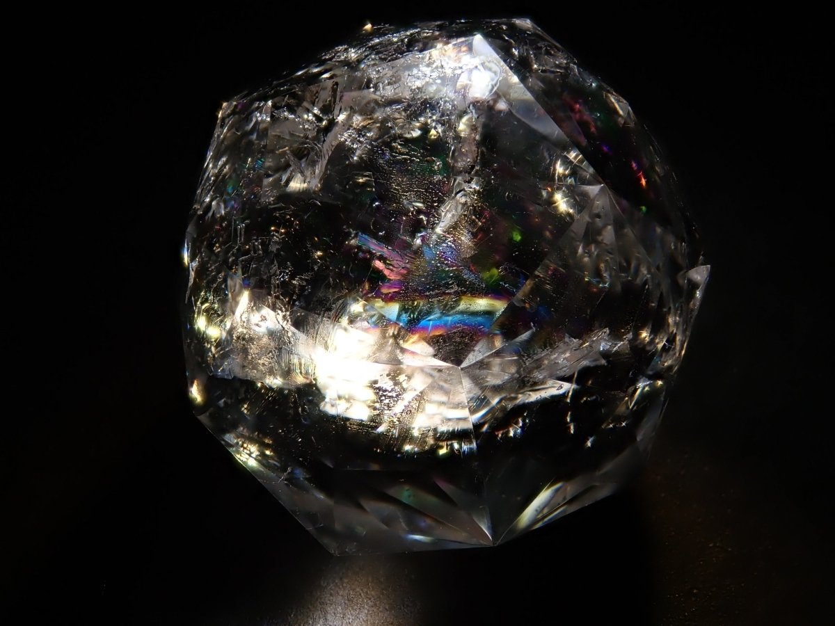 這就是清水奇蹟的代表人物清水幸雄先生所創造的桔梗切工,他是世界上唯一能做到這一點的人。對於桔梗切割,首先,使用由 12 個正五邊形包圍的正十二面體作為基底,並向每個正五邊形的中心製作帶有脊線的五邊形切割。在此基礎上,進行進一步切割以建立總共 180 個面的多面體。這種切割需要經過許多令人畏懼的步驟和精細的工作才能完成,因其形狀而被稱為“風鈴草切割”。這是一種含有油的石英油,在風鈴草切工中很少見。我是那種能看到彩虹的人。