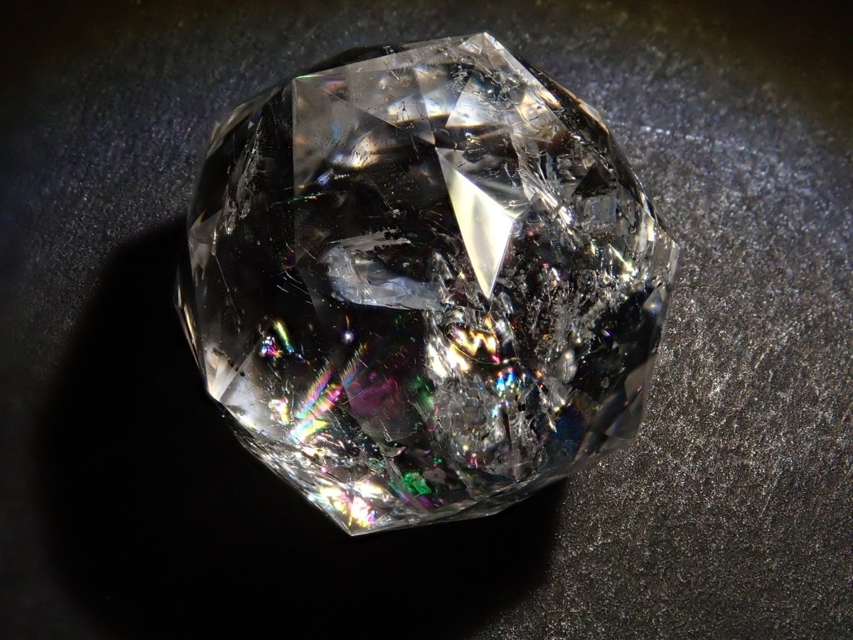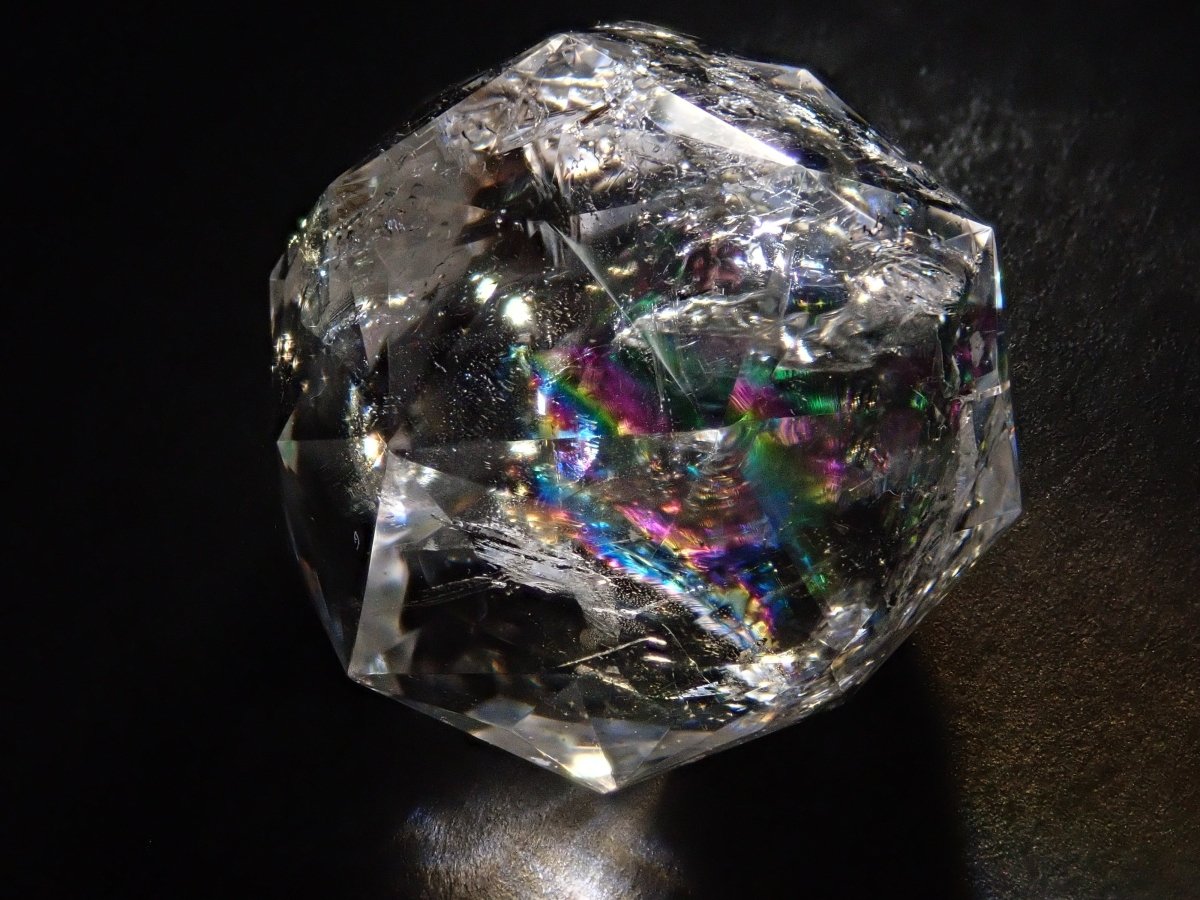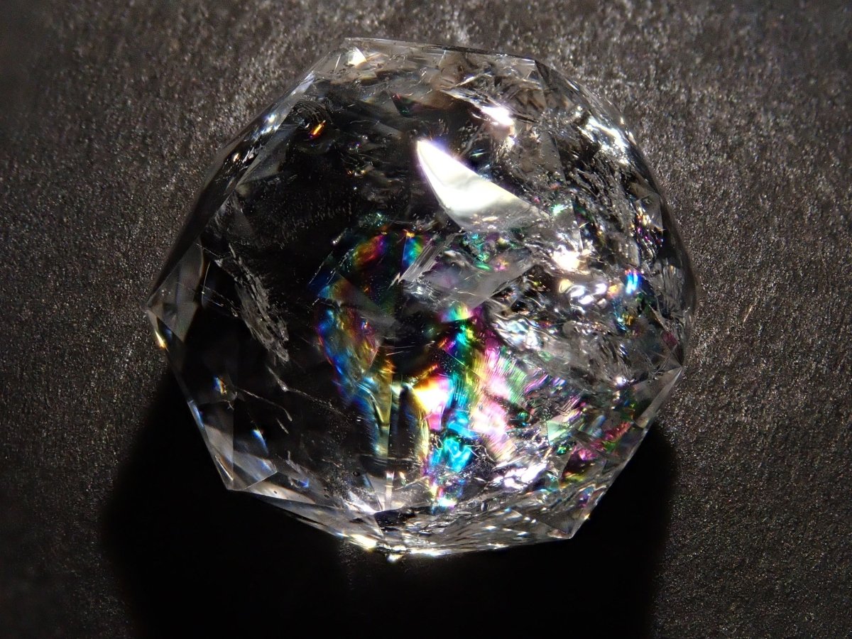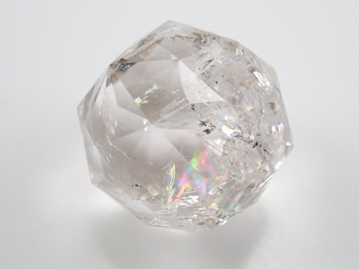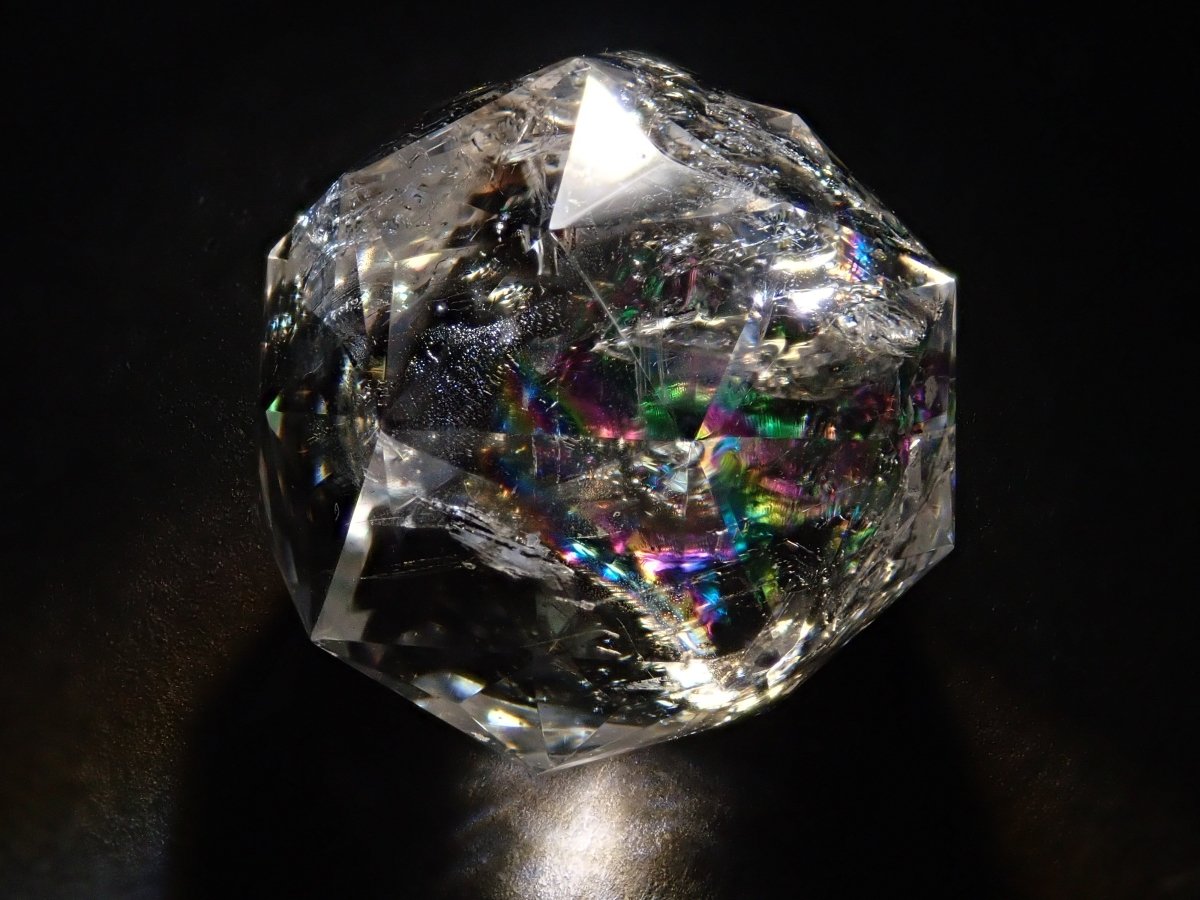 這就是清水奇蹟的代表人物清水幸雄先生所創造的桔梗切工,他是世界上唯一能做到這一點的人。對於桔梗切割,首先,使用由 12 個正五邊形包圍的正十二面體作為基底,並向每個正五邊形的中心製作帶有脊線的五邊形切割。在此基礎上,進行進一步切割以建立總共 180 個面的多面體。這種切割需要經過許多令人畏懼的步驟和精細的工作才能完成,因其形狀而被稱為“風鈴草切割”。這是一種含有油的石英油,在風鈴草切工中很少見。我是那種能看到彩虹的人。