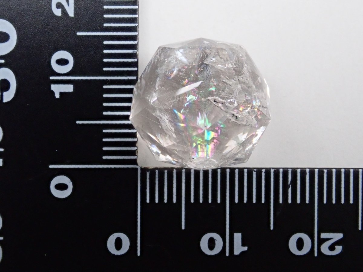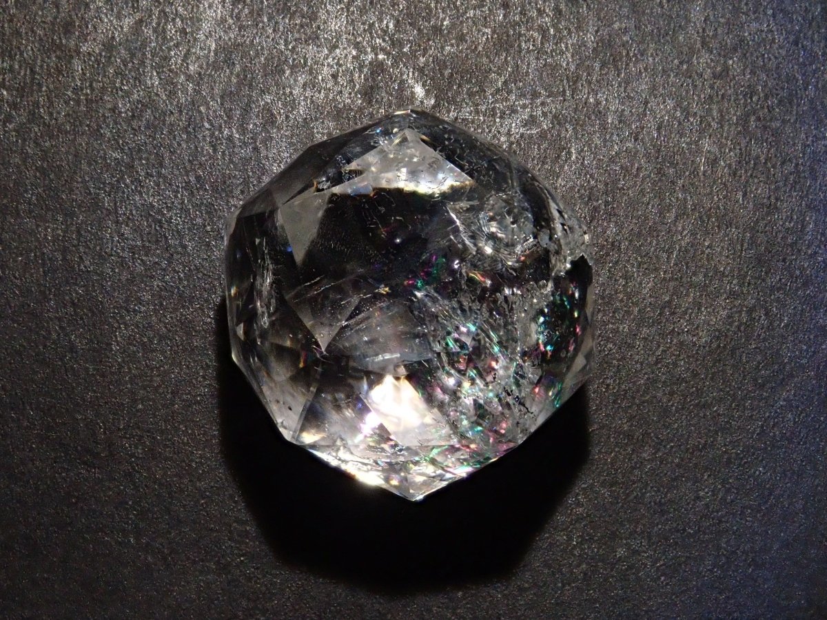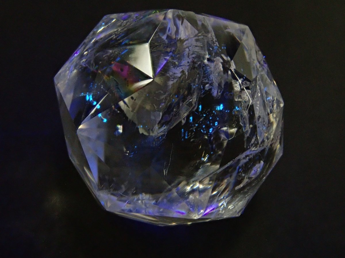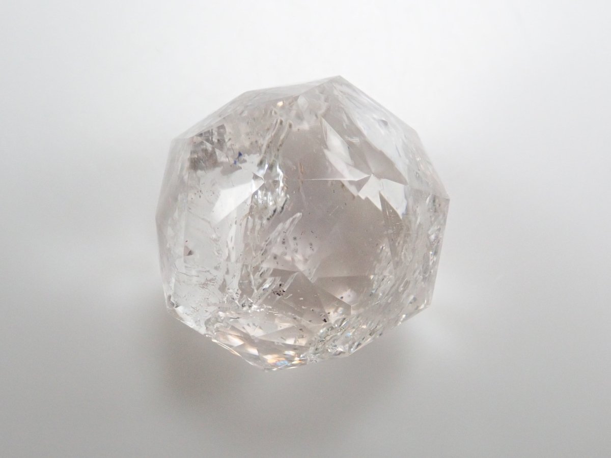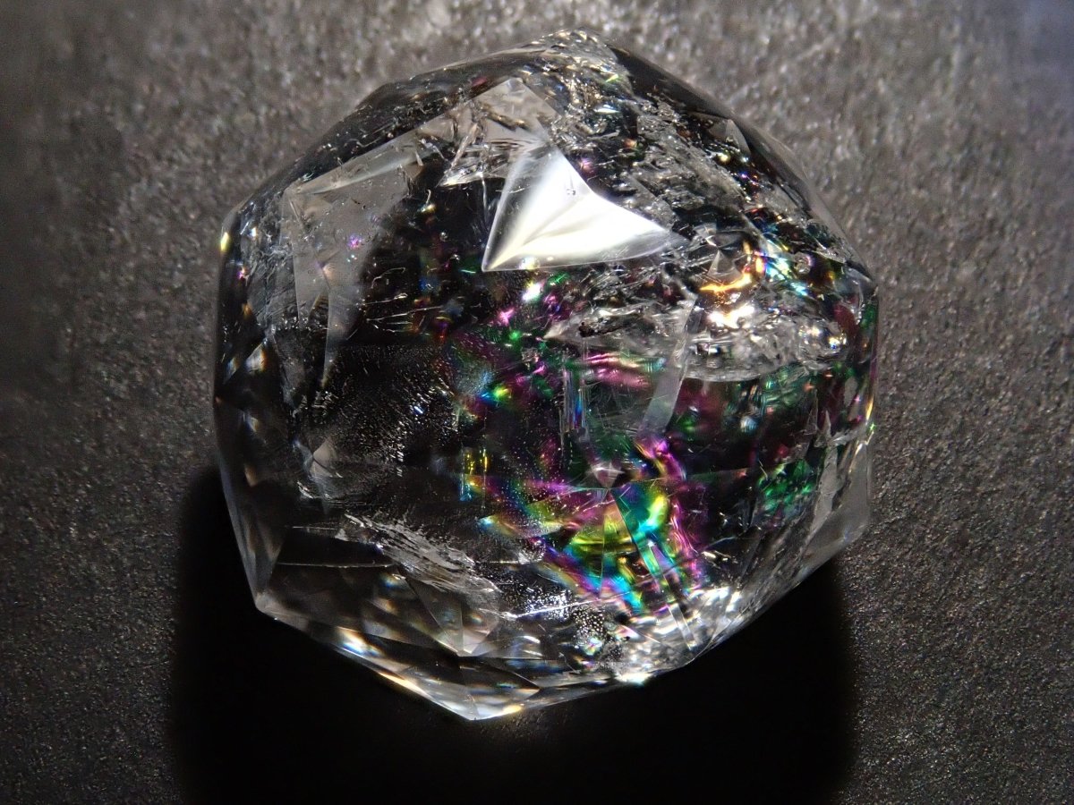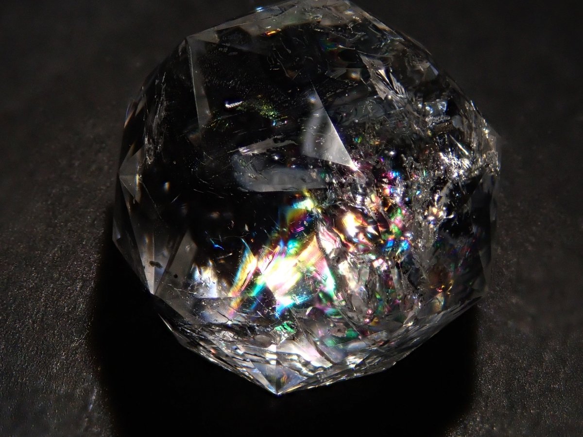 這就是清水奇蹟的代表人物清水幸雄先生所創造的桔梗切工,他是世界上唯一能做到這一點的人。對於桔梗切割,首先,使用由 12 個正五邊形包圍的正十二面體作為基底,並向每個正五邊形的中心製作帶有脊線的五邊形切割。在此基礎上,進行進一步切割以建立總共 180 個面的多面體。這種切割需要經過許多令人畏懼的步驟和精細的工作才能完成,因其形狀而被稱為“風鈴草切割”。這是一種含有油的石英油,在風鈴草切工中很少見。我是那種能看到彩虹的人。