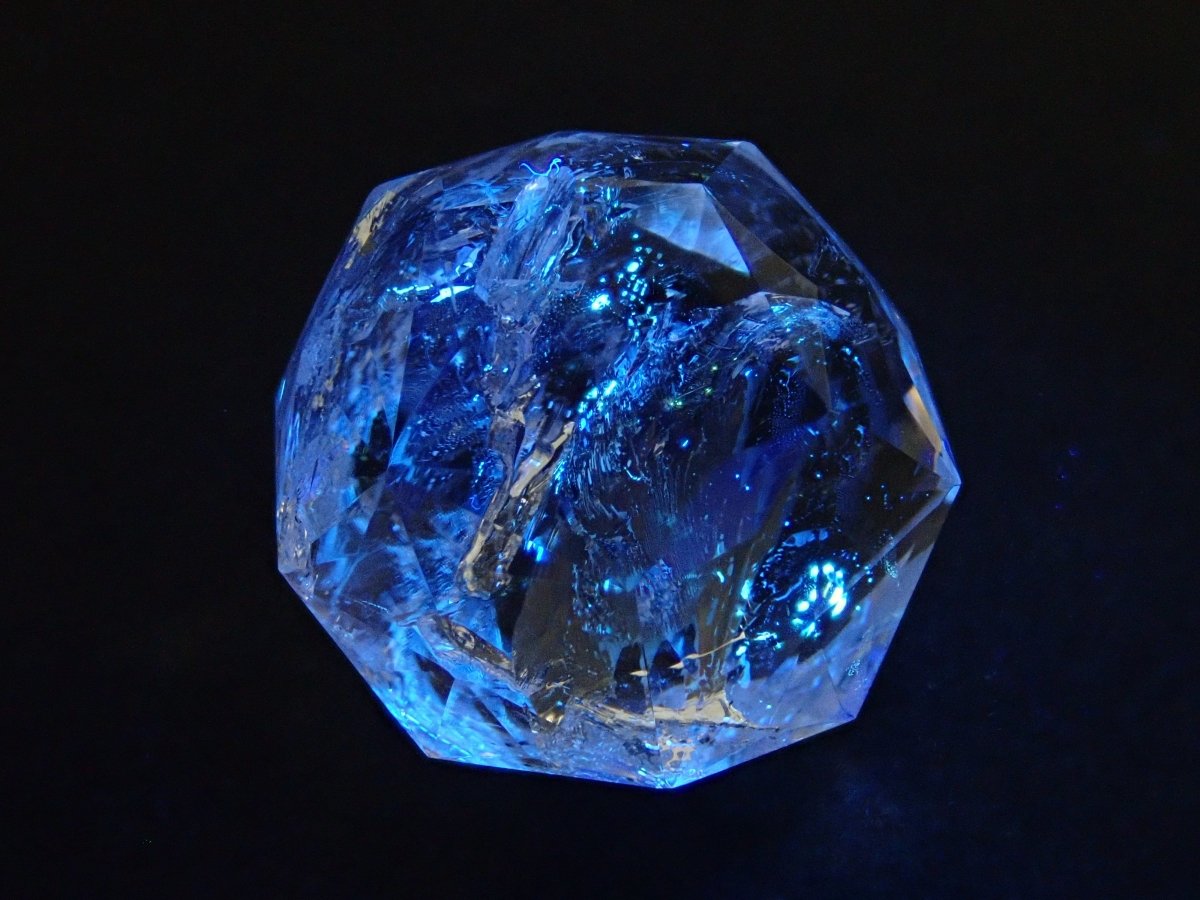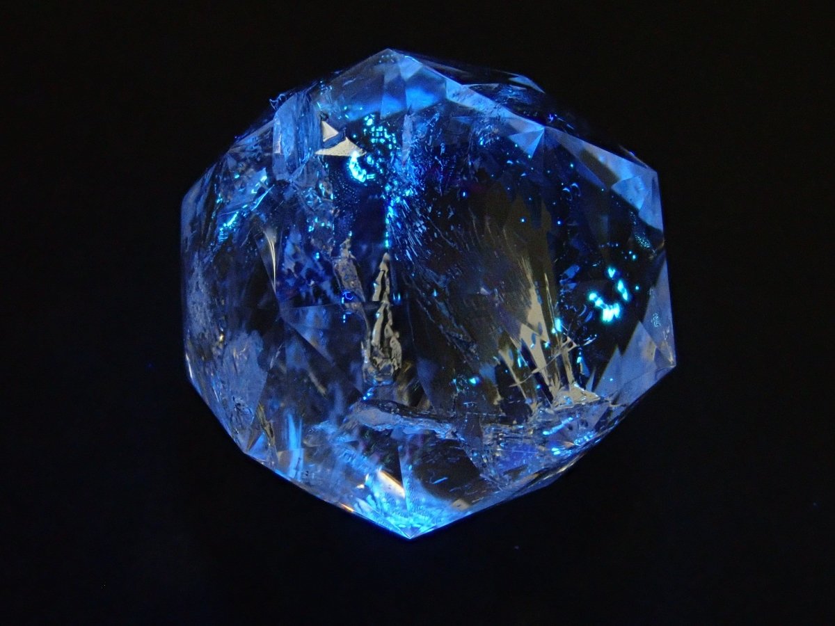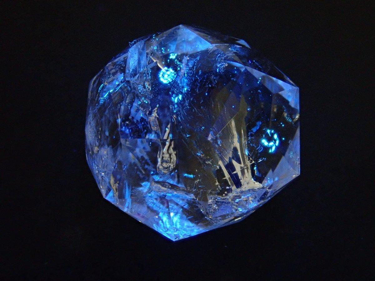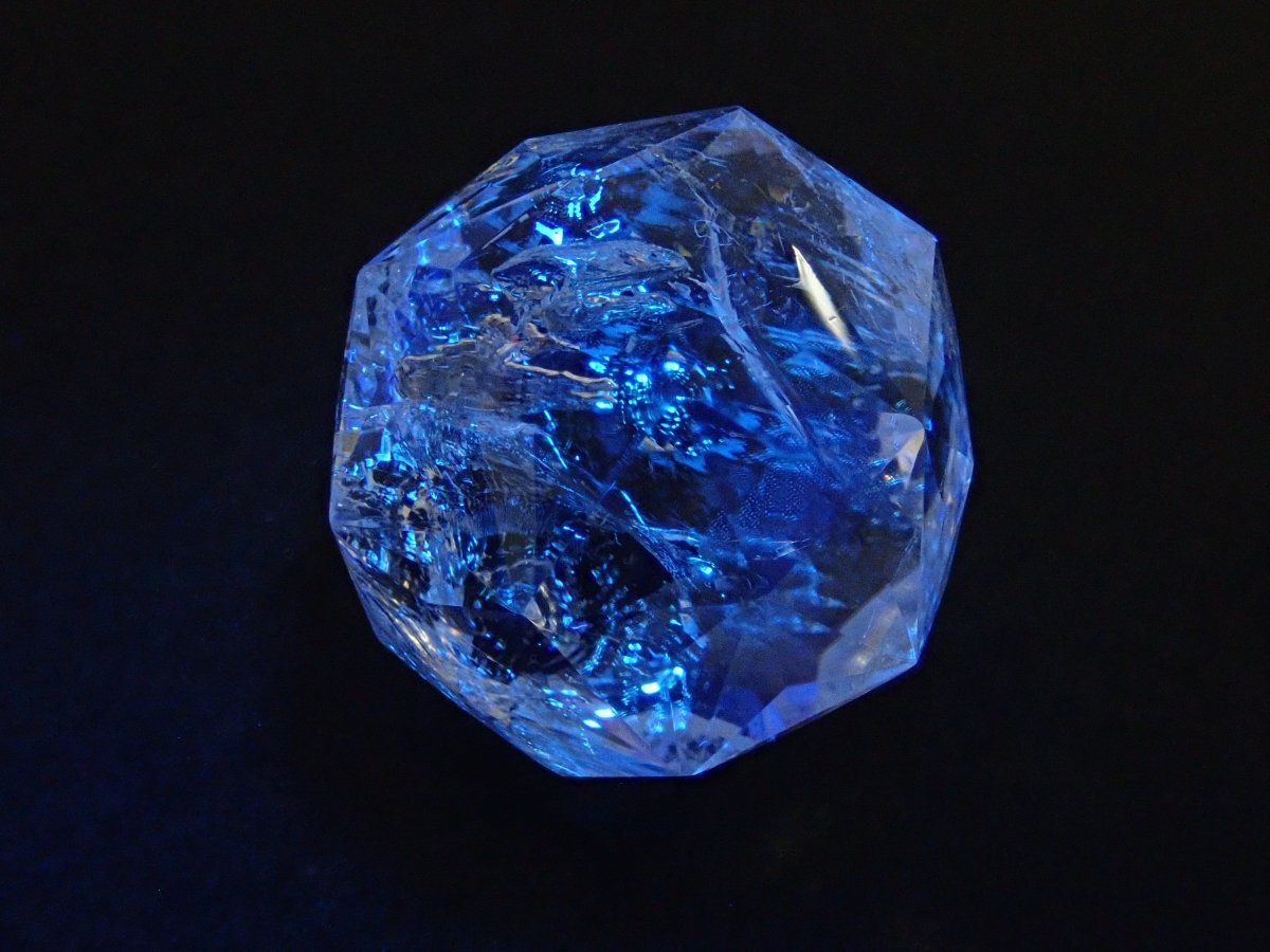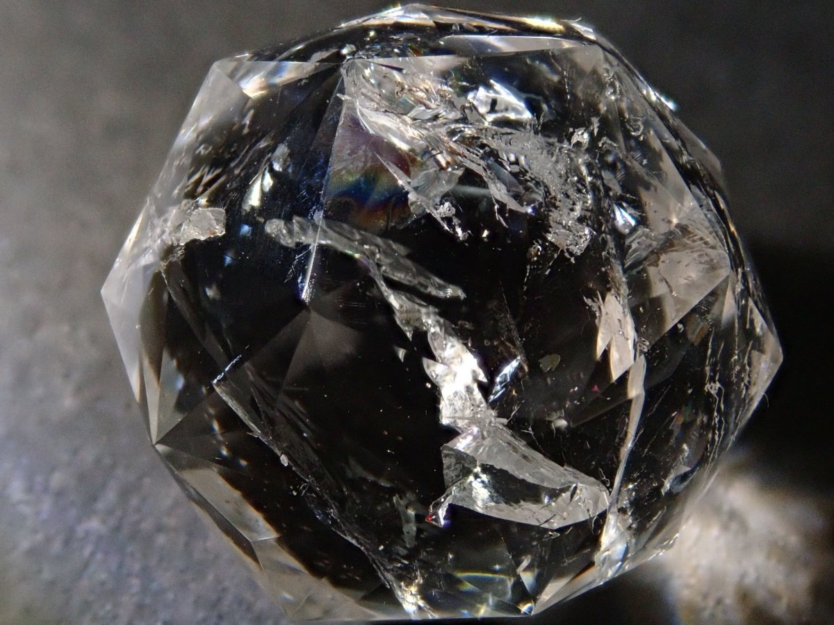 這就是清水奇蹟的代表人物清水幸雄先生所創造的桔梗切工,他是世界上唯一能做到這一點的人。對於桔梗切割,首先,使用由 12 個正五邊形包圍的正十二面體作為基底,並向每個正五邊形的中心製作帶有脊線的五邊形切割。在此基礎上,進行進一步切割以建立總共 180 個面的多面體。這種切割需要經過許多令人畏懼的步驟和精細的工作才能完成,因其形狀而被稱為“風鈴草切割”。這是一種含有油的石英油,在風鈴草切工中很少見。我是那種能看到彩虹的人。