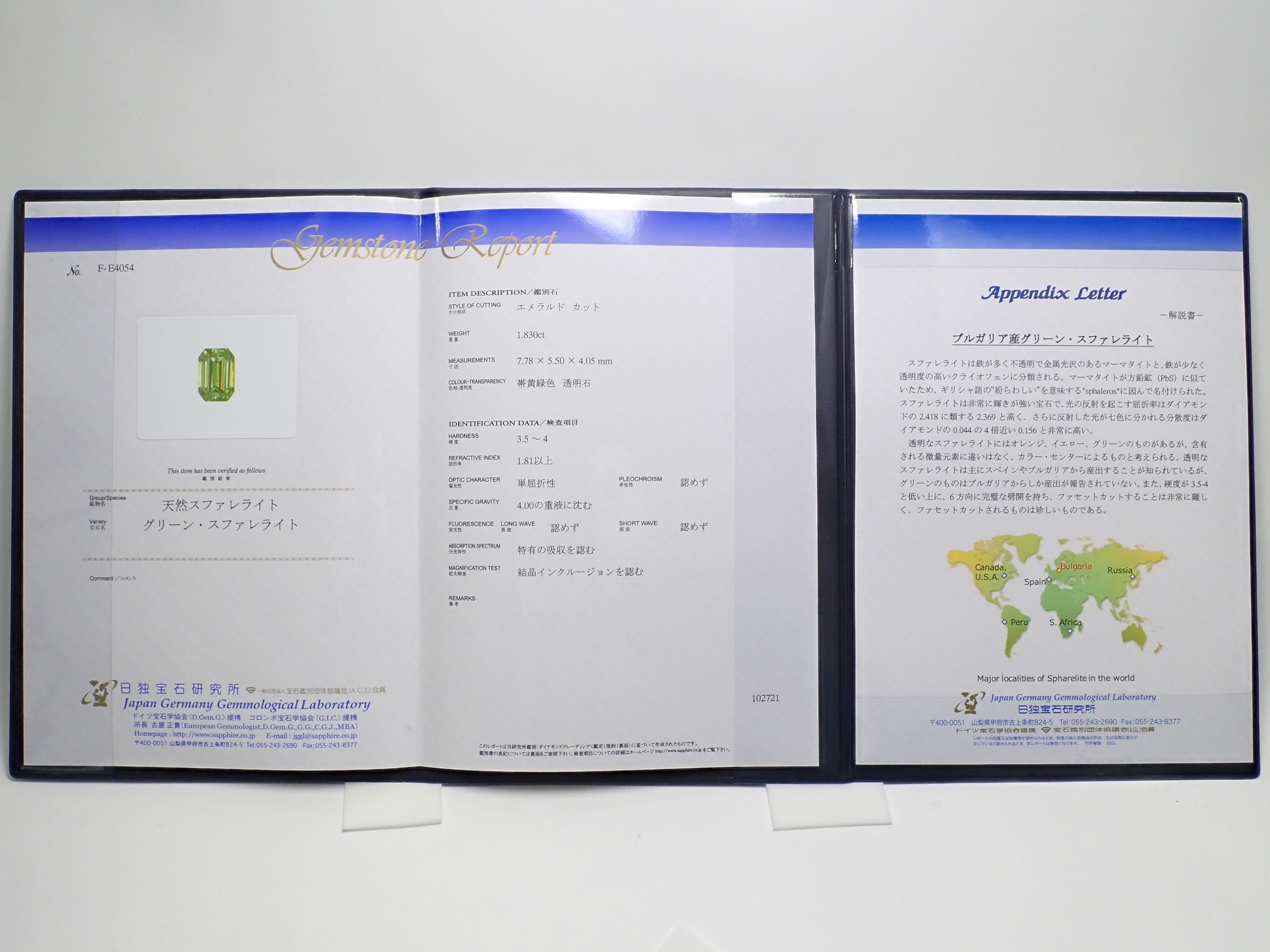這是產自保加利亞的特別罕見的閃鋅礦。 綠色閃鋅礦。據說綠色閃鋅礦處於枯竭狀態,是一種極難穩定購買的寶石。附有日德寶石研究所頒發的鑑定證書。