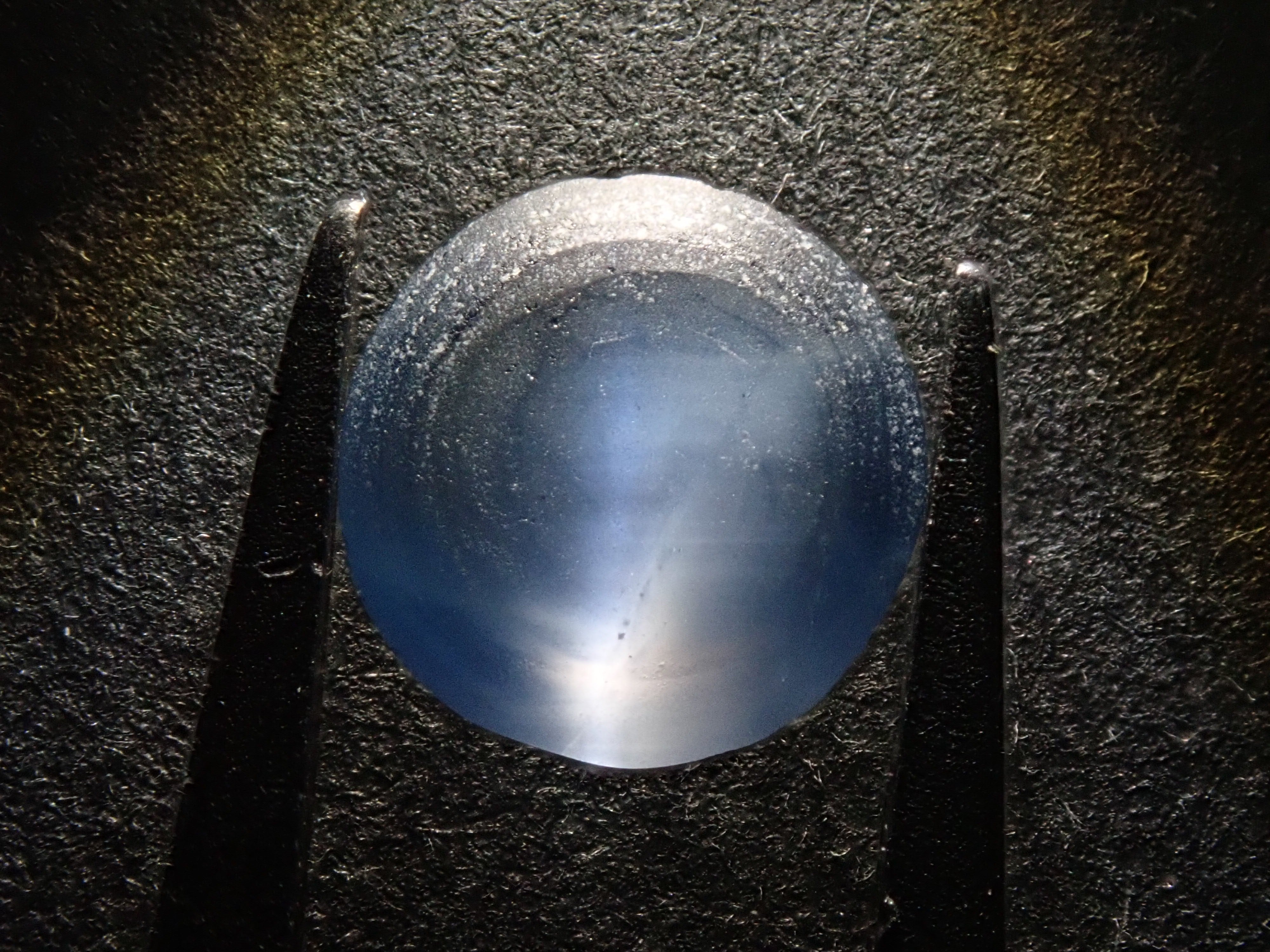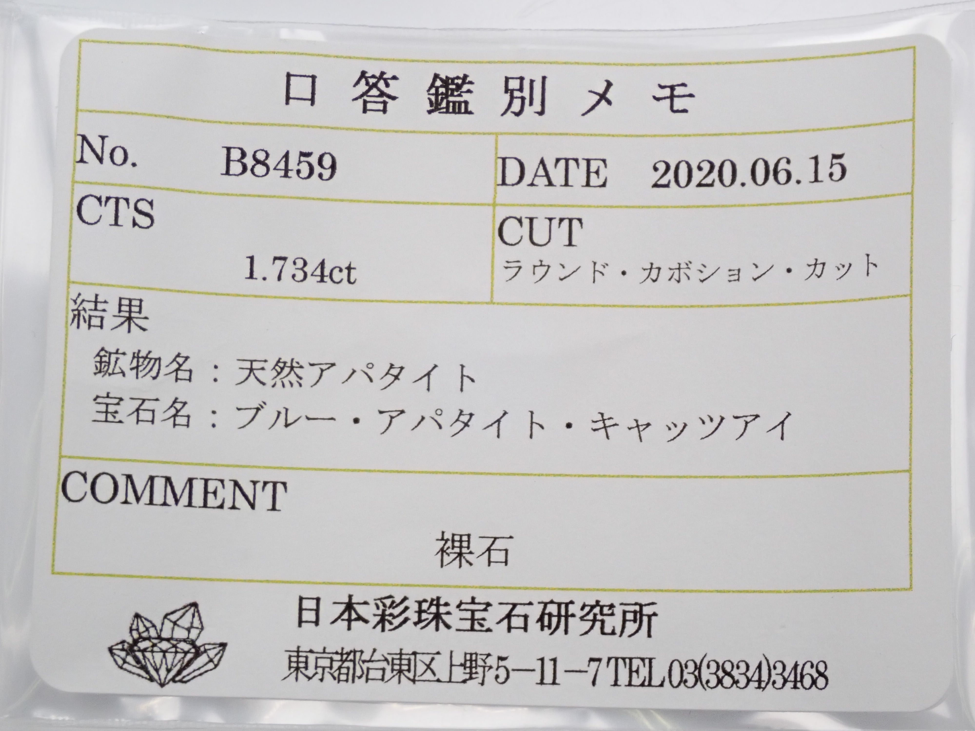 磷灰石是一種顏色豐富的寶石。除了無色之外,它還有藍色、紫色、綠色、黃色、粉紅色、紅色和白色。它的礦物名稱是磷灰石。如果長時間暴露在陽光直射下,磷灰石容易褪色,因此請將其存放在室內。這是一種呈現貓眼效果的寶石。照片是用筆形電筒拍攝的。深藍色的背景色讓您可以欣賞到貓眼般的美麗。這是貓眼磷灰石。它經過日本Saiju寶石實驗室的分類。