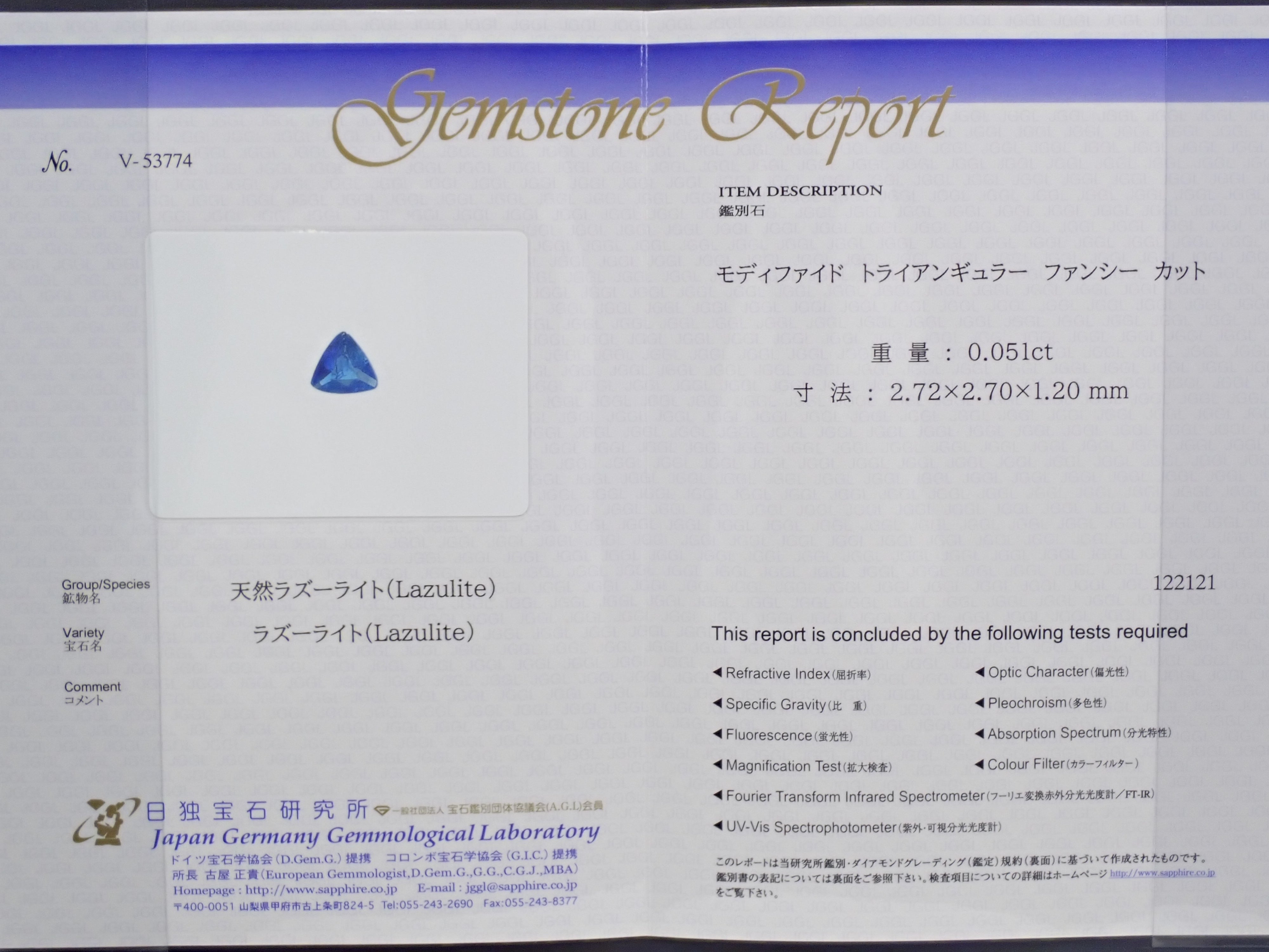 Lazulite 以阿拉伯語單字命名,意思是「天堂」。它是一種美麗的寶石,具有淡藍紫色、天藍色、藍綠色和藍白色。它的魅力之一是它具有高度多向色性,根據觀看角度可以呈現藍色或白色。這是鬆散的三角形切割青金石。