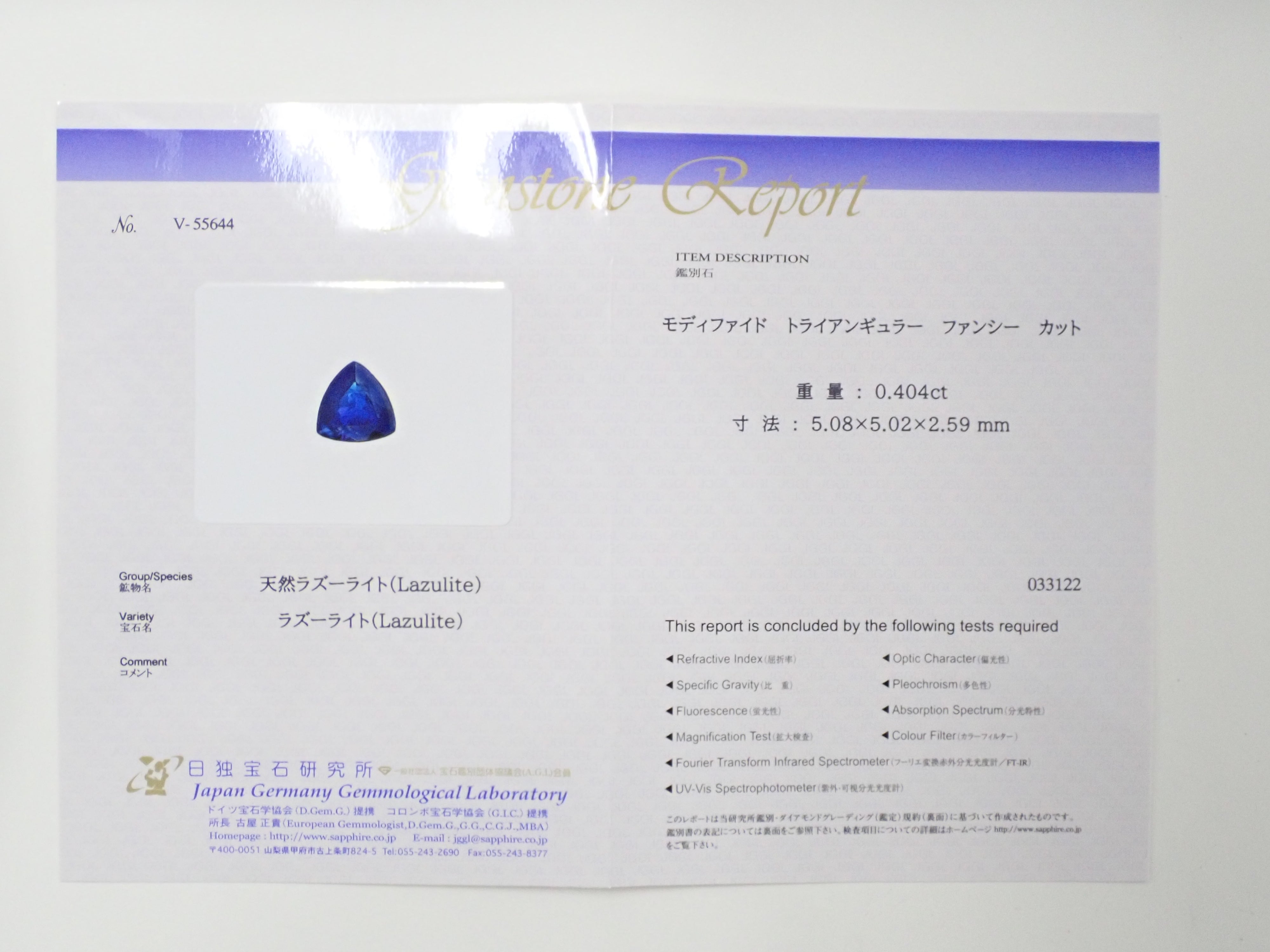 Lazulite 以阿拉伯語單字命名,意思是「天堂」。它是一種美麗的寶石,具有淡藍紫色、天藍色、藍綠色和藍白色。它的魅力之一是它具有高度多向色性,根據觀看角度可以呈現藍色或白色。寶石級天青石的尺寸一般為 0.1 克拉或更小,但這是 0.4 克拉的大尺寸,分佈較少。這是青金石類型中顏色較深的優質青金石。