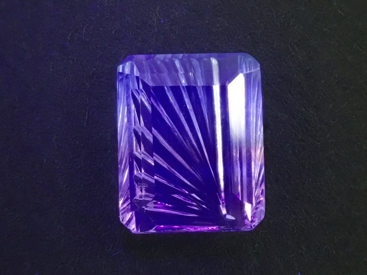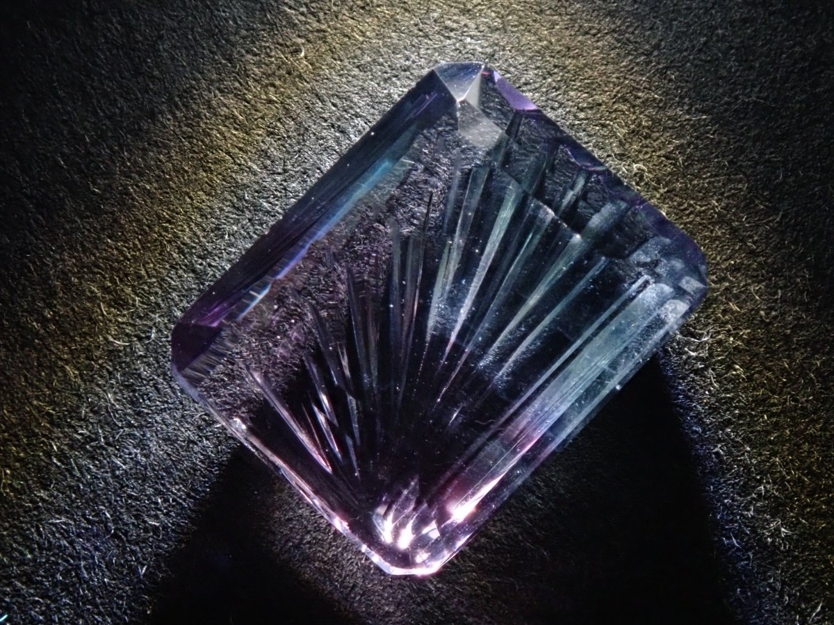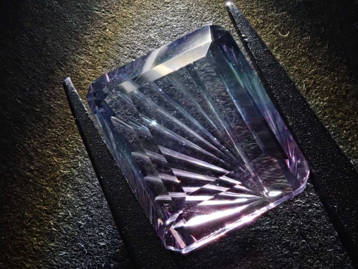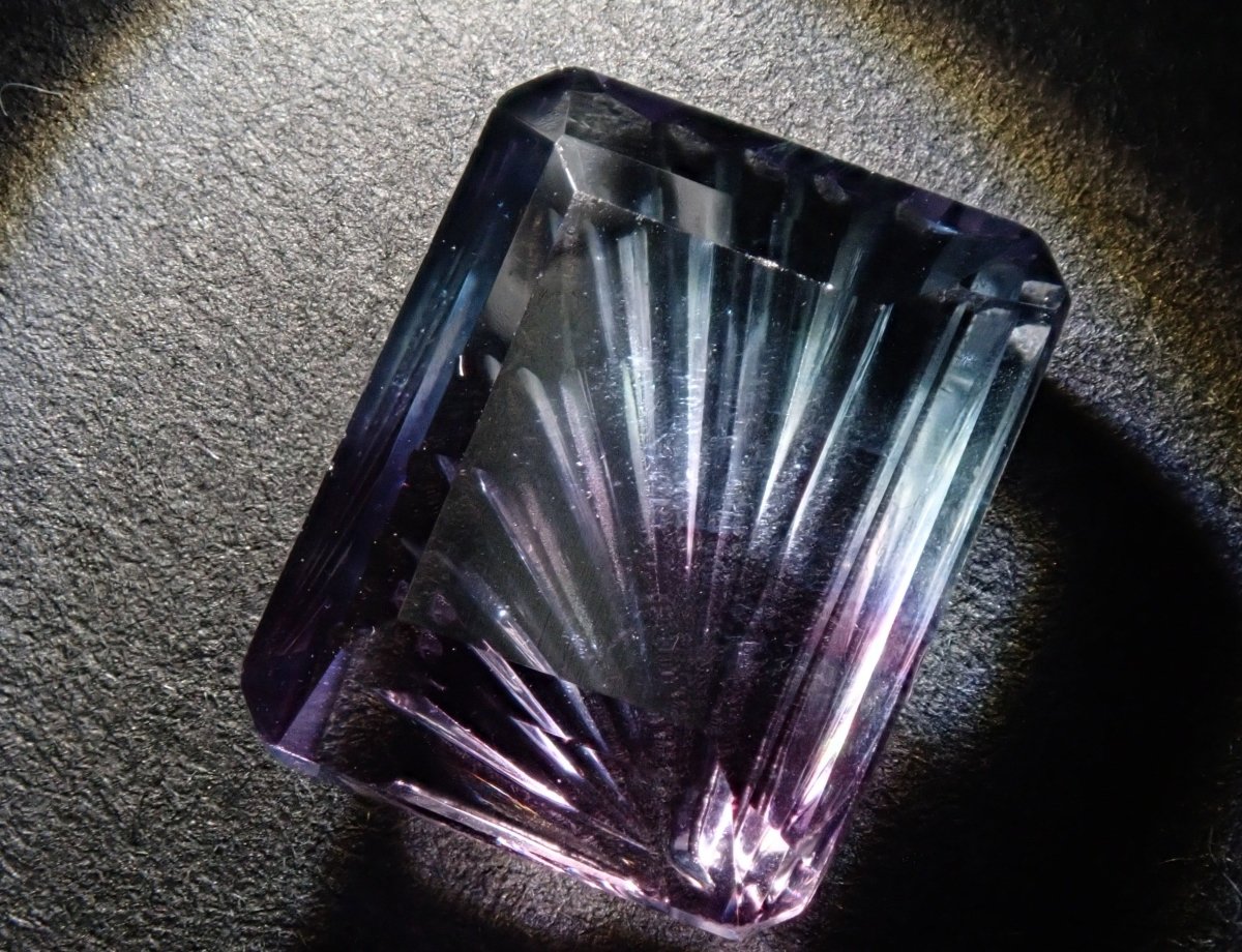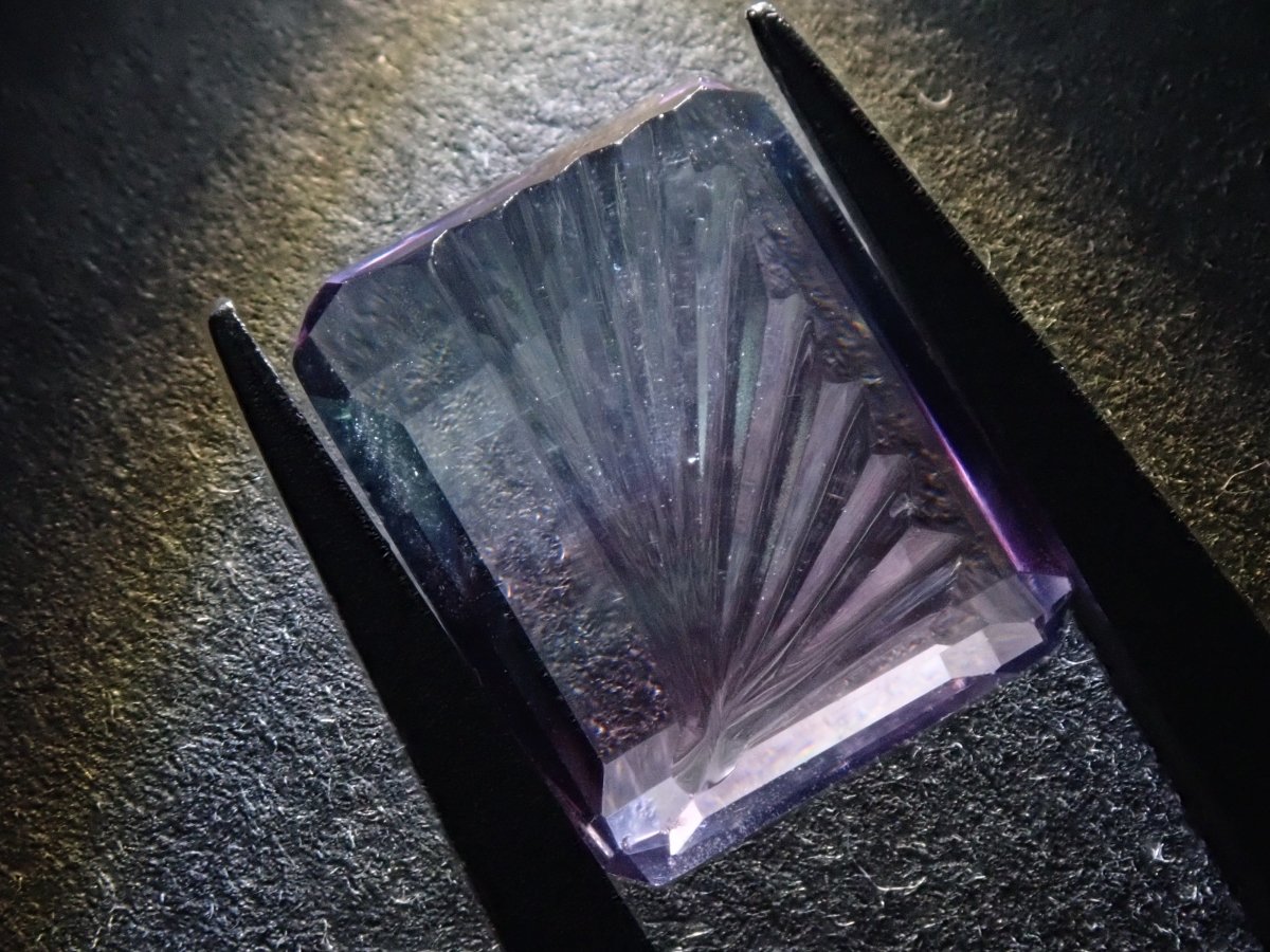 螢石因其豐富的色彩而深受收藏家的喜愛。這是一種雙色螢石。它的日文名稱是“Fluorite”,源自拉丁語,意為“熔化、流動”。據說,當這種寶石被強烈加熱時,它會發出淡藍色的光芒。我想試試看。