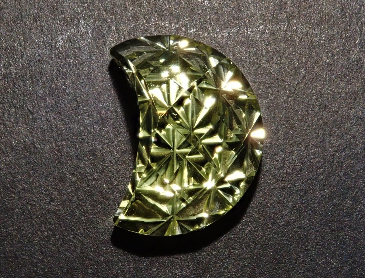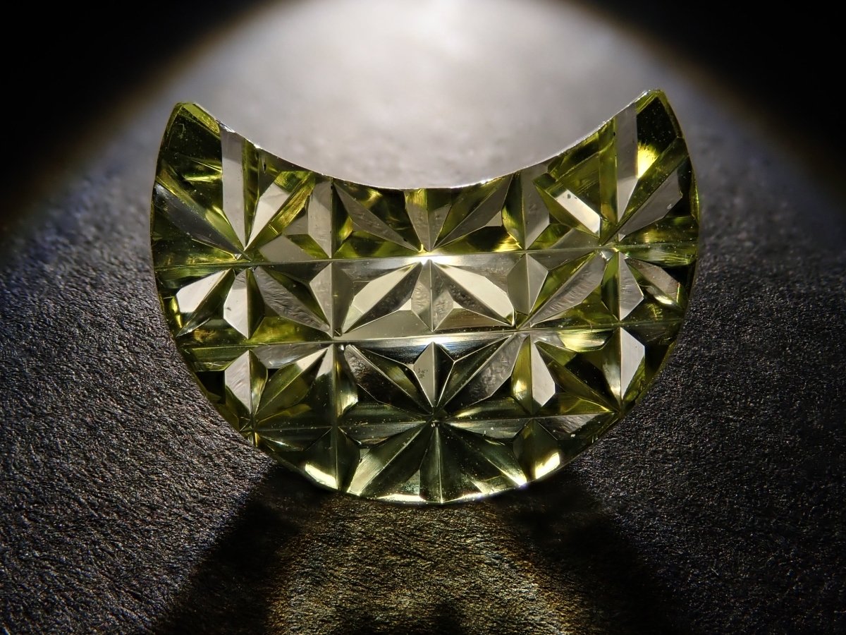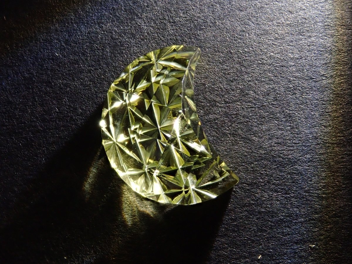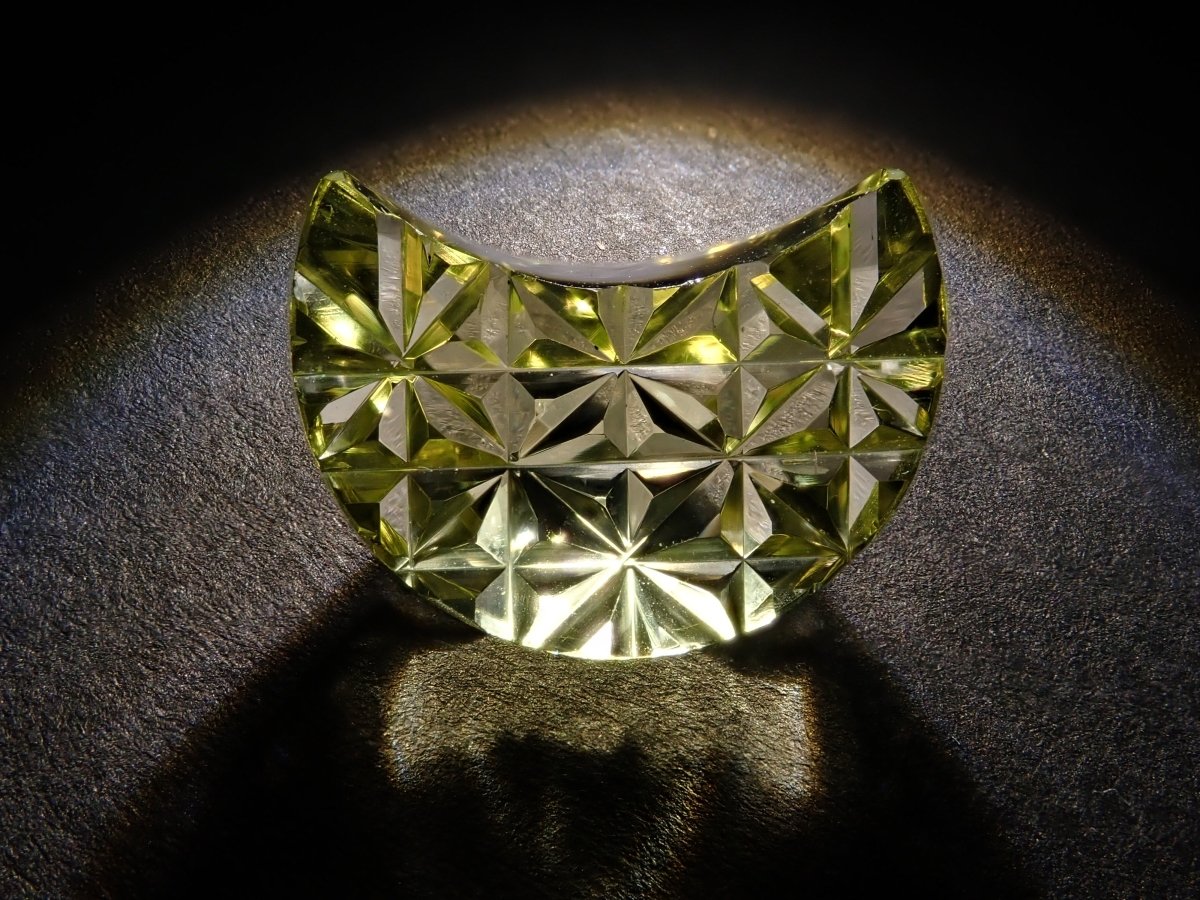 這是Koshu Kiseki Kiriko的新月形檸檬石英散件,是Shimizu Kiseki和Yoichi Fukasawa先生的合作作品。由清水奇蹟代表清水幸雄先生和Jewelry Craft Fukasawa代表深澤洋一先生兩位大師創作。 這是甲州寶石切割玻璃。清水先生負責刻面,深澤先生負責刻面。普通 x Aya 切割,尺寸為 12 x 9 毫米。