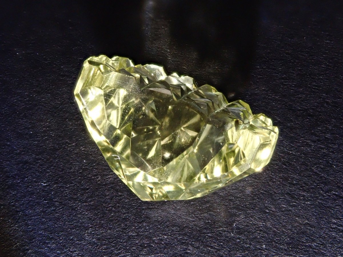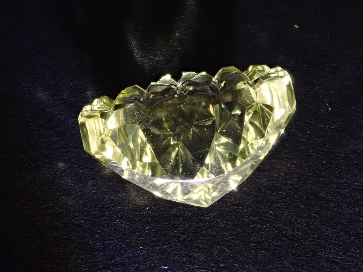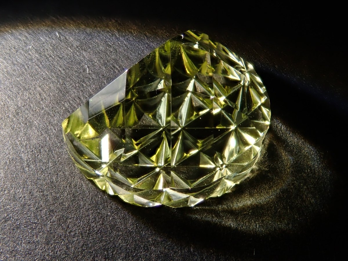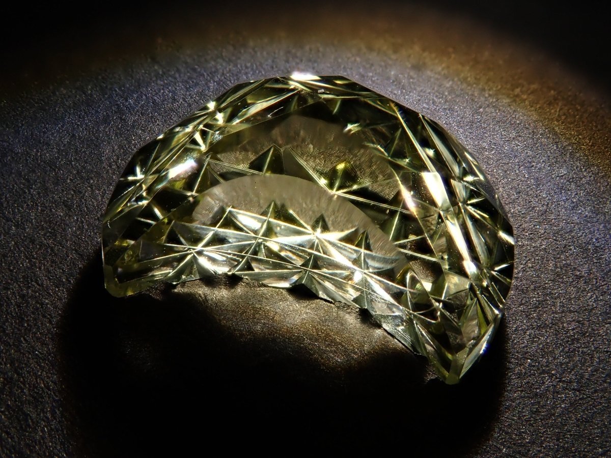 這是Koshu Kiseki Kiriko的新月形檸檬石英散件,是Shimizu Kiseki和Yoichi Fukasawa先生的合作作品。由清水奇蹟代表清水幸雄先生和Jewelry Craft Fukasawa代表深澤洋一先生兩位大師創作。 這是甲州寶石切割玻璃。清水先生負責刻面,深澤先生負責刻面。普通 x Aya 切割,尺寸為 12 x 9 毫米。