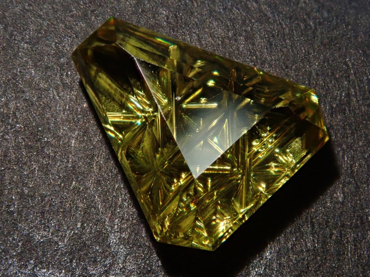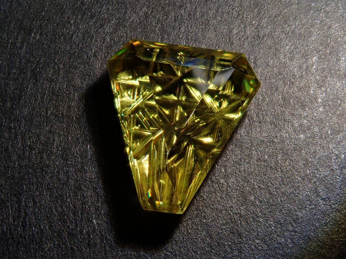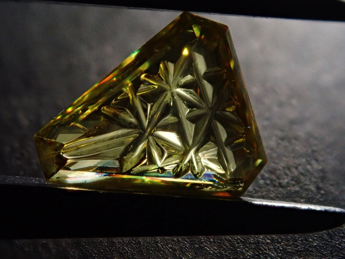 榍石散發著金色的光芒和絢麗的火彩。它是一種魅力十足的寶石,其火彩比鑽石更濃烈,越來越受到收藏家的青睞。榍石的光芒會隨著角度的變化而產生巨大的變化。不妨試試在陽光下用手掌滾動榍石,仔細觀察它。部分照片是用筆型手電筒拍攝的。