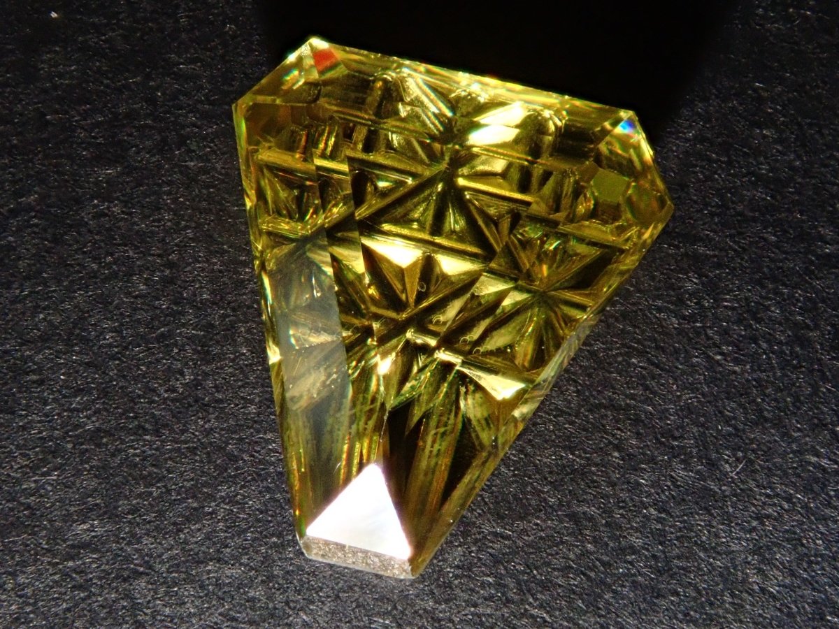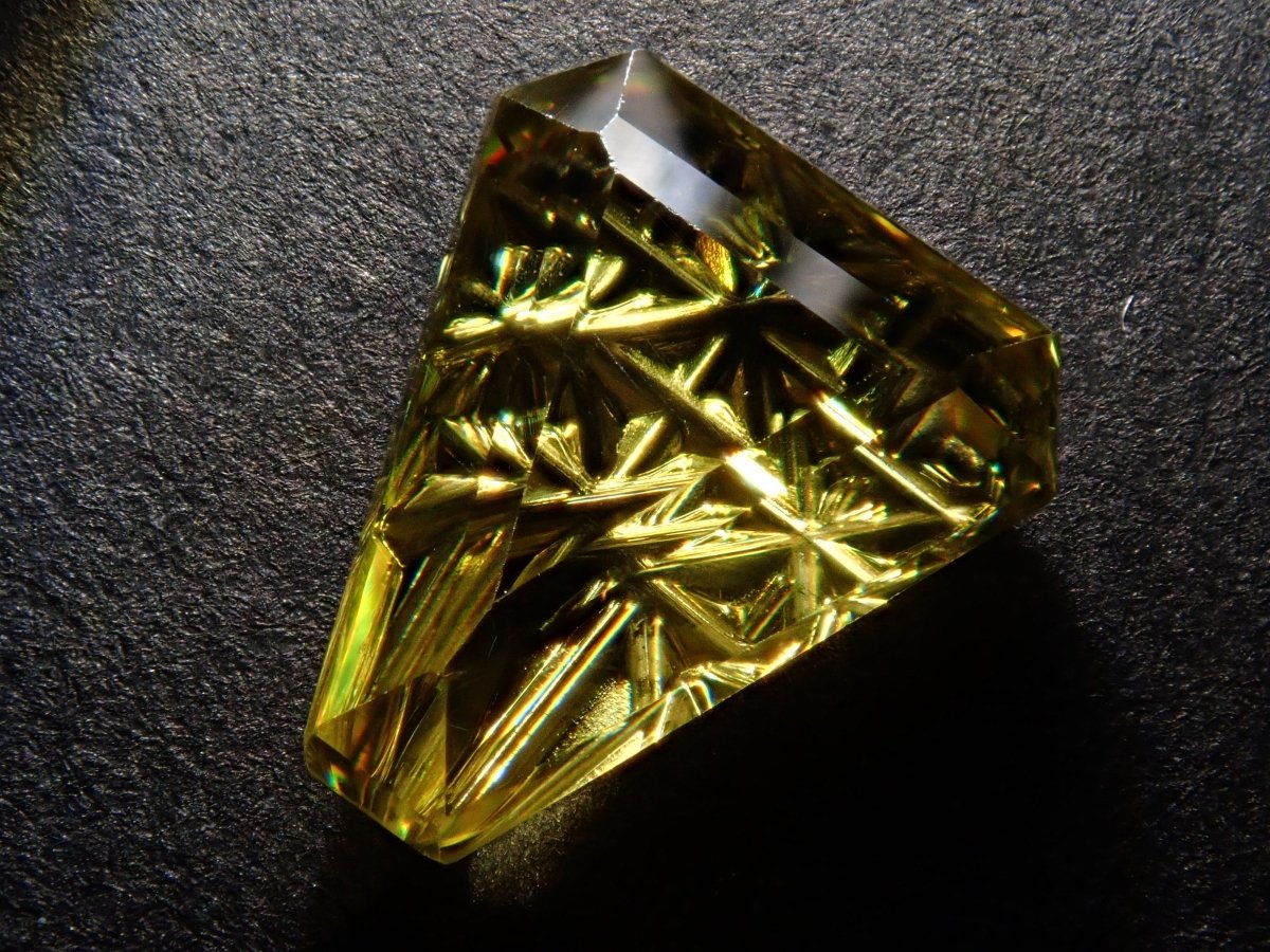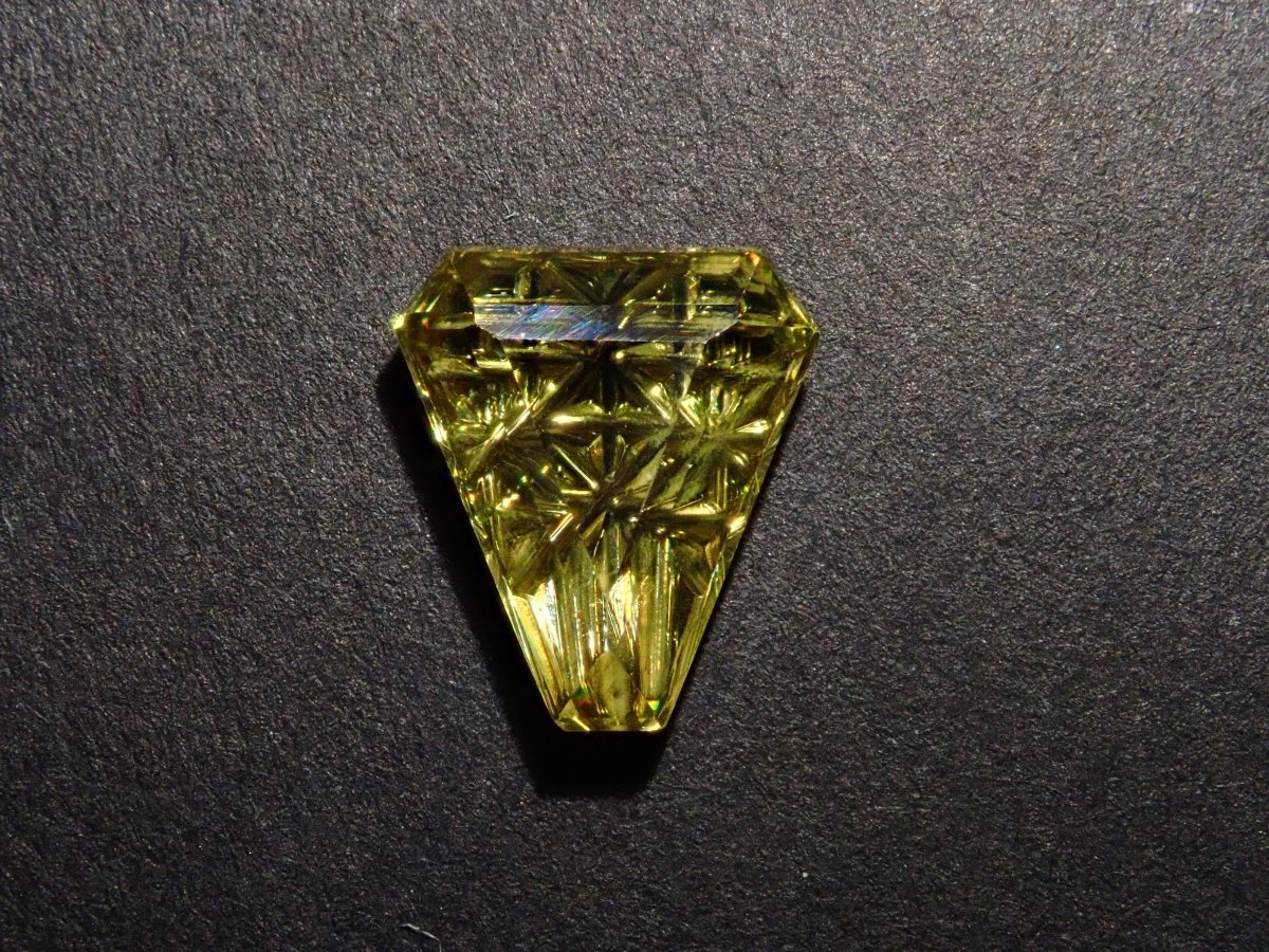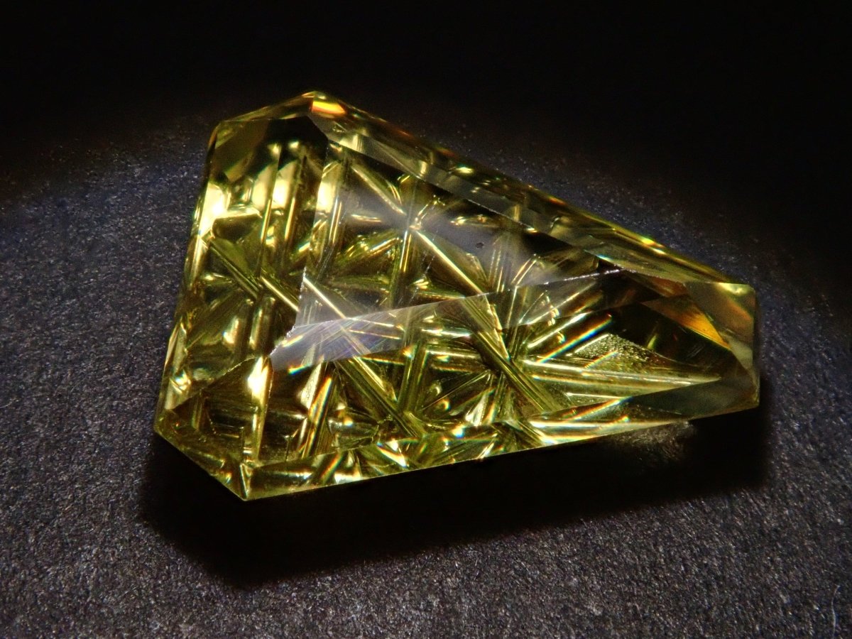 榍石散發著金色的光芒和絢麗的火彩。它是一種魅力十足的寶石,其火彩比鑽石更濃烈,越來越受到收藏家的青睞。榍石的光芒會隨著角度的變化而產生巨大的變化。不妨試試在陽光下用手掌滾動榍石,仔細觀察它。部分照片是用筆型手電筒拍攝的。