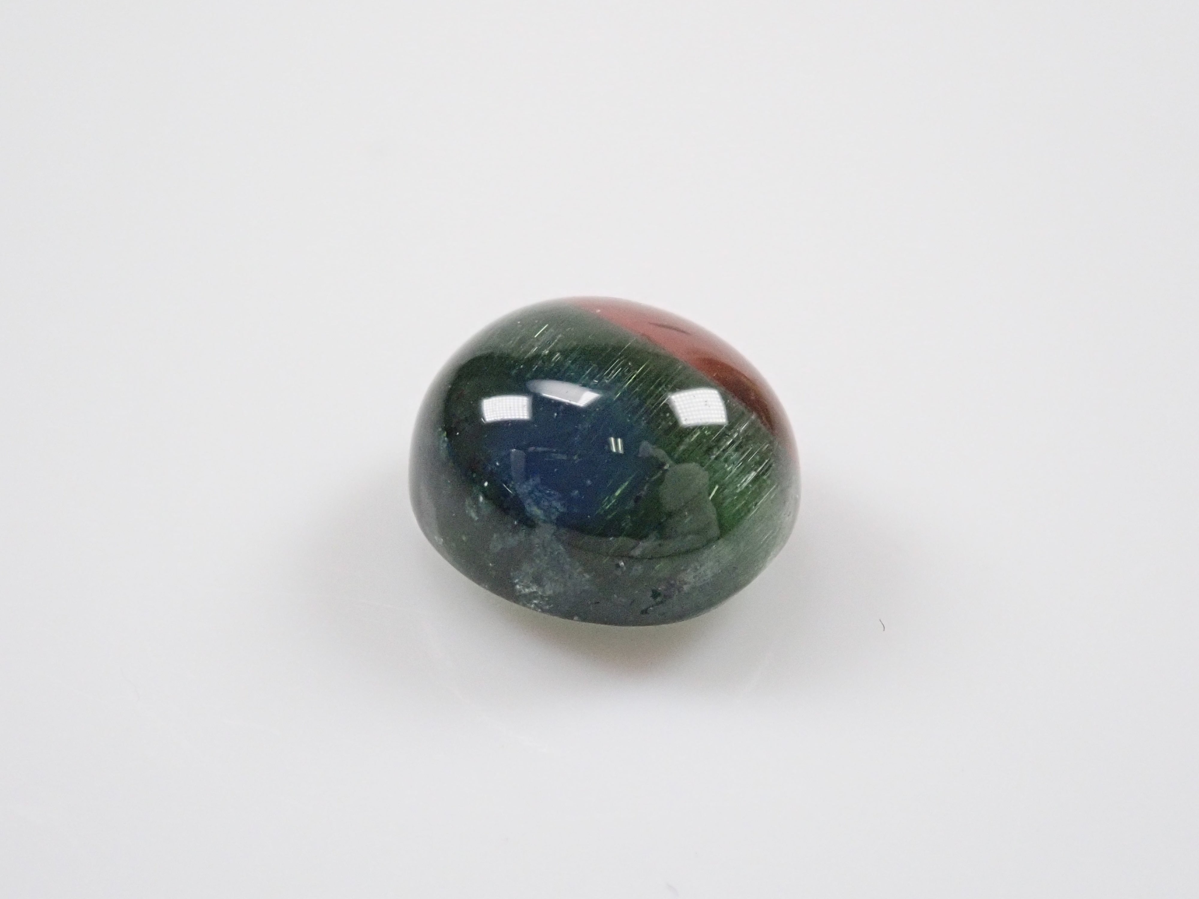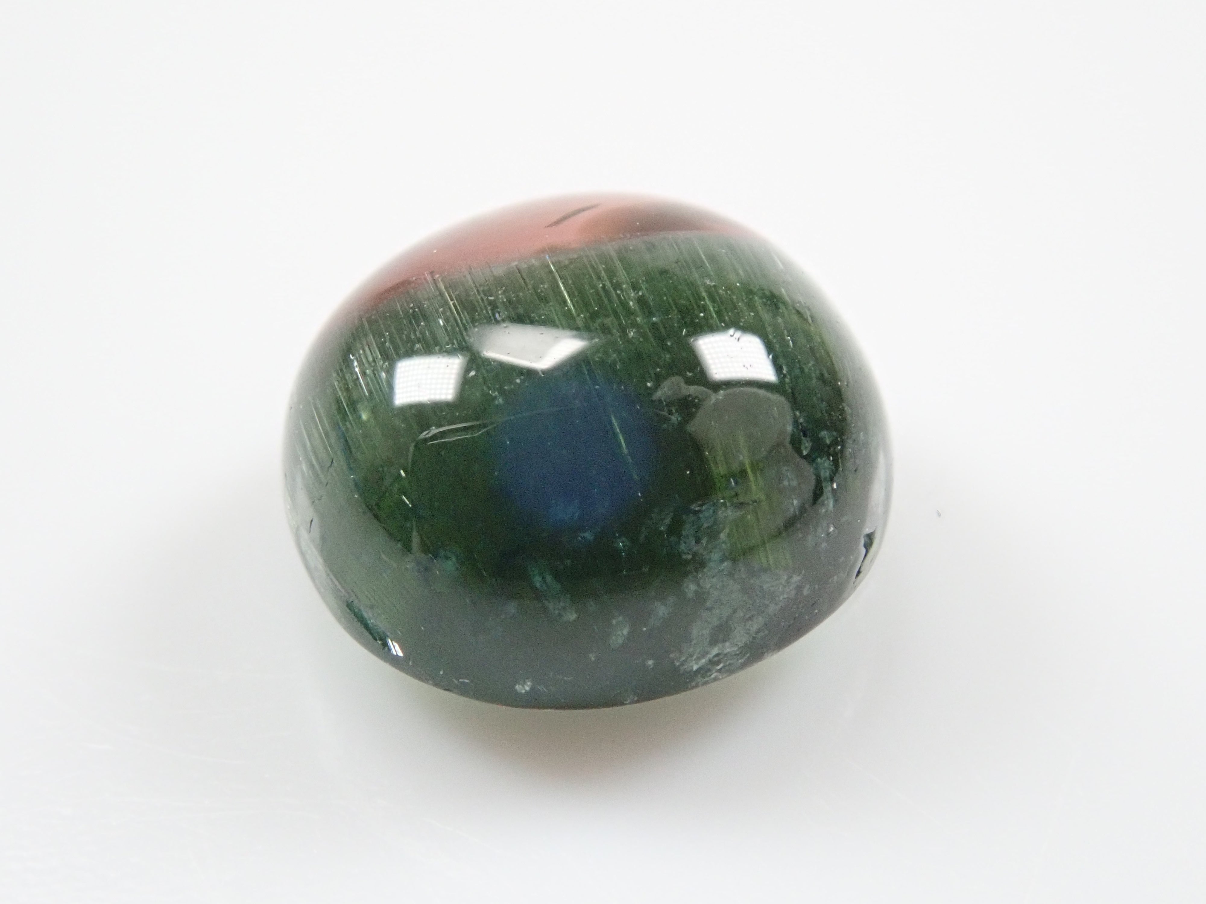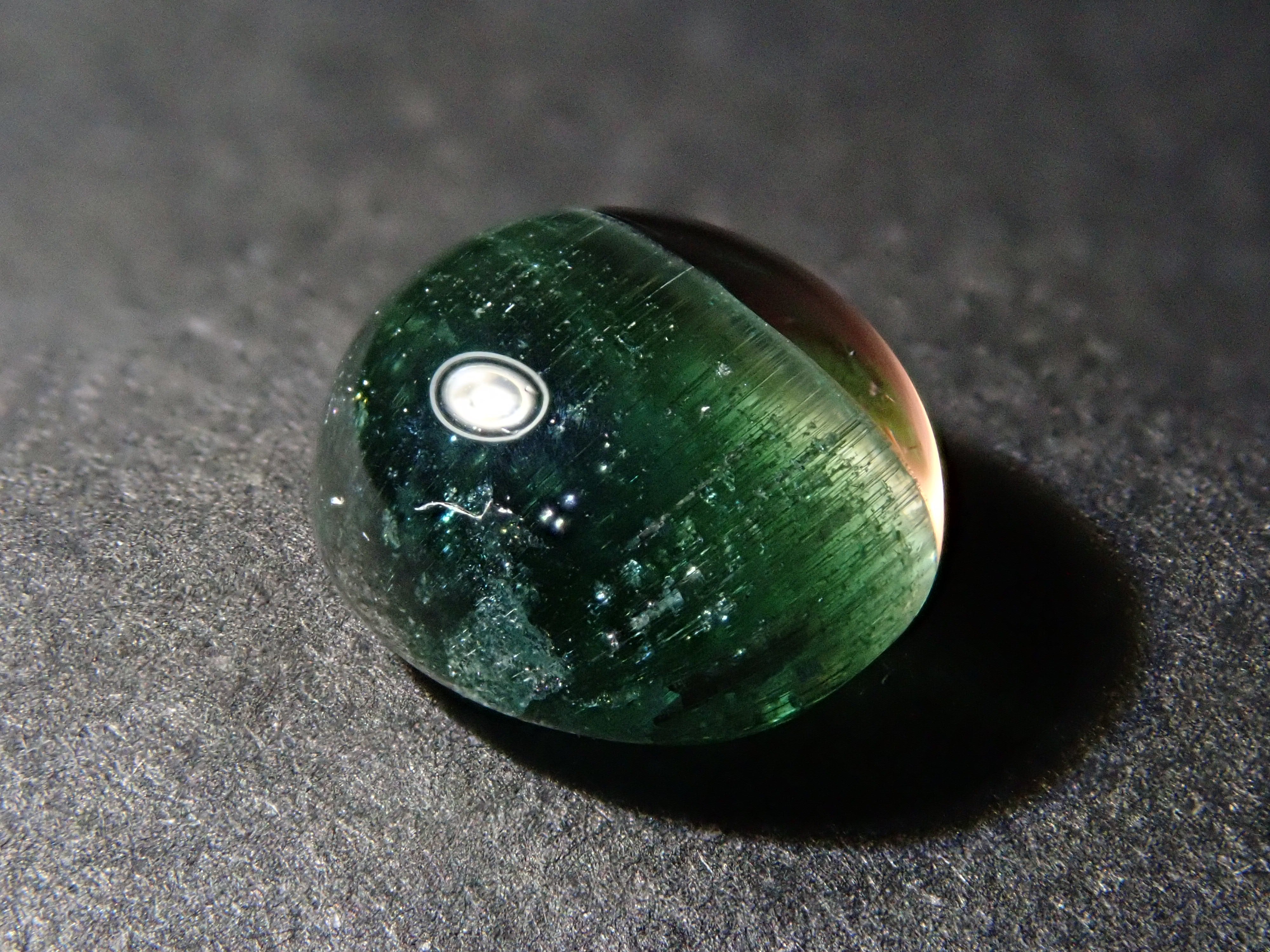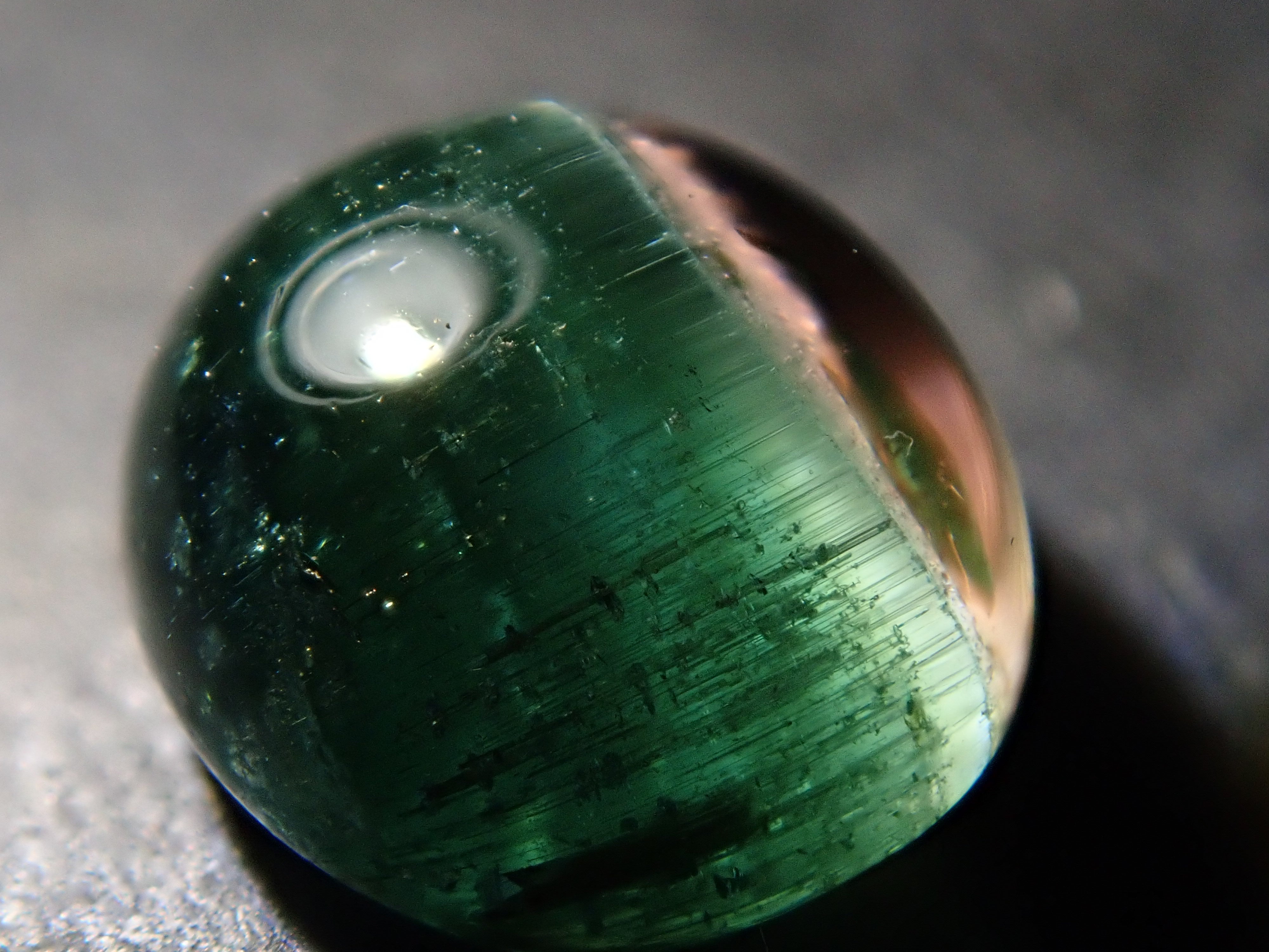 碧璽被稱為色彩寶庫。它有無數豐富的顏色,包括粉紅色、紅色、藍色、綠色、靛藍、橙色、紫色、黑色和棕色。在這種類型中,您可以在一顆寶石中看到兩種顏色並具有貓眼效果。筆燈用於攝影。石頭的背面基本上是未拋光的。