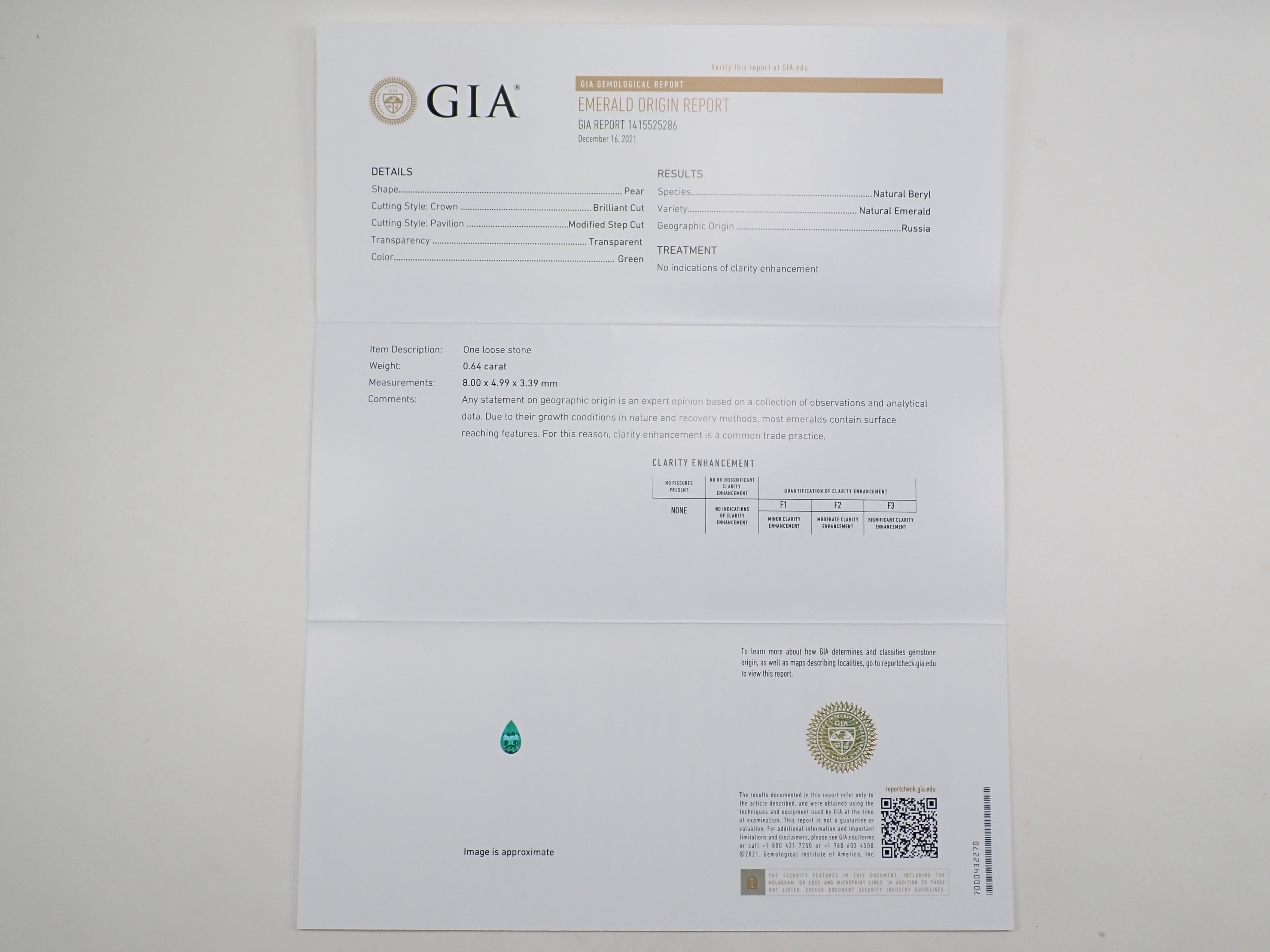 祖母綠通常會用澄清劑浸漬,但這是一種罕見的無油祖母綠,未經這種處理。這是來自俄羅斯的非石油祖母綠,在日本很少見到。它是一種高品質無油祖母綠,尺寸達 0.6 克拉,具有特有的柔和綠色,內含物極少。隨附 GIA 真品證書。