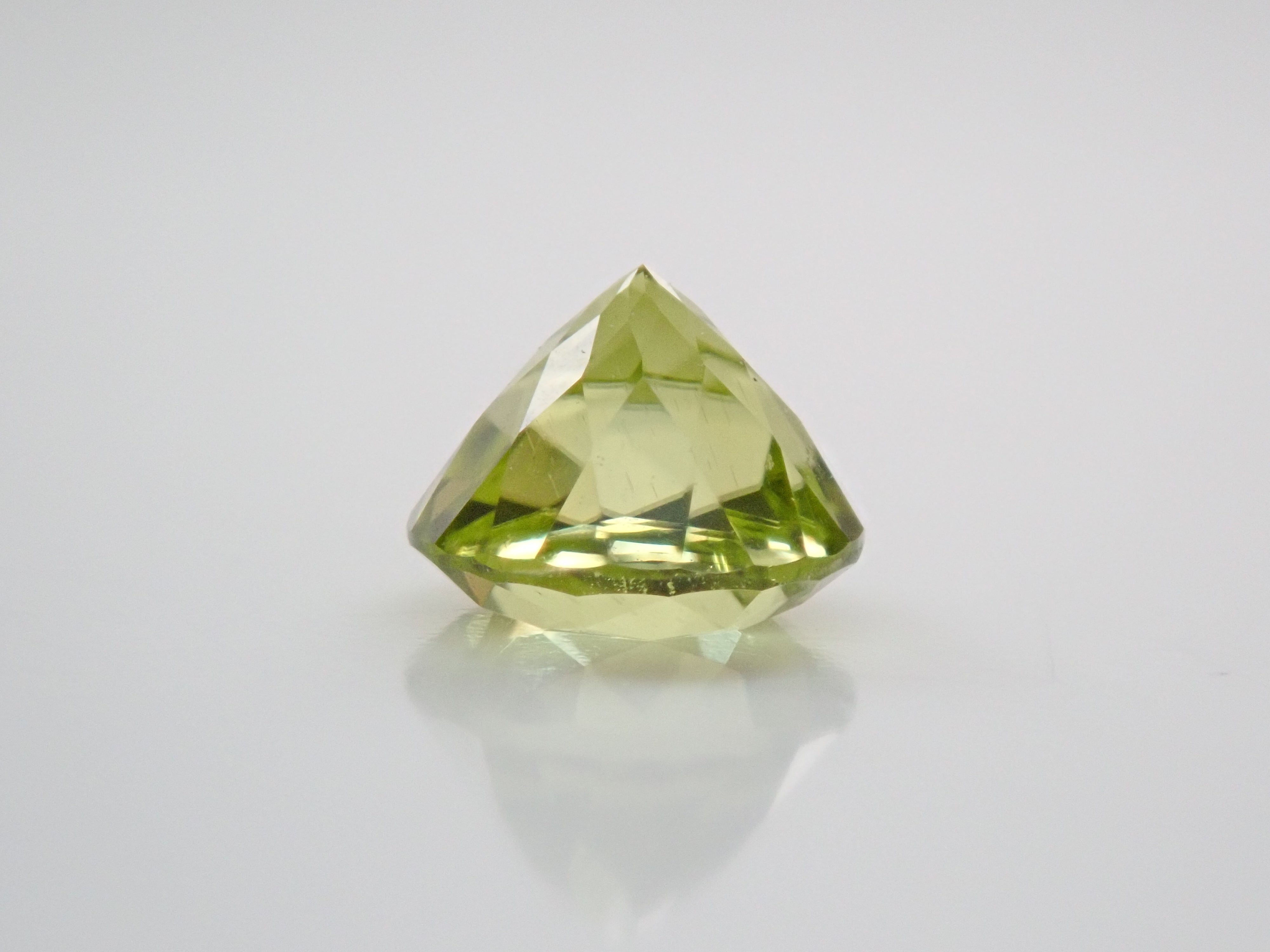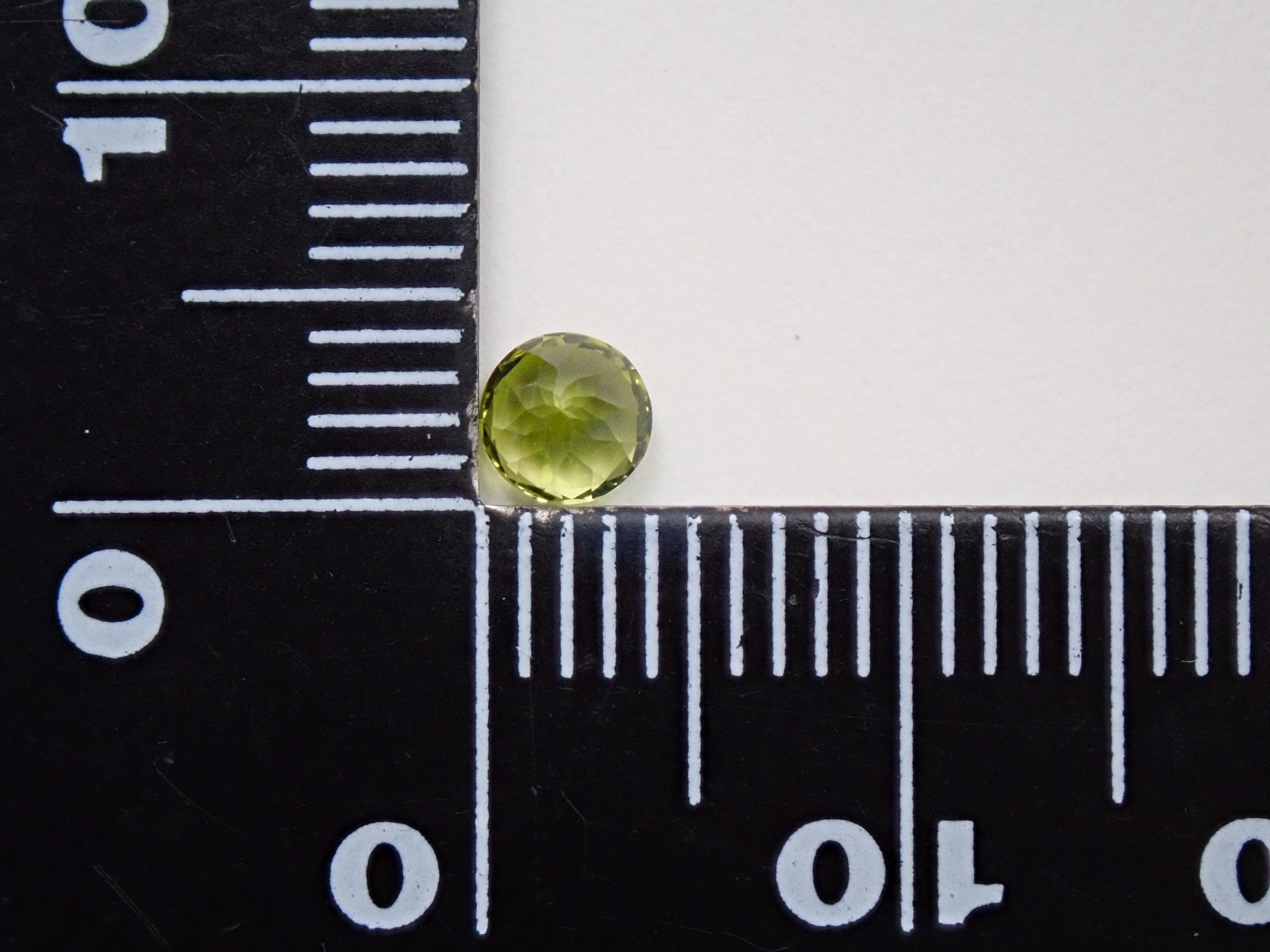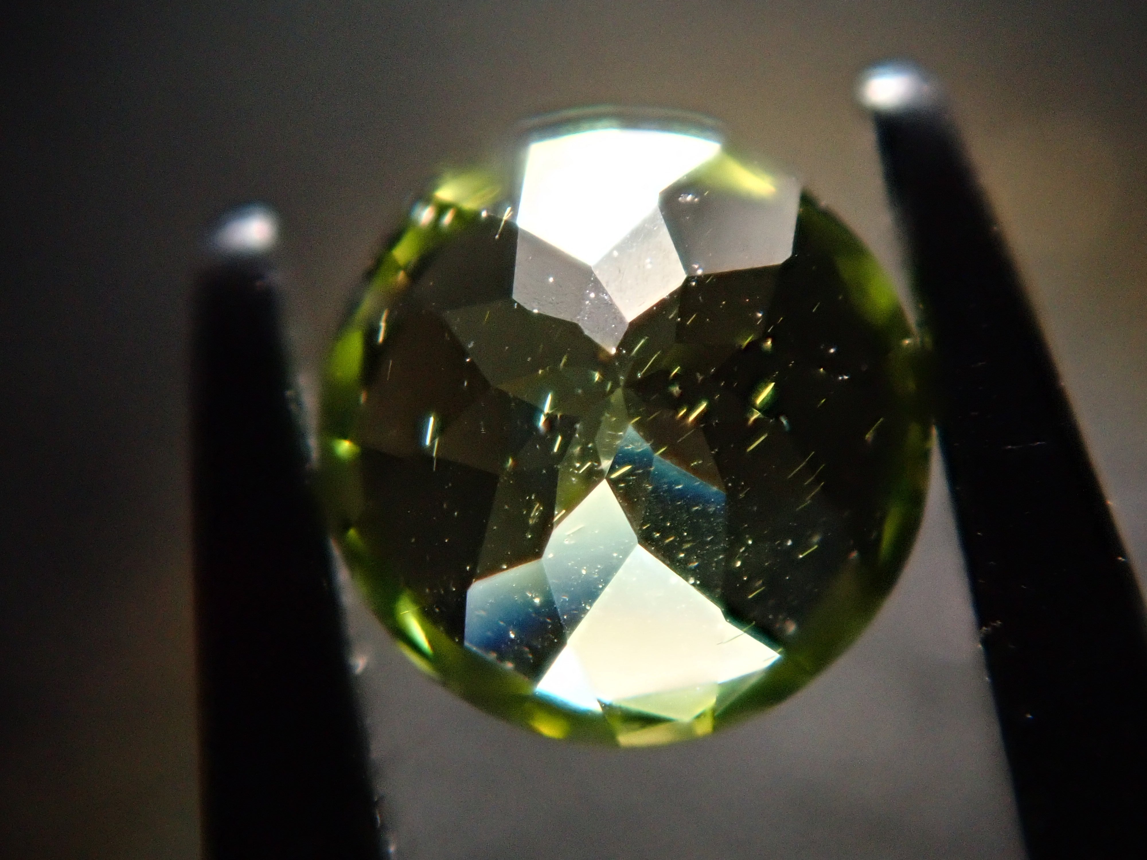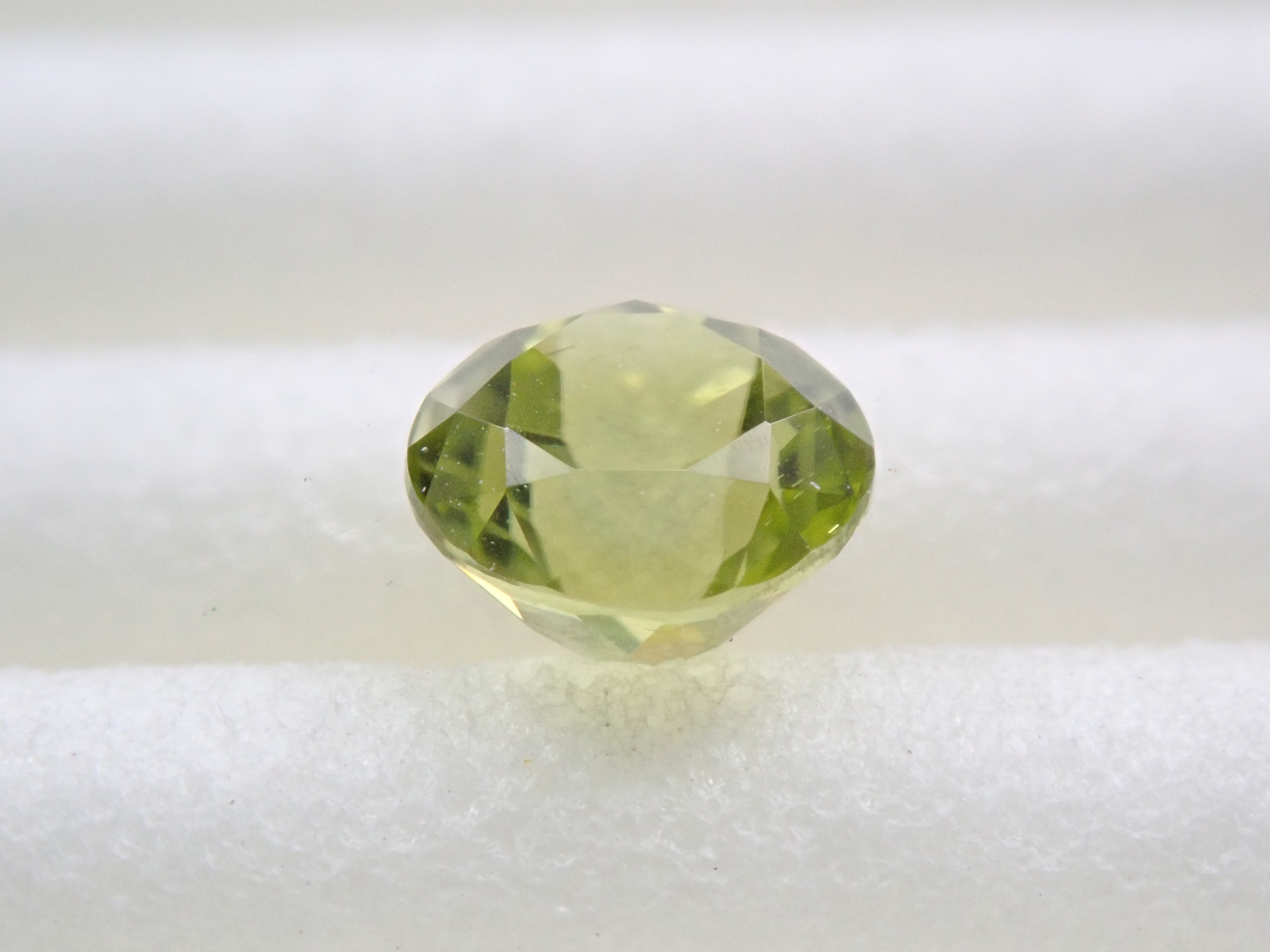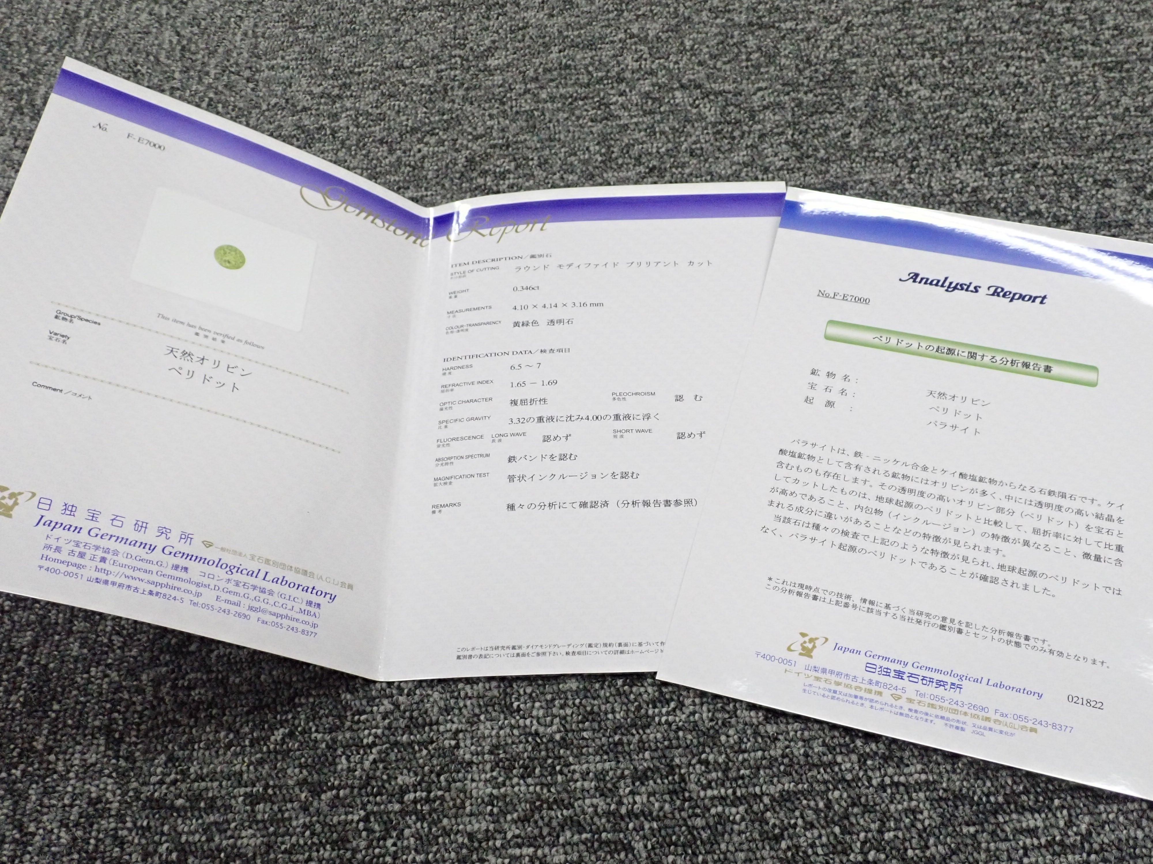 這是由西班牙熟練工匠 Dio 先生切割的寄生橄欖石。它透明度高,圓形切割尺寸大,達 0.346 克拉。剪裁很棒,品質也很高。附有日德寶石研究所頒發的鑑定證書。 SNS上也引起了迴響平列橄欖石。