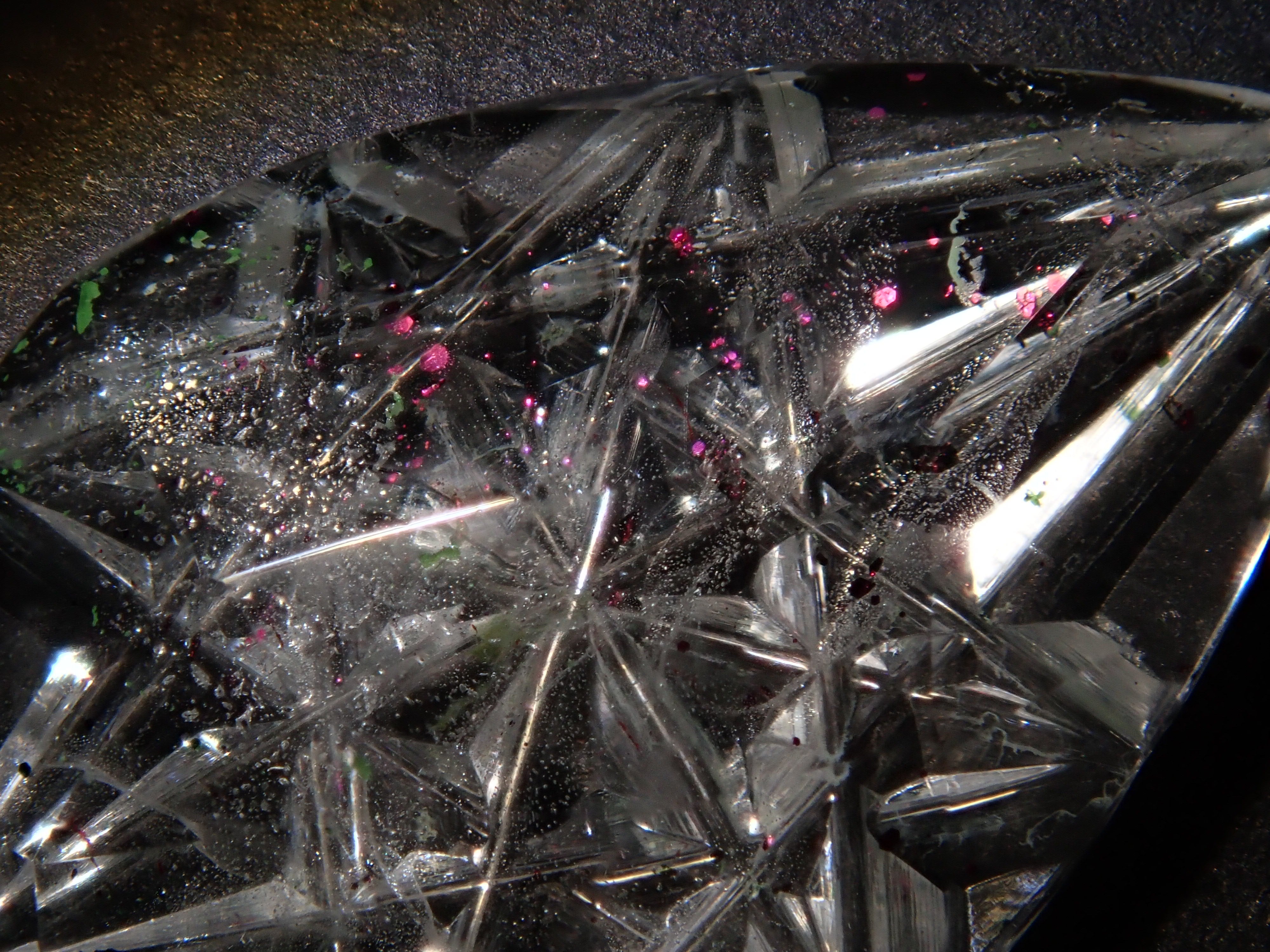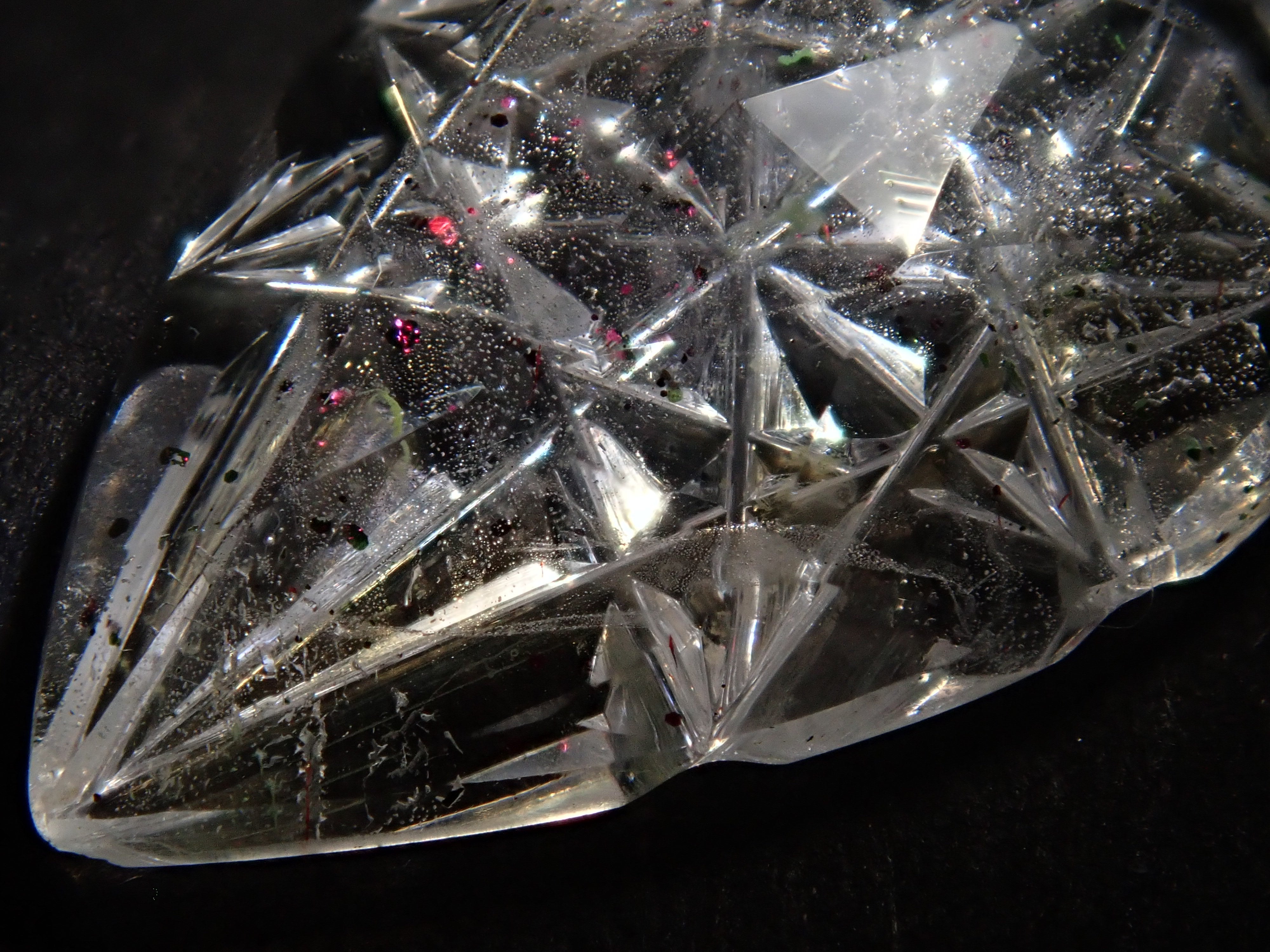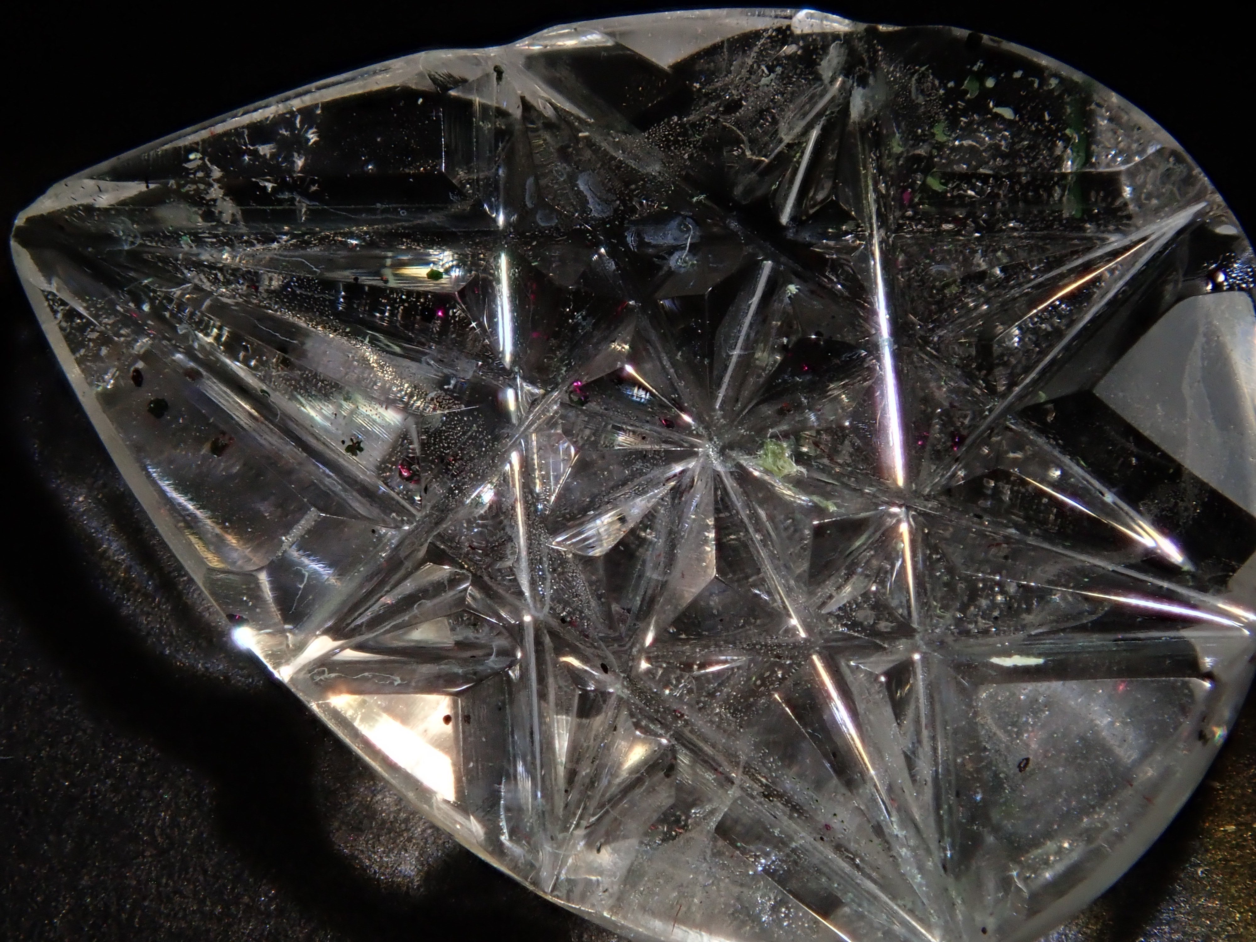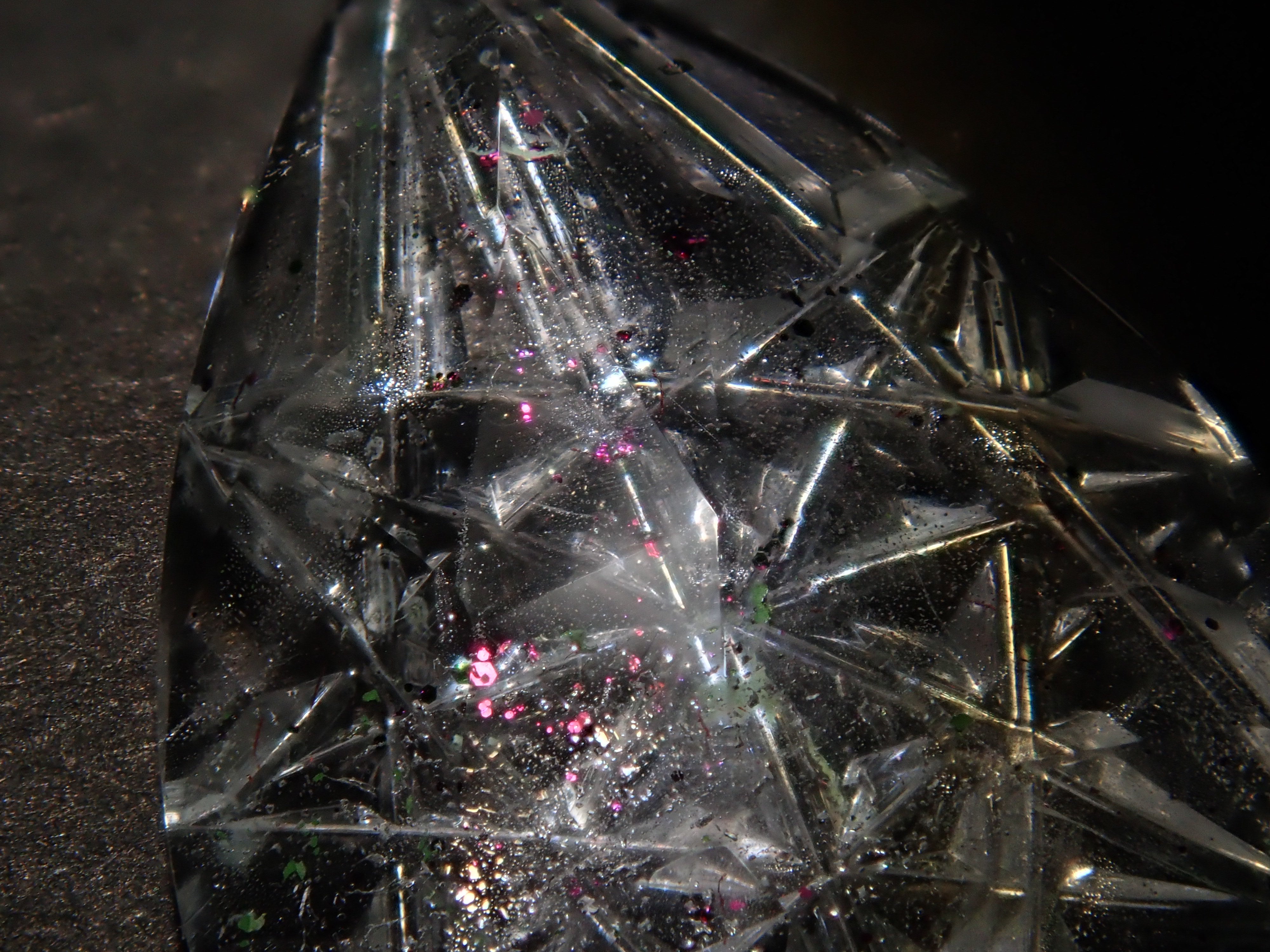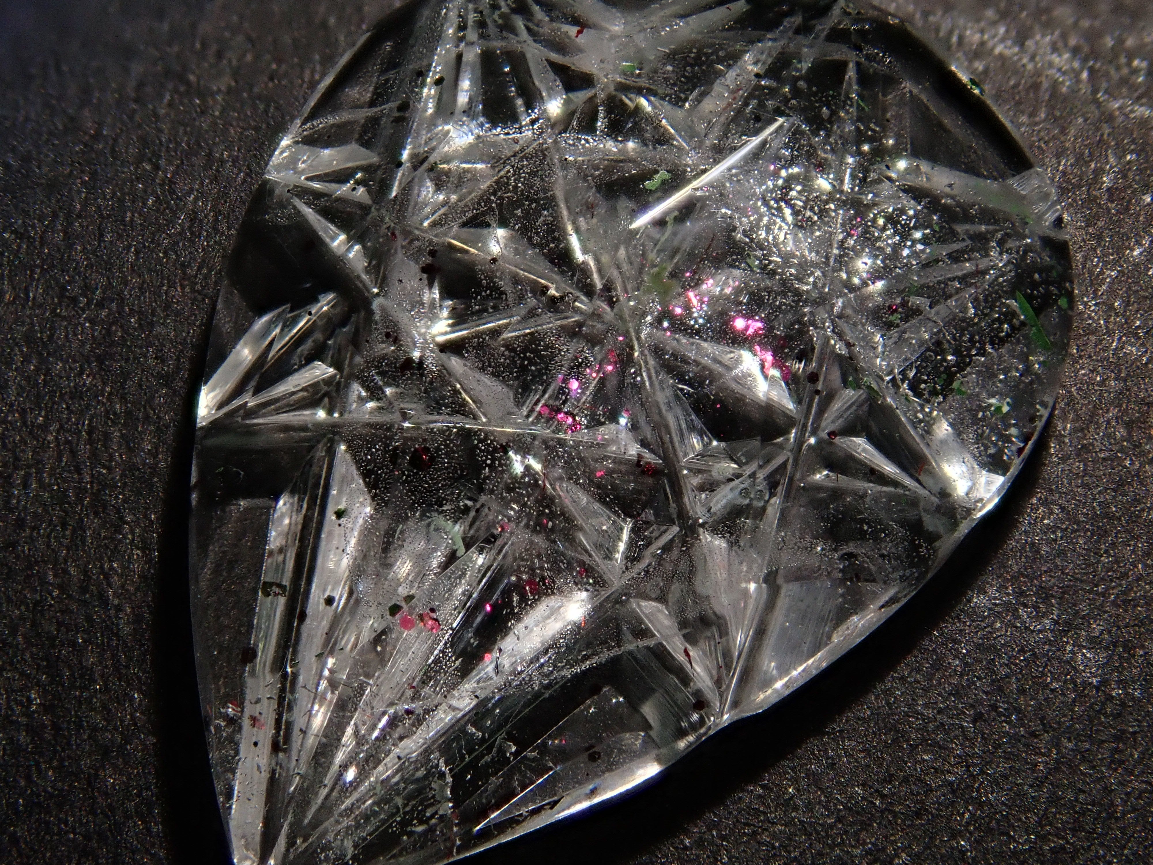 石英,日文稱為“水晶”,在日本是一種常見的寶石,但它也是一種深奧的寶石,擁有眾多種類,包括紫水晶和黃水晶。這種形狀像紅色花瓣的水晶被稱為「小叮噹石英」或「粉紅火石英」。照片是用筆形電筒拍攝的,以便清晰地顯示內部內含物的狀態。